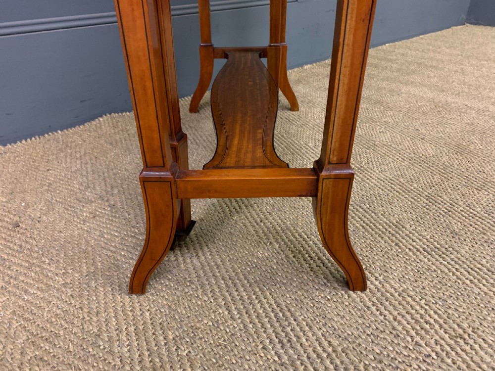 A beautiful Edwardian period inlaid satinwood Sutherland table. Of "Butterfly" shape and very well constructed in solid satinwood with attractive satinwood veneers. Inlaid with stringing throughout , with further cross banding to the top and sides. Bearing original makers marks to the underside. Offered for sale in excellent condition with a very good colour and patina.