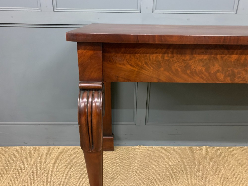 A large and impressive mahogany serving table from the late Regency period. Over 6ft long and very well constructed in solid mahogany with attractive flame mahogany veneers. The rectangular top sitting over a pair of asymmetrical drawers to the freeze. All standing on bold scrolling front legs with carved detailing to the knees and feet. Would serve well as a serving, console or hall table. Offered for sale in excellent condition, with a good colour and patina, ready to go straight into the home. Dimensions: Width 183cms Depth 63cms Height 93cms Internal Ref: 18127