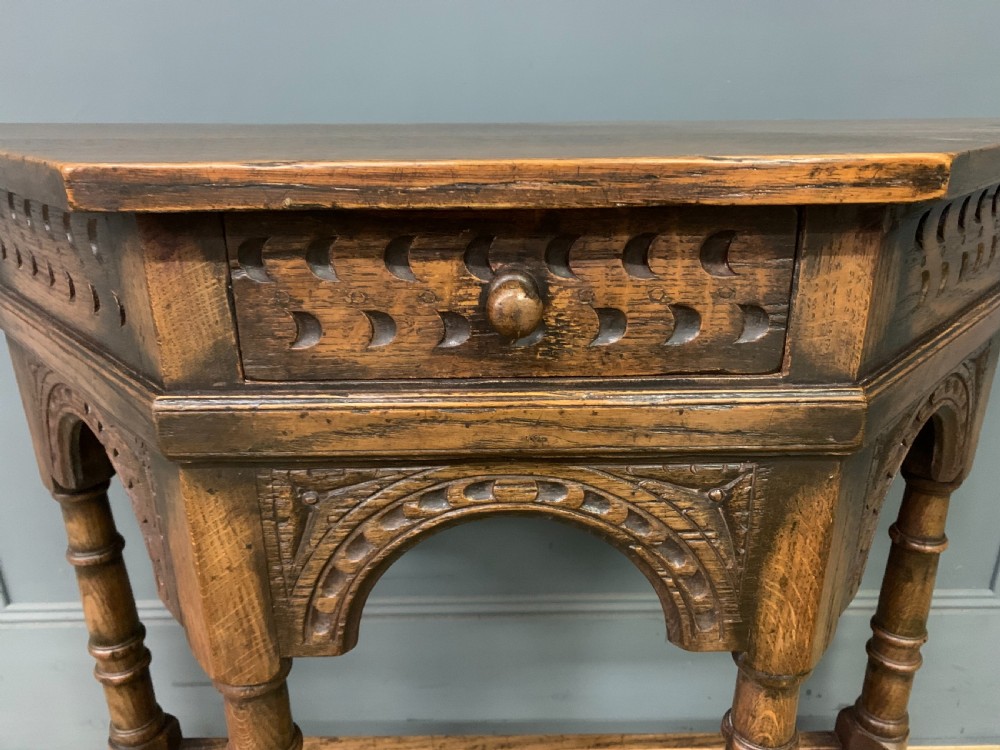 A charming Ipswich oak side, or credence, table. Of very good construction in solid English oak. now with a mellow colour and patina. With a single drawer to the front. Cleaned and waxed and polished in our workshops and now offered for sale in excellent condition. This versatile table would fit into many different room scenarios within the modern home. Dimensions: Width 84cms Depth 33cms Height 71.5cms Internal Ref: 18211
