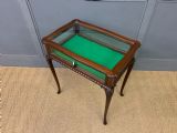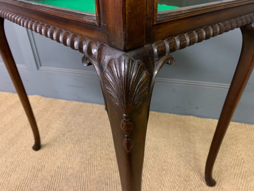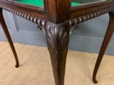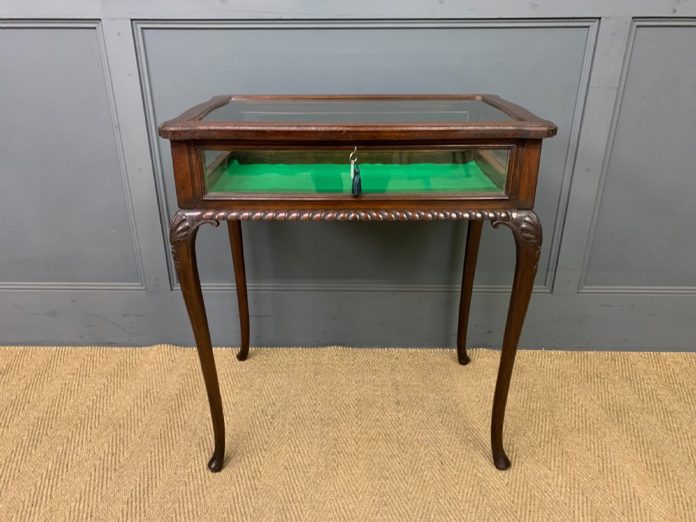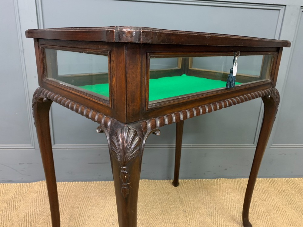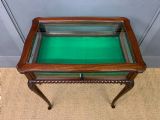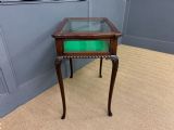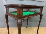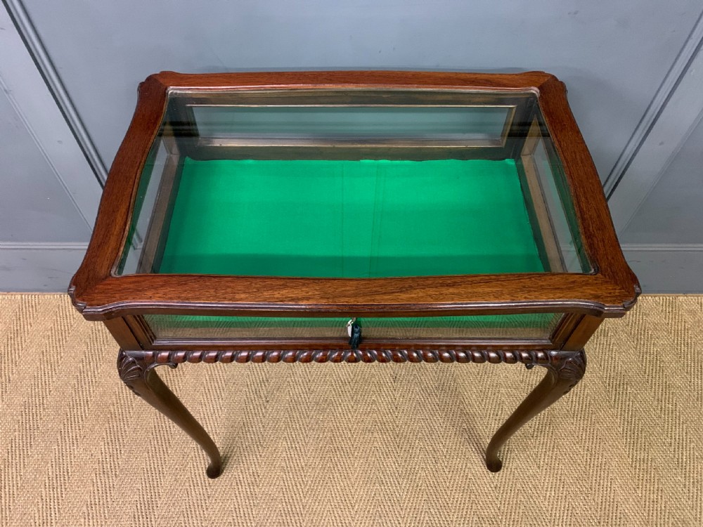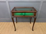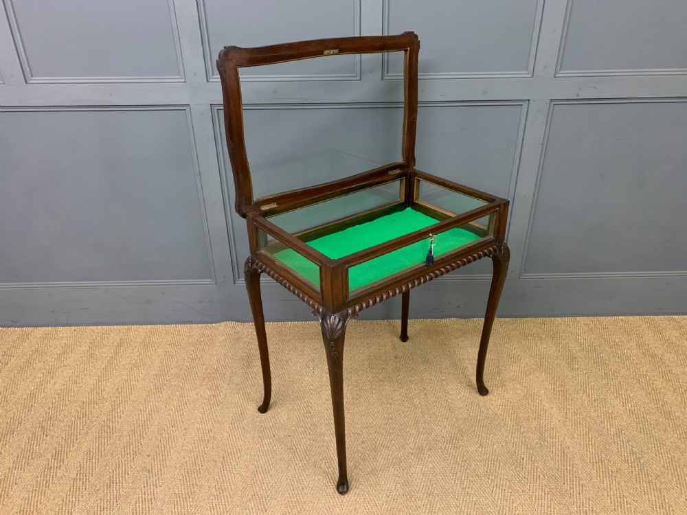 A good late Victorian period mahogany bijouterie table. Well constructed in solid mahogany, in the Chippendale style. The hinged lid (lockable, key supplied) opens to access a lined display space. All standing on elegant cabriole legs. Cleaned and waxed in our workshops and now offered for sale in excellent condition, ready to go straight into the home.