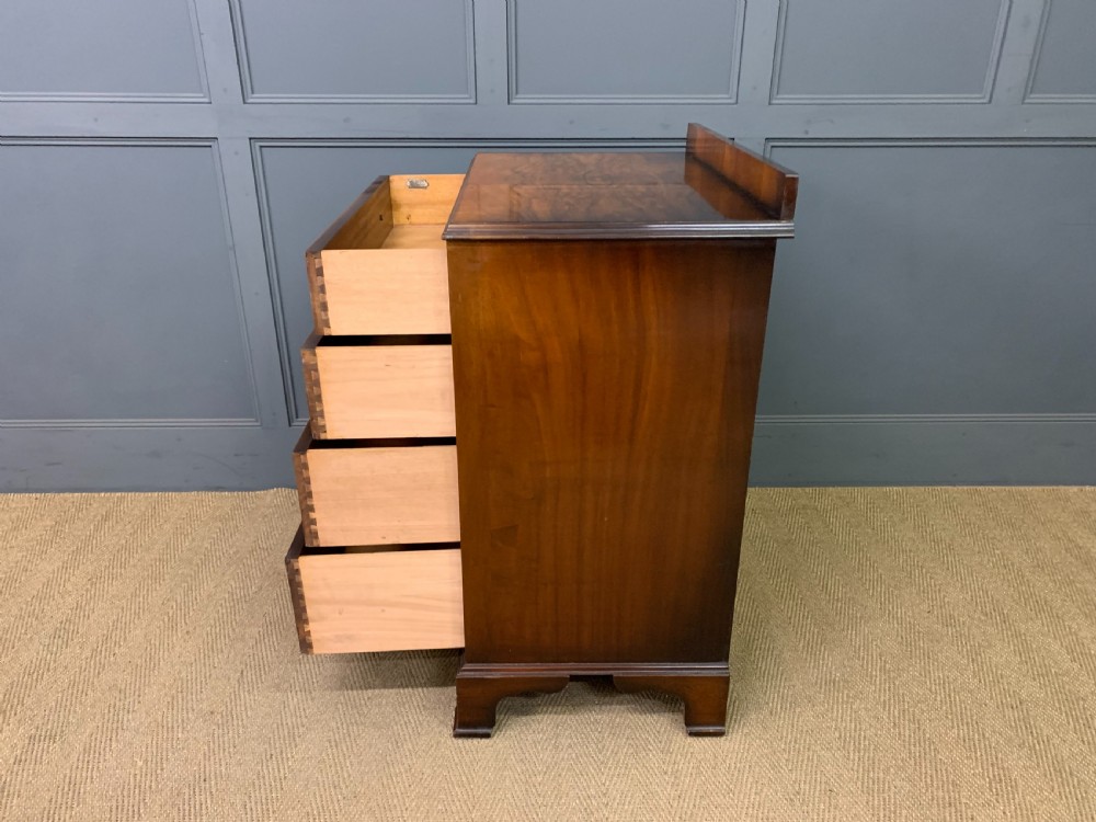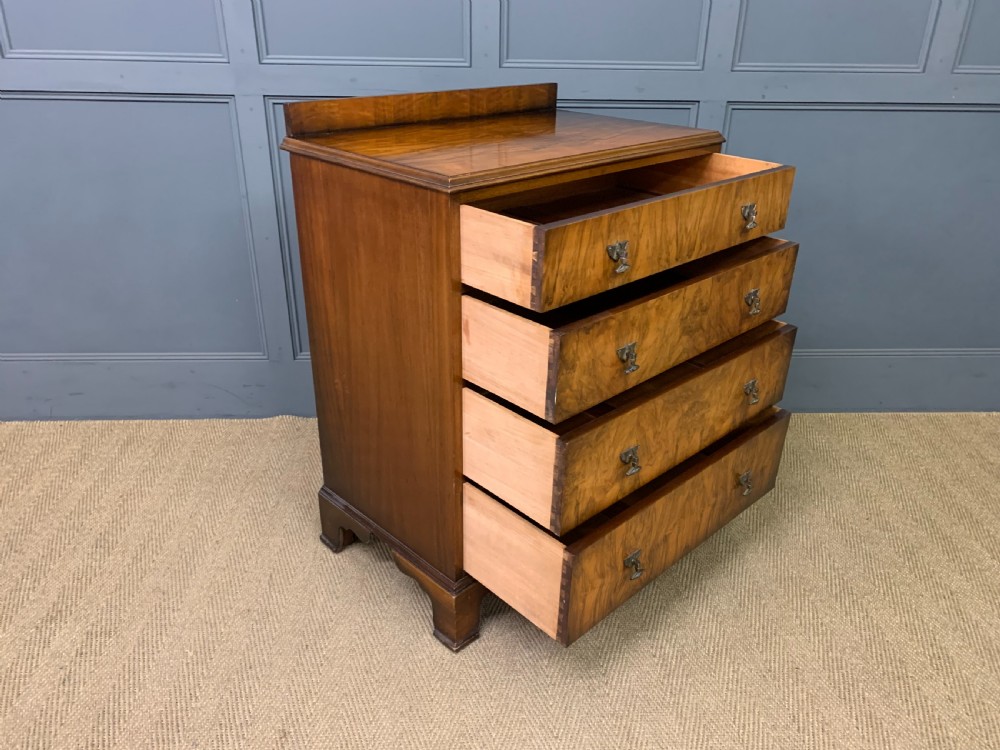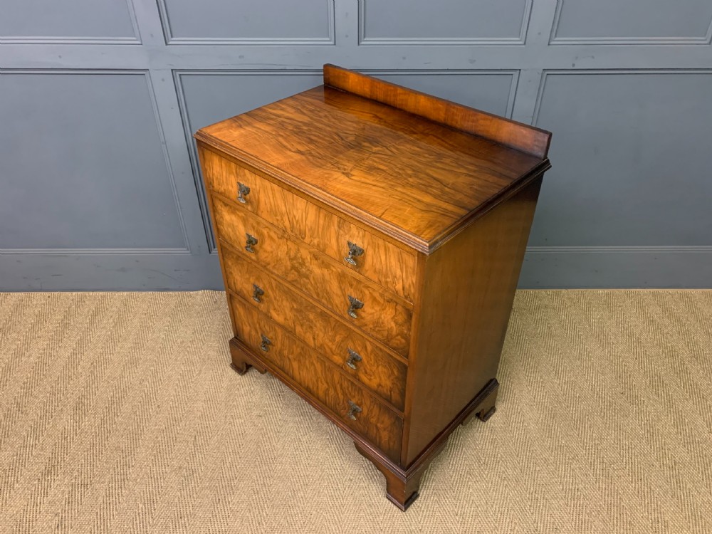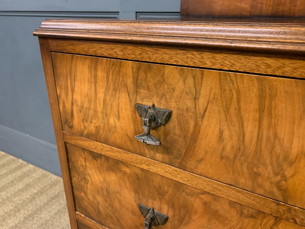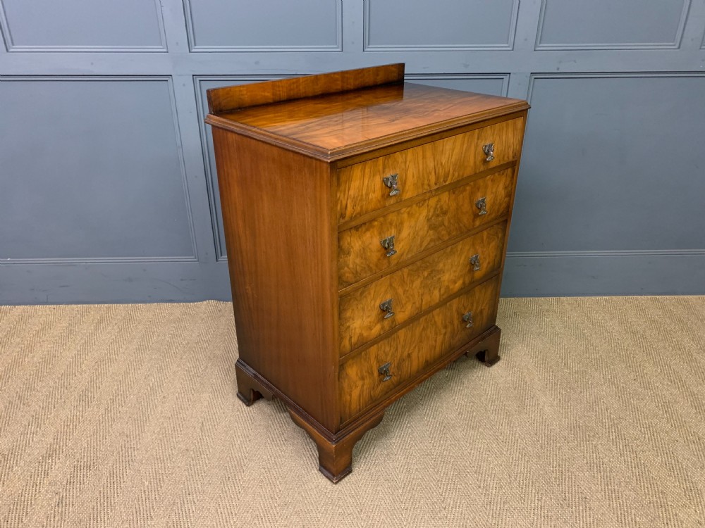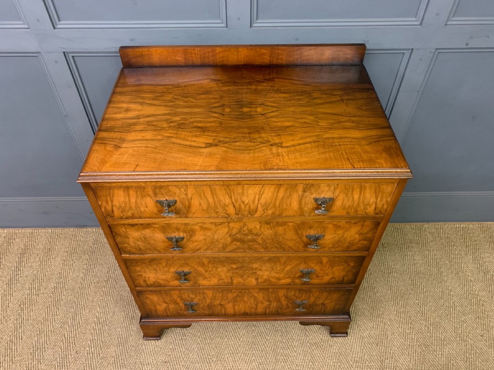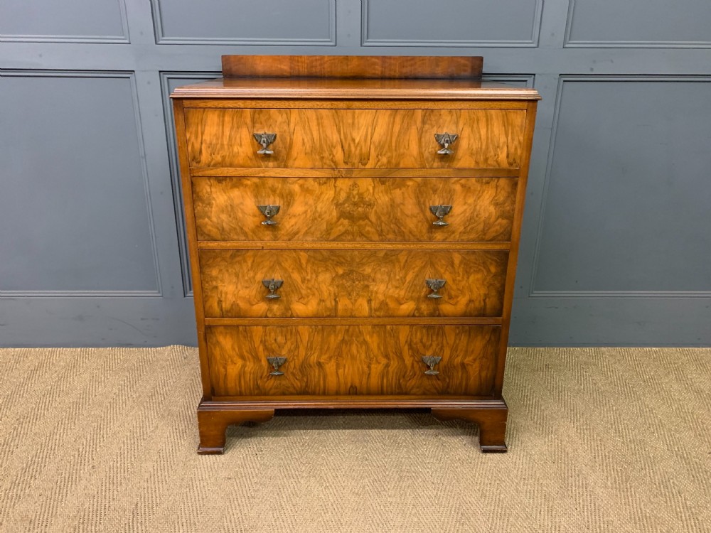 A stylish Art Deco period burr walnut chest of drawers by Waring and Gillow. With attractive burr walnut veneers and lovely original handles. With a series of 4 long graduated drawers , an upstand and standing on ogee bracket feet. Cleaned and waxed in our workshops and now offered for sale in excellent condition, with a good colour, ready to go straight into the home.