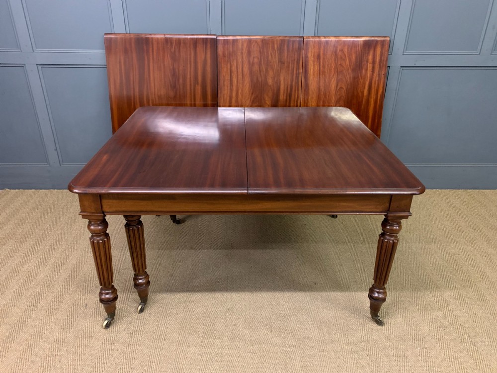A splendid George IV period mahogany dining table in the manner of Gillows of Lancaster. Of excellent construction in solid Cuban mahogany and of a good length (10ft) , seating up to 12 people. It has a pull-out action and will accommodate 3 leaves when fully extended. All standing on charming turned and reeded legs which terminate in their original brass castors. Sympathetically repolished in our workshops and now offerred for sale in superb condition, with a great depth of colour and finish.