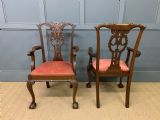 A very good pair of mahogany Chippendale style armchairs from the Edwardian period. Well constructed in solid mahogany and each with an upholstered "drop-in" seat. Decorated with profusely carved detailing throughout including characteristic ball and claw feet and splendid ornate back-splats. Cleaned and waxed in our workshops and now offered for sale in excellent condition, with a good colour and patina.
