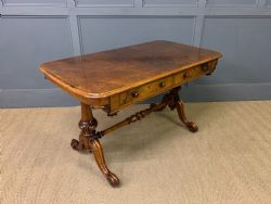 A handsome mahogany side table from the George IV period. Very well constructed and standing well on lovely turned , reeded legs, which terminate in their original castors. With an arrangement of 3 drawers ftted with nice solid brass handles. The top surrounded by a 3/4 gallery. This table would work well within in a number of different room scenarios within the modern home; side table, lamp table, hall table or even desk. Sympathetically repolished within our workshops and now offered for sale in excellent condition. With a good colour and patina and ready to go straight into the home.
