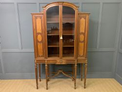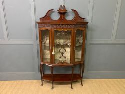 A fine quality Edwardian period inlaid mahogany corner cabinet , most probably made by Edwards & Roberts of London. Tall and elegant and of excellent construction in solid mahogany and attractive fiddle-back mahogany veneers. Inlaid throught out with harebells, swags and urns in satinwood and boxwood. Of serpentine fronted form and surmounted by a swan neck pediment. The upper glazed door opens to access a shelved and lined interior. This sits over a pair of cupboard doors. All doors are lockable (key supplied). All standinhg on elegant out-swept legs, united by an under-tier. Cleaned and waxed in our workshops and now offered for sale in very good original condition. Splits into 2 sections for ease of installation. Dimensions: Width 77cms Depth 49cms Height 213cms Internal Ref: 18280