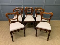 A nice set of 4 late Victorian period dining chairs in solid walnut. Of good construction, strong and sturdy and free from wobbles. With carved detailing to the back rails and standing on ring turned legs. Well upholstered (a few very minor marks) and offered for sale in very good condition.