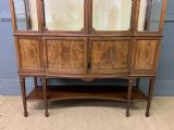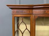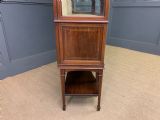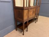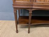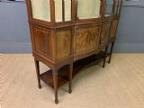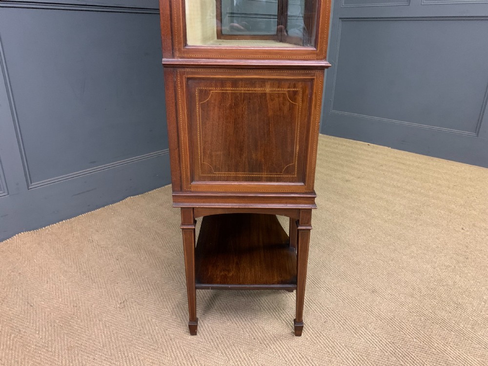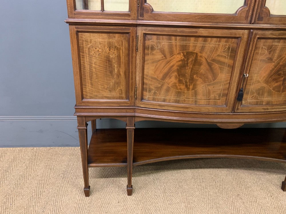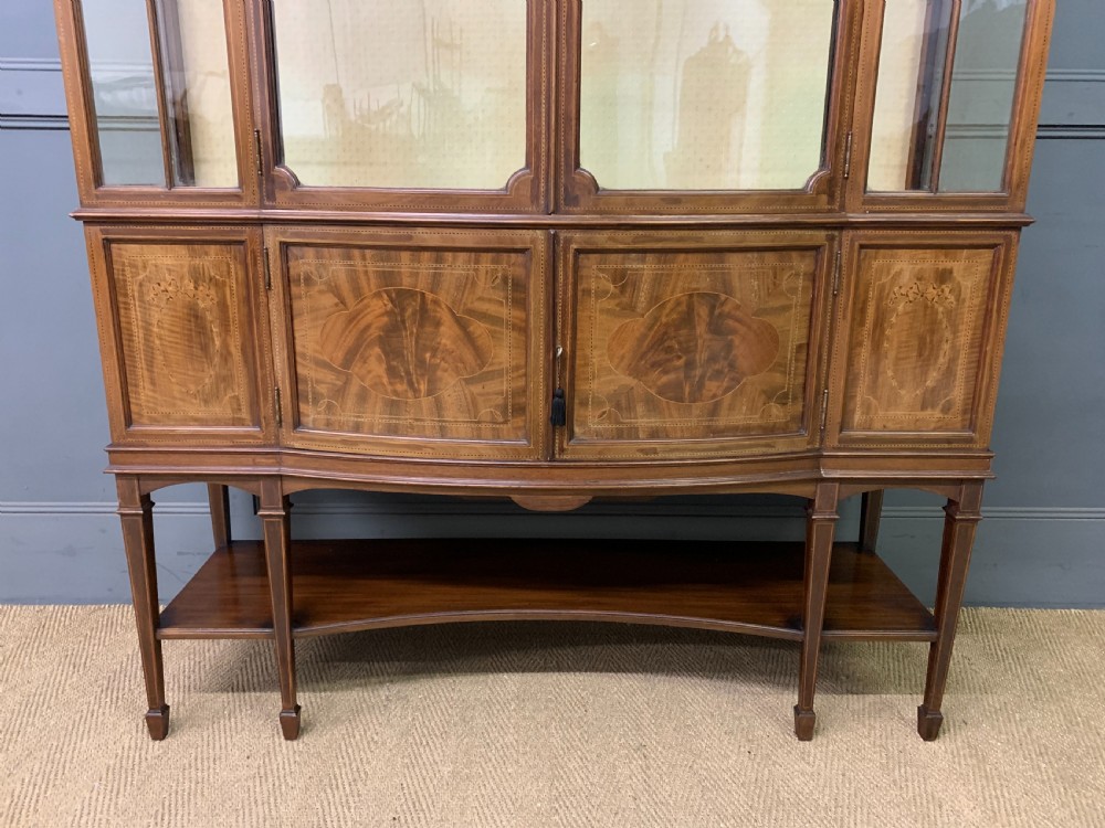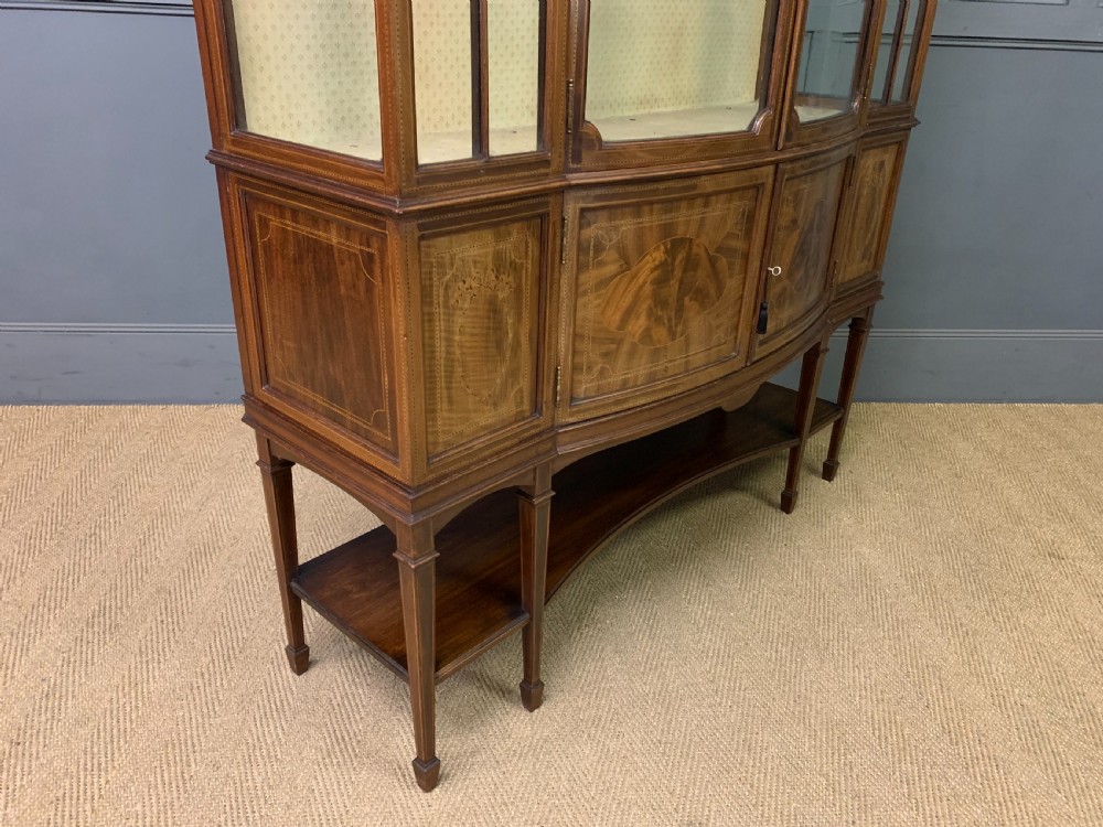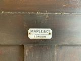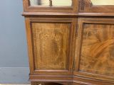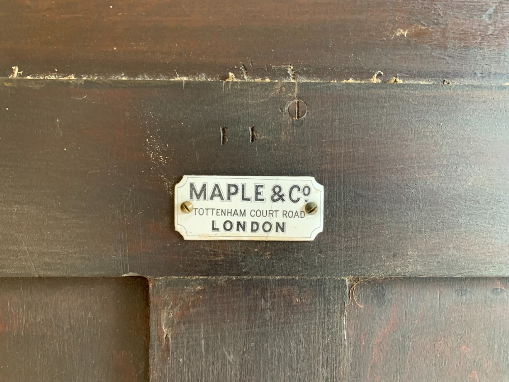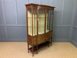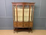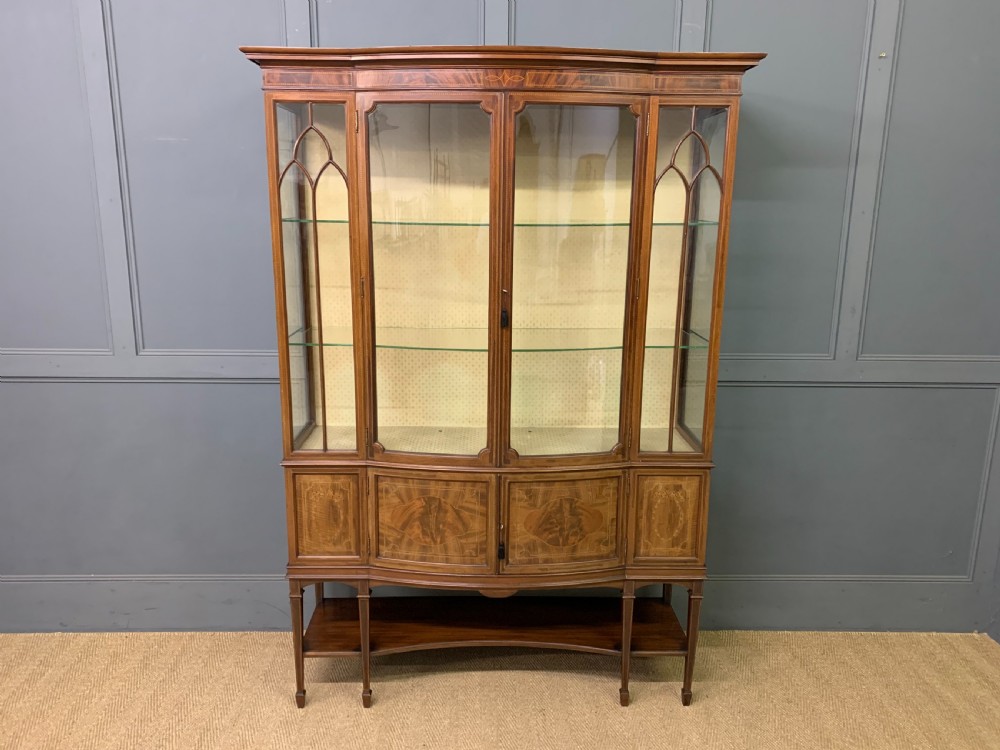 A good quality Edwardian period display cabinet by Maple & Co of London. Well constructed in mahogany and decorated with inlaid detailing throughout. With a pair of bow fronted glazed doors over a pair of cupboard doors. All doors are lockable (keys supplied). The glazed doors open to access a shelf and lined interior which affords ample display space. All standing on square tapering legs united by an under-tier. Cleaned and waxed in our workshops and offered for sale in very good original condition. Some fading to the cupboard doors. Bears original retailers label and marks to the rear. Contents not included. Dimensions: Width 130cms Depth 44cms Height 187cms Maple & Co was established by John Maple, a shopkeeper from Horley, Surrey, who later opened a furniture shop in Tottenham Court Road. However it was his son, John Blundell Maple , who made Maples & Co a success. With exceptional business skills, John B. Maple took over the company while still a young man. By the 1880s they were the largest furniture store in the world, exported their fine furniture to every continent. Maples manufactured their luxury furniture entirely in-house, at a huge modern complex. A timber importer and furniture exporter, they landed prestigious contracts furnishing fine houses, hotels, embassies and palaces in Europe; among them Tsar Nicholas’s Winter Palace and the Hofburg Imperial Palace in Vienna . With his own empire established, John Blundell Maple achieved further fame in politics and horseracing – some lines, such as the Atherstoke antique cabinet, having racing connections in the titles. Never compromising on quality, Maples produced a huge catalogue of fine furniture, covering every avenue of interior design. A Maples & Co sale today would cover everything from Chippendale Revival antique dining chairs , to Aesthetic style carved oak dressers, to Art Nouveau tulip carved antique dining tables – all from the same catalogue. The exclusivity and high quality of craftsmanship of Maples’ antique cabinets, dining suites and bedroom furniture made them highly popular with Britain’s social elite. Today, they appeal to anyone who appreciates fine craftsmanship. Internal Ref: 18313