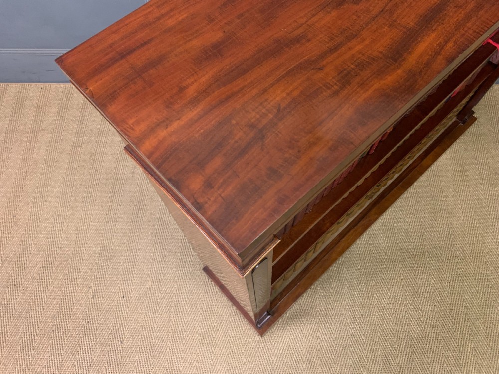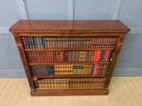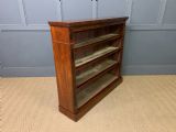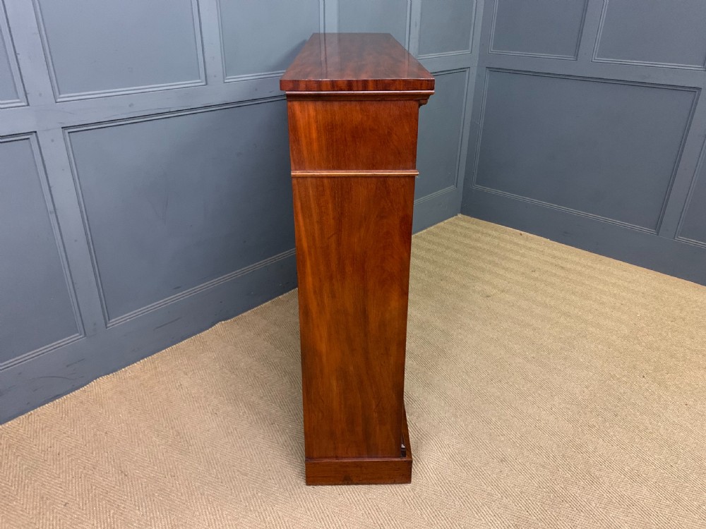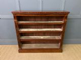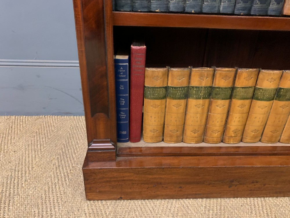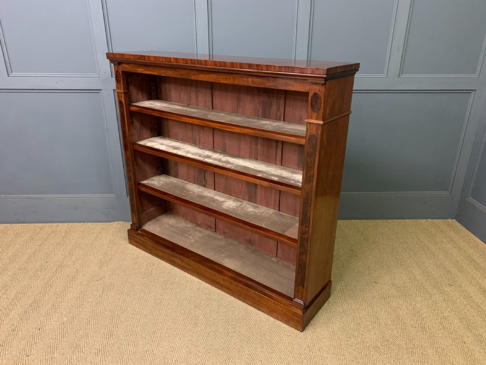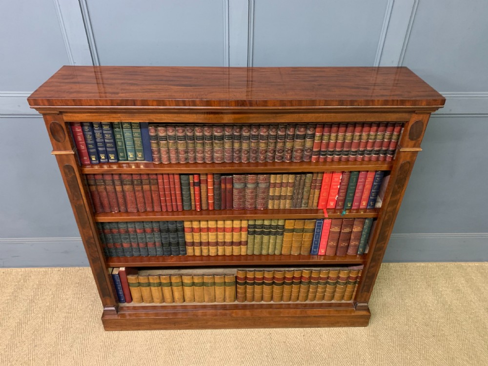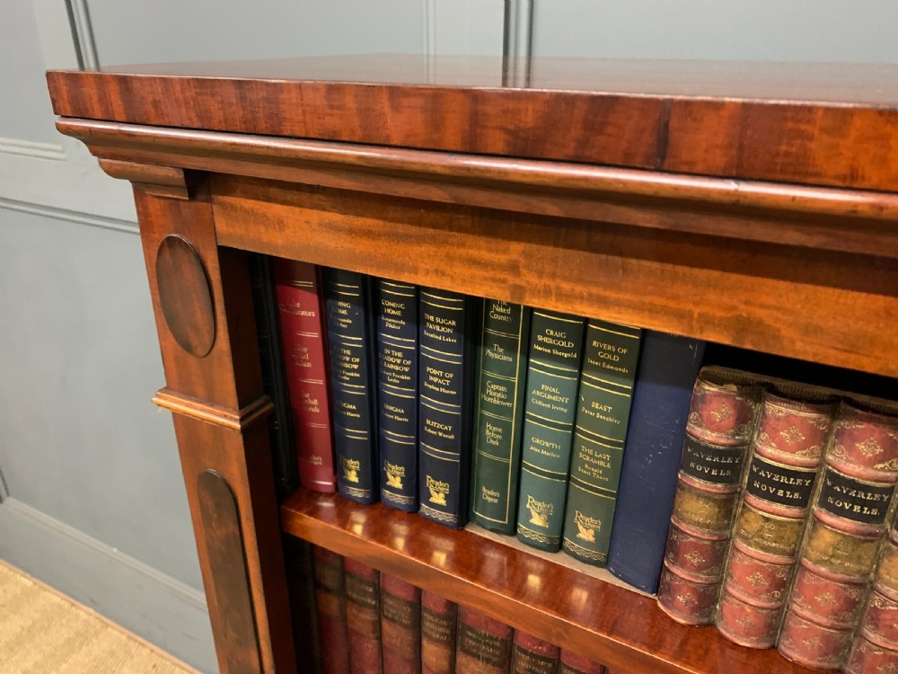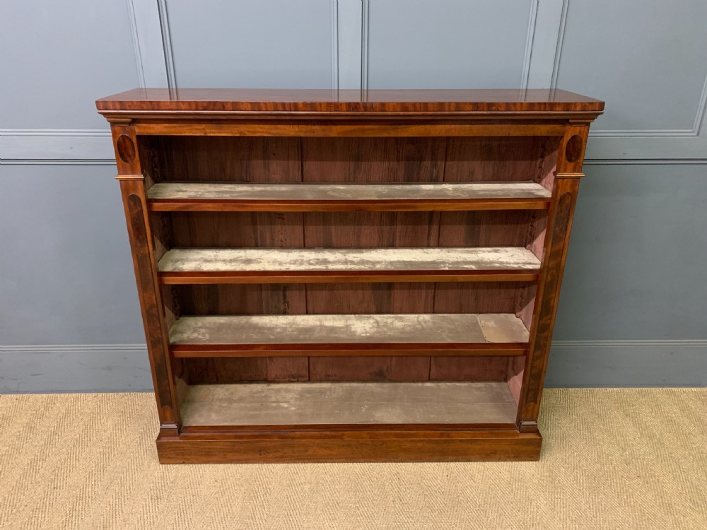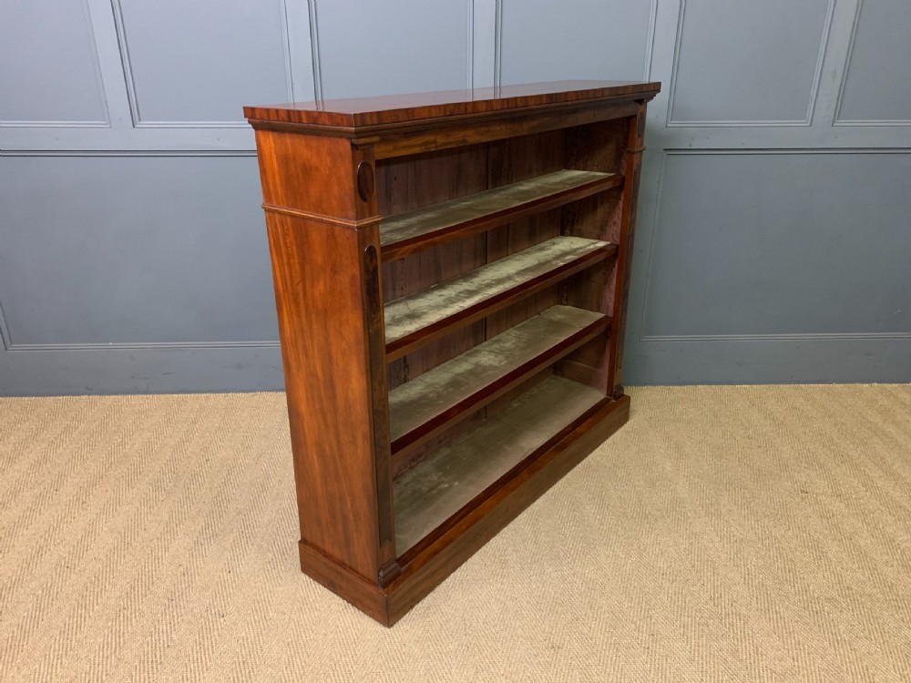A very good mid Victorian period mahogany open bookcase. Of generous proportions and well constructed in solid mahogany and attractive mahogany veneers. The top is of beautifully figured mahogany. The styles are adorned with figured mahogany roundels ans pilasters. With 3 adjustable shelves which are lined with the original material and afford a good display/storage capacity. Offered for sale in excellent condition, with a good colour and patina, ready to go straight into the home. Books not included. Dimensions: Width 127cms Depth 31.5cms Height 116.5cms Shelf depth 23.5cms Internal Ref: 18317