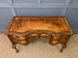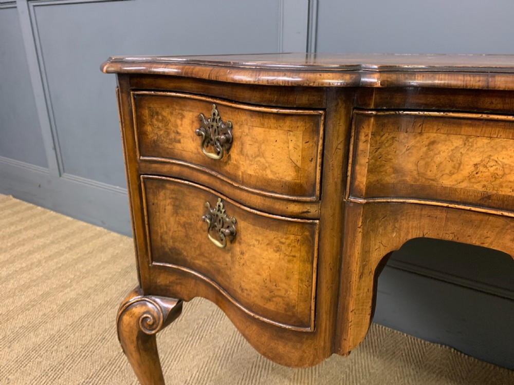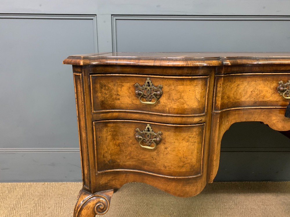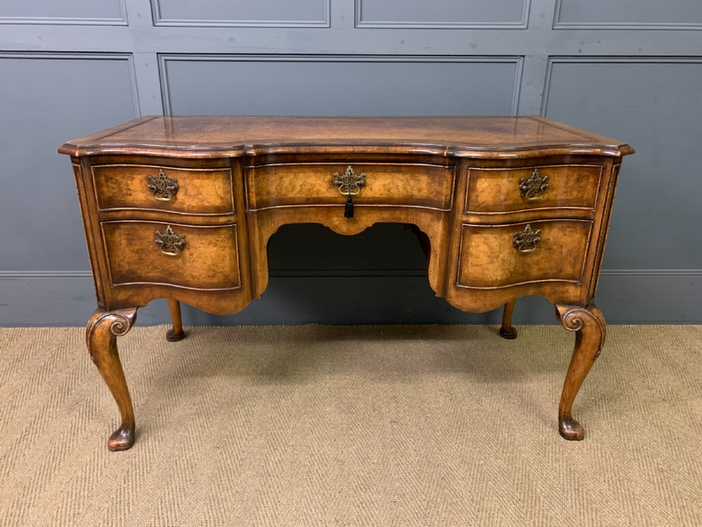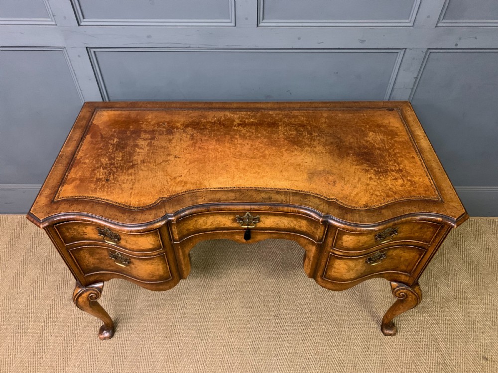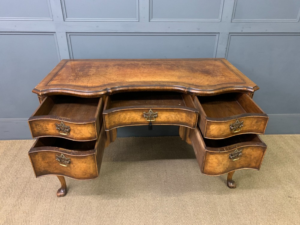 A very good Queen Anne style burr walnut serpentine fronted writing table, or desk. Well constructed in solid walnut with attractive burr walnut veneers. The top fitted with its original tan coloured leather writing surface. With a series of 5 drawers, all fitted with their original solid brass handles. The central drawer is lockable, key supplied. Standing on elegant cabriole legs which terminate in pad feet. Finished to the rear so it could be free-standing within a room if desired. Offered for sale in good original condition, cleaned and waxed in our workshops.