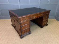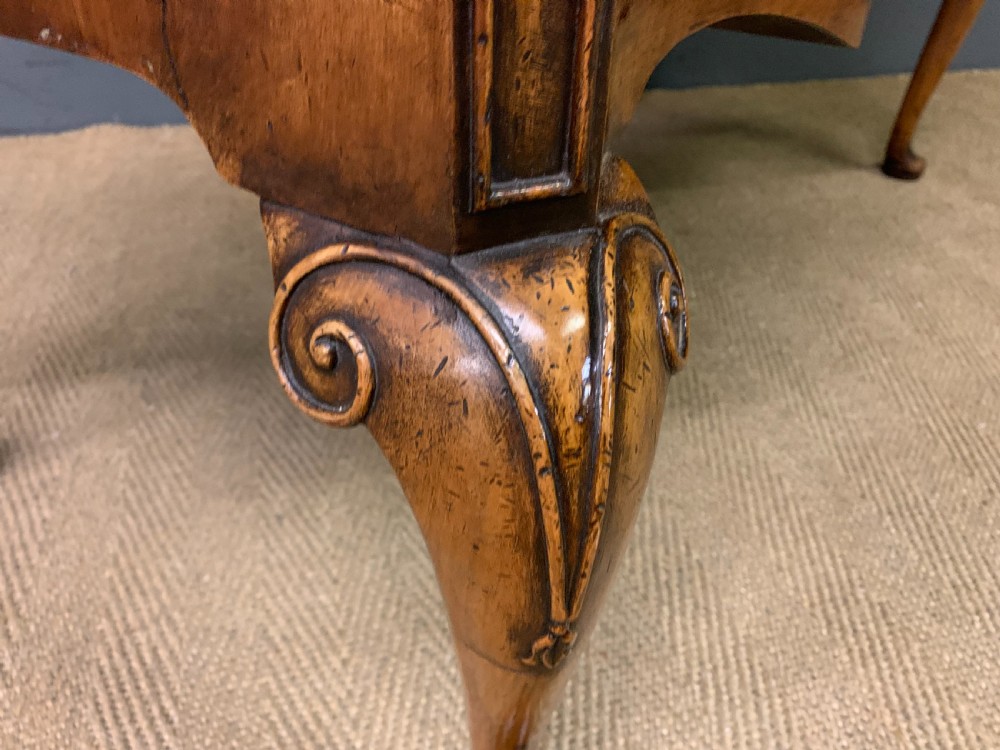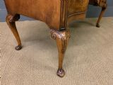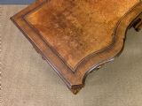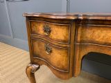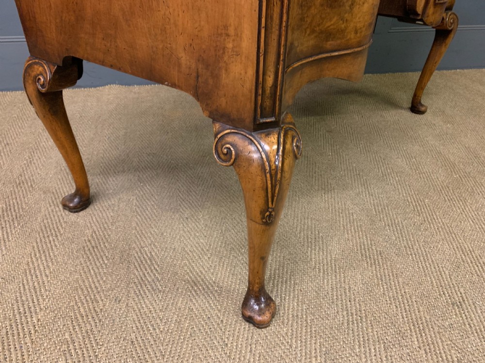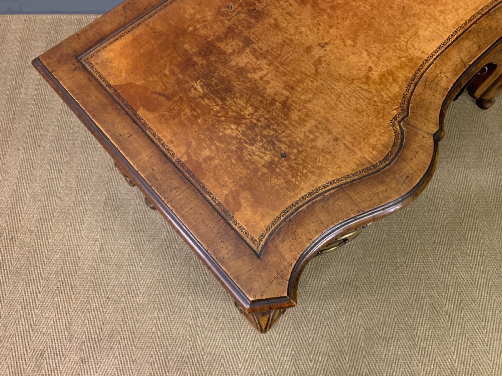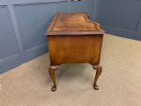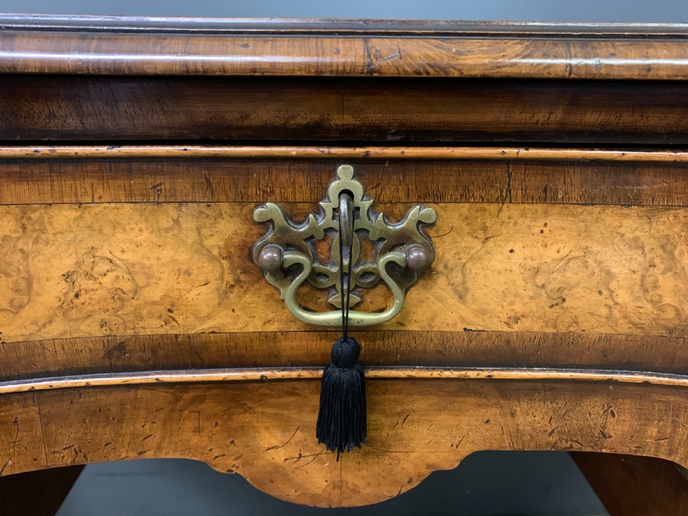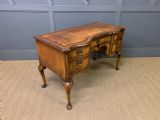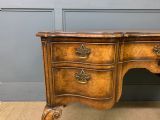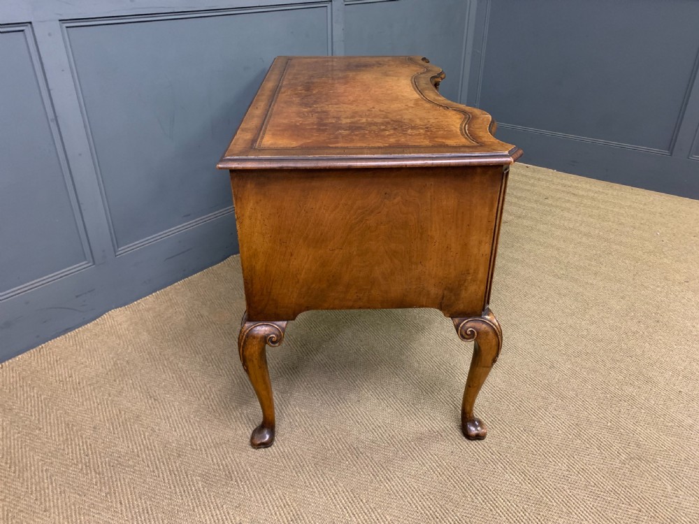 A very good Queen Anne style burr walnut serpentine fronted writing table, or desk. Well constructed in solid walnut with attractive burr walnut veneers. The top fitted with its original tan coloured leather writing surface. With a series of 5 drawers, all fitted with their original solid brass handles. The central drawer is lockable, key supplied. Standing on elegant cabriole legs which terminate in pad feet. Finished to the rear so it could be free-standing within a room if desired. Offered for sale in good original condition, cleaned and waxed in our workshops.