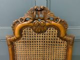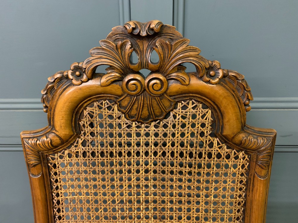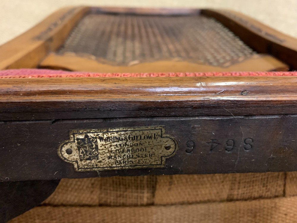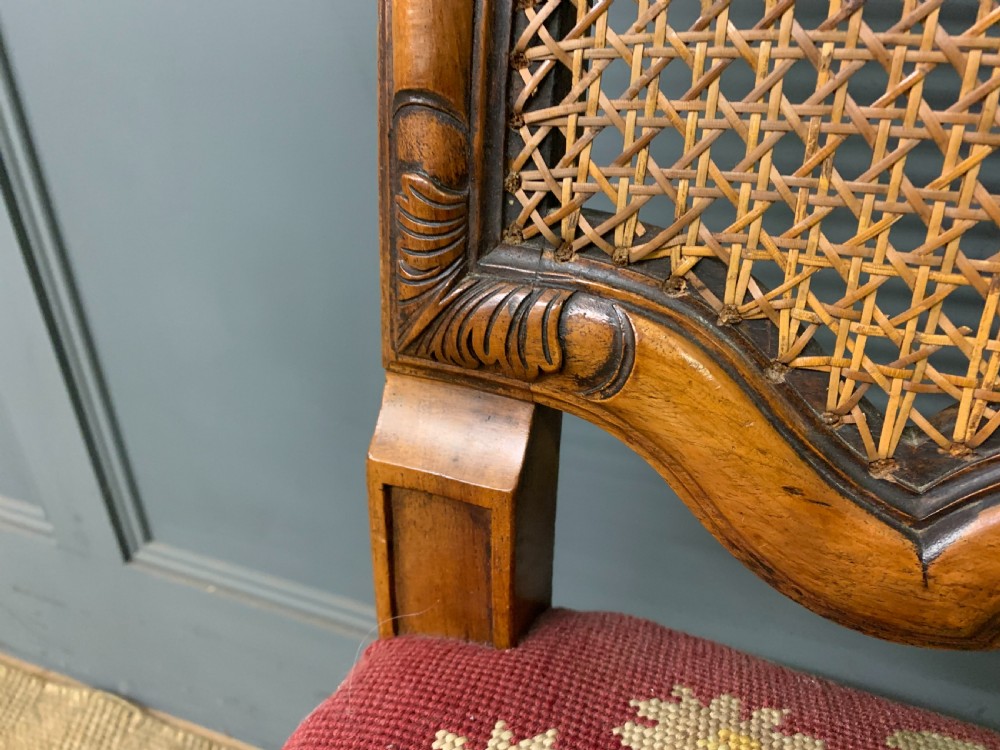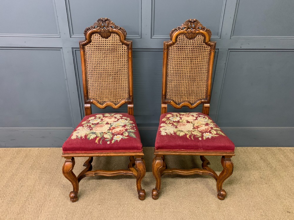 A very good pair of walnut William and Mary style chairs by Waring and Gillow. Of excellent construction in solid walnut and dating to the Edwardian period. With high backs fitted with their original cane work. The upholstered seats with the original needle-point woolwork upholstery. Decorated with carved detailing to the backs and crests. With scrolling cabriole legs united by stretchers. Offered for sale in very good original conditon, with a good colour. Would sit well within a number of different room scenarios within the modern home. Dimensions: Width 51cms Depth 43cms Overall height 115cms Seat height 47cms Waring and Gillow a potted history: Waring & Gillow is a noted firm of English furniture manufacturers formed in 1897 by the merger of Gillow of Lancaster and Waring of Liverpool. The firm of Gillow's of Lancaster can be traced back to the luxury furniture and furnishings firm founded by Robert Gillow (1704–72) in 1730. Robert Gillow served an apprenticeship as a joiner. During the 1730s he began to exploit the lucrative West Indies trade exporting mahogany furniture and importing rum and sugar. Following his death in 1772, the business was continued by his two sons, Richard (1734–1811) and Robert (1745–93). In 1764 a London branch of Gillow's was established at 176 Oxford Road, now Oxford Street, by Thomas Gillow and William Taylor. The firm rapidly established a reputation for supplying high-quality furniture to the richest families in the country. During the final years of the 19th century the company ran into financial difficulty and from 1897 began a loose financial arrangement with Waring of Liverpool, an arrangement legally ratified by the establishment of Waring & Gillow in 1903. Waring's of Liverpool was founded by John Waring, who arrived in the city from Belfast in 1835 and established a wholesale cabinet making business. He was succeeded by his son Samuel James Waring who rapidly expanded the business during the 1880s, furnishing hotels and public buildings throughout Europe. He also founded Waring-White Building Company which built the Liverpool Corn Exchange, Selfridge's department store and the Ritz Hotel. Samuel James's son and namesake Samuel James Waring (1860-1940) continued the family business and was elevated to the peerage as Baron Waring in 1922. Gillow's had established a reputation for the outfitting of luxury yachts and liners, including the royal yacht Victoria and Albert, liners Lusitania, Heliopolis and Cairo, Queen Mary (1936) and Queen Elizabeth (1940) for Cunard. During the First World War the Lancaster factory was turned over to war production, making ammunition chests for the Navy and propellers for De Havilland DH9 aircraft. They also established a large tent-manufacturing facility of 8,000 workers during WW1 on the now closed former exhibition site at White City (the former Machinery Hall). They also made gas masks and trench covers from this site.During this time it was also at the White City site that the Workers Union first got recognition after a four-day strike mainly by women. The company also manufactured ammunition belts for use with machine guns, nosebags for horses and protective clothing for use during gas attacks. During World War II the factory produced parts for gliders and the Mosquito aircraft, while kit-bags, tents and camouflage nets were made by the upholstery department. Internal Ref: 18325