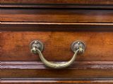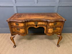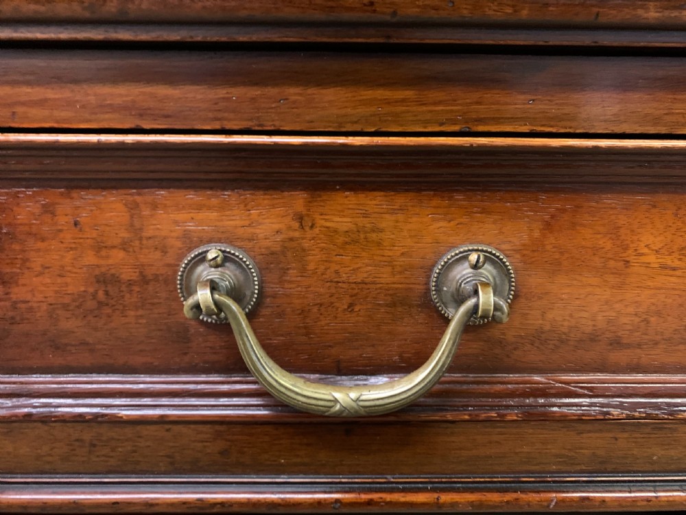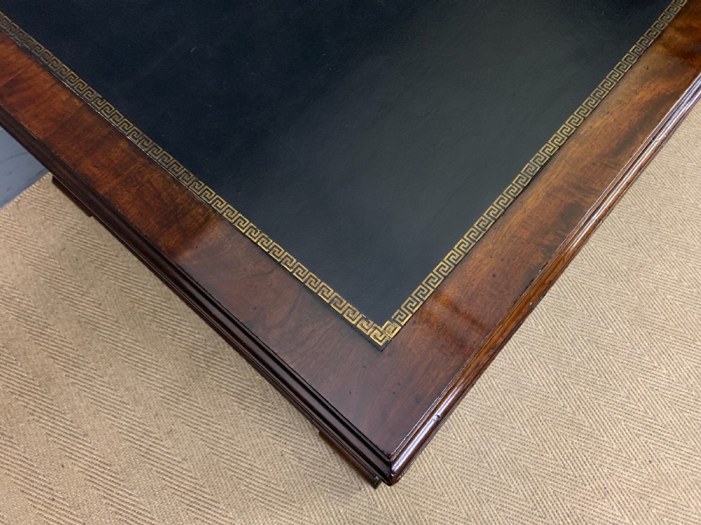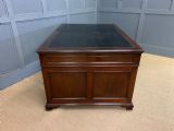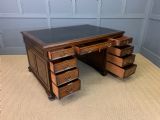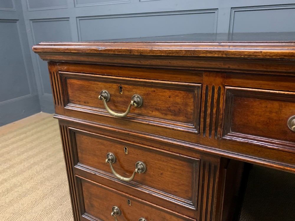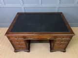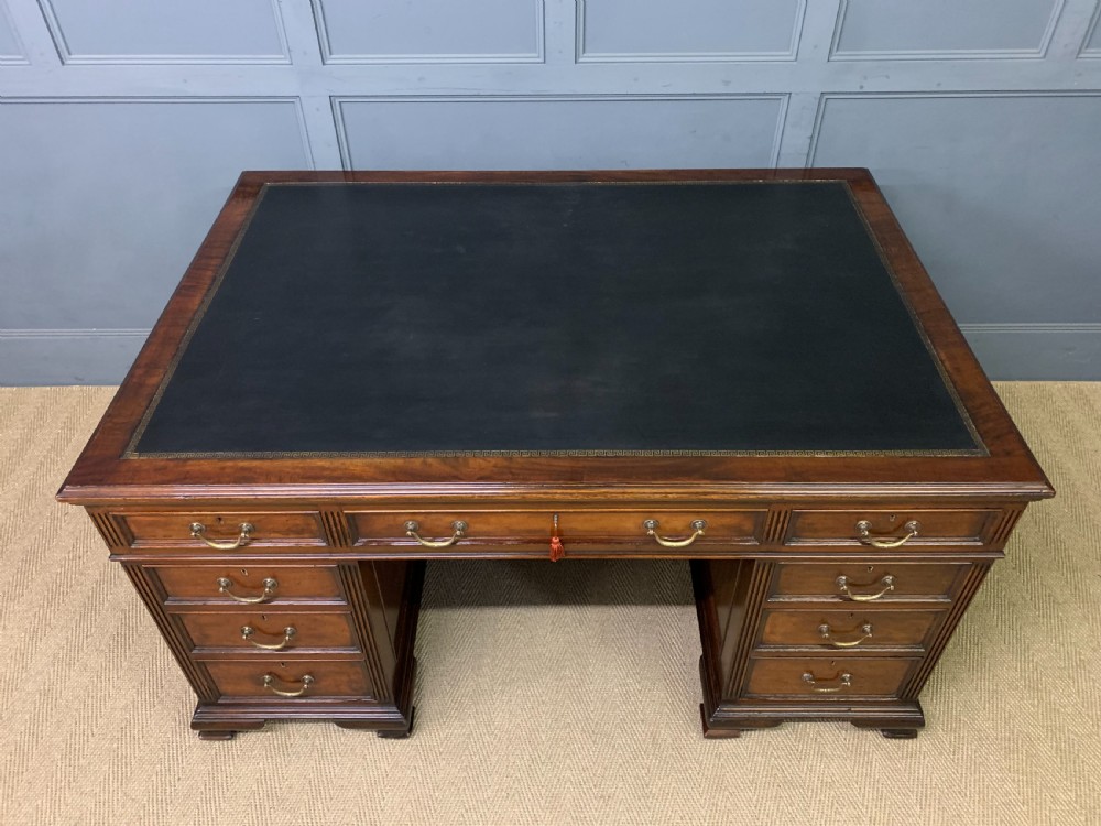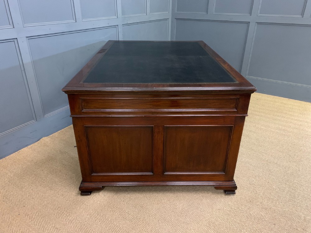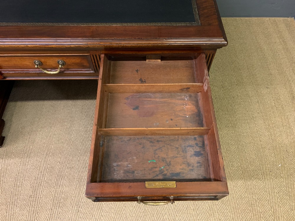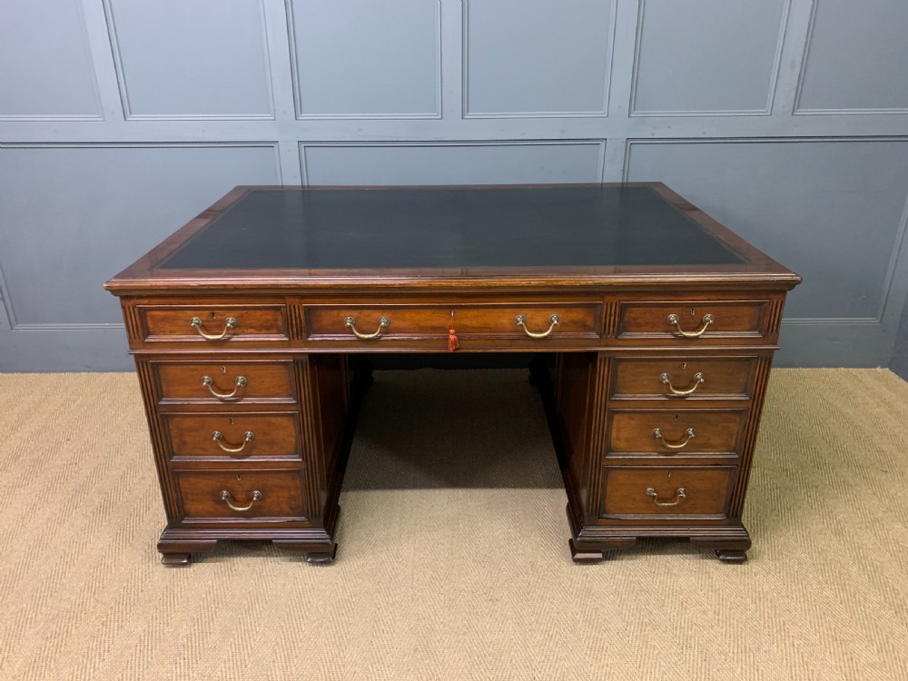 A fine quality late Victorian period mahogany partners pedestal desk by Maple and Co. of London. Of excellent construction in mahogany in the Georgian style and of generous proportions. The top fitted with a sumptuous black leather writing surface with gilt tooled decoration to the surrounds. One side with a series of 9 drawers , the reverse with a series of 3 drawers over a pair of cupboard doors. All fitted with their original solid brass hardware. All drawers and doors are lockable (keys supplied), the locks by Hobbs and Co.. The pedestals are raised on ogee bracket feet which are fitted with the original rebated castors. The sides of the desk are of paneled construction. One drawer has a secret compartmnet to the rear (see photos). Sympathetically repolished in our workshops to a very high standard. Now offered for sale in excellent condition, with a great colour and patina, ready to go straight into the home or office. Splits into 3 sections for ease of installation. Dimensions: Width 154cms Depth 105cms Height 80cms Knee-hole width 68cms Knee-hole clearance 61cms Maple & Co was established by John Maple, a shopkeeper from Horley, Surrey, who later opened a furniture shop in Tottenham Court Road. However it was his son, John Blundell Maple , who made Maples & Co a success. With exceptional business skills, John B. Maple took over the company while still a young man. By the 1880s they were the largest furniture store in the world, exported their fine furniture to every continent. Maples manufactured their luxury furniture entirely in-house, at a huge modern complex. A timber importer and furniture exporter, they landed prestigious contracts furnishing fine houses, hotels, embassies and palaces in Europe; among them Tsar Nicholas’s Winter Palace and the Hofburg Imperial Palace in Vienna . With his own empire established, John Blundell Maple achieved further fame in politics and horseracing – some lines, such as the Atherstoke antique cabinet, having racing connections in the titles. Never compromising on quality, Maples produced a huge catalogue of fine furniture, covering every avenue of interior design. A Maples & Co sale today would cover everything from Chippendale Revival antique dining chairs , to Aesthetic style carved oak dressers, to Art Nouveau tulip carved antique dining tables – all from the same catalogue. The exclusivity and high quality of craftsmanship of Maples’ antique cabinets, dining suites and bedroom furniture made them highly popular with Britain’s social elite. Today, they appeal to anyone who appreciates fine craftsmanship. Internal Ref: 18328