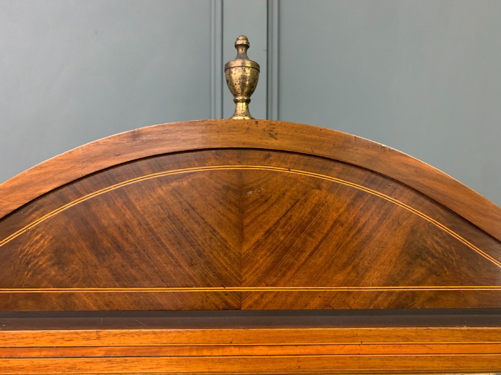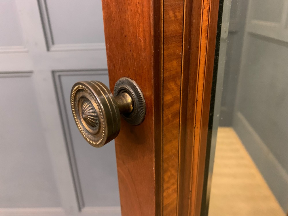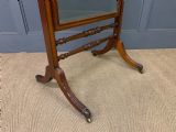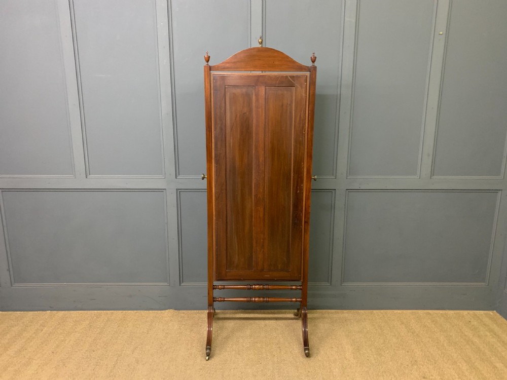 A good quality late Victorian period inlaid mahogany cheval mirror. From the Sheraton revival period in the neo-classical taste. Of generous proportions and very good construction. With inlaid banding and stringing throughout in boxwood and satinwood. Fitted with its original beveled mirrored glass plate (some very minor spoting). Standing on splayed feet terminating in original brass and caps and castors. Surmounted by finials in mahogany and brass. Offered for sale in very good original condition. Cleaned and waxed in our workshops and now ready to go straight into the home. Dimensions: Width 70cms Depth 52cms Height 189cms Internal Ref: 18345