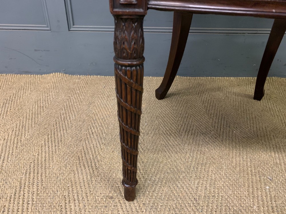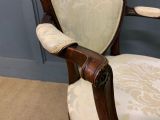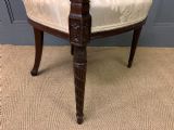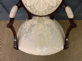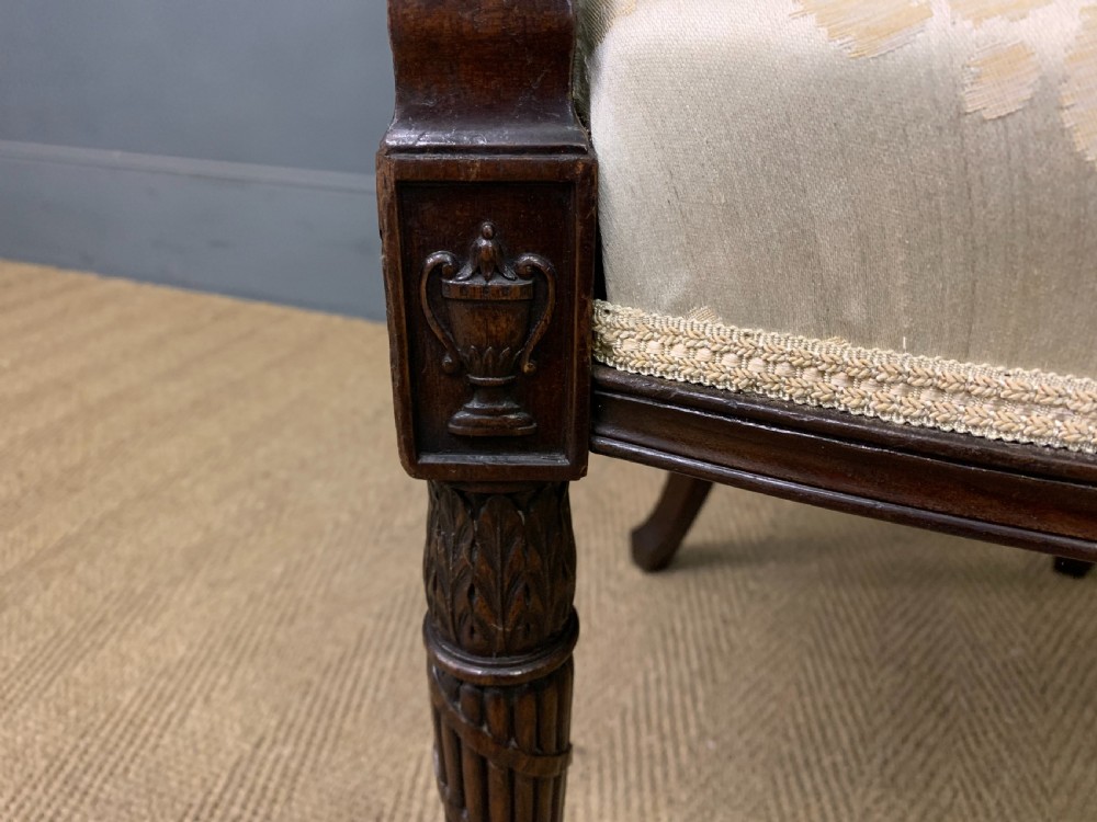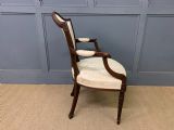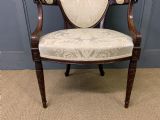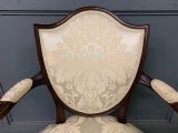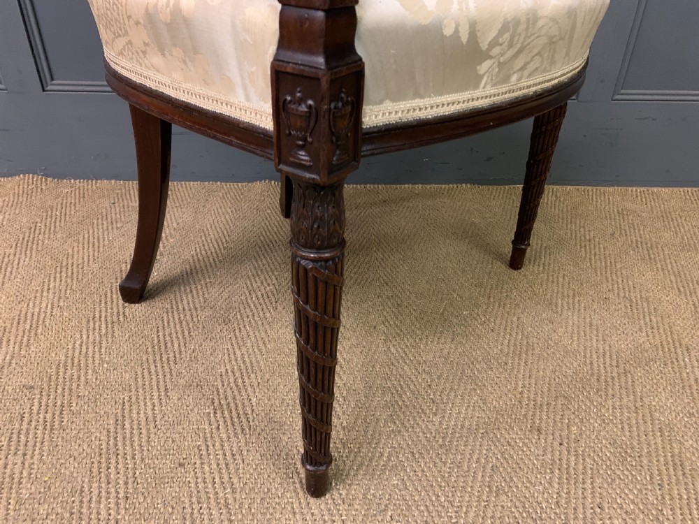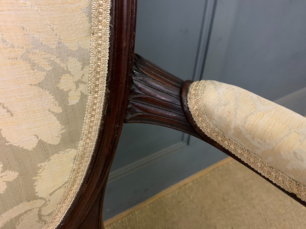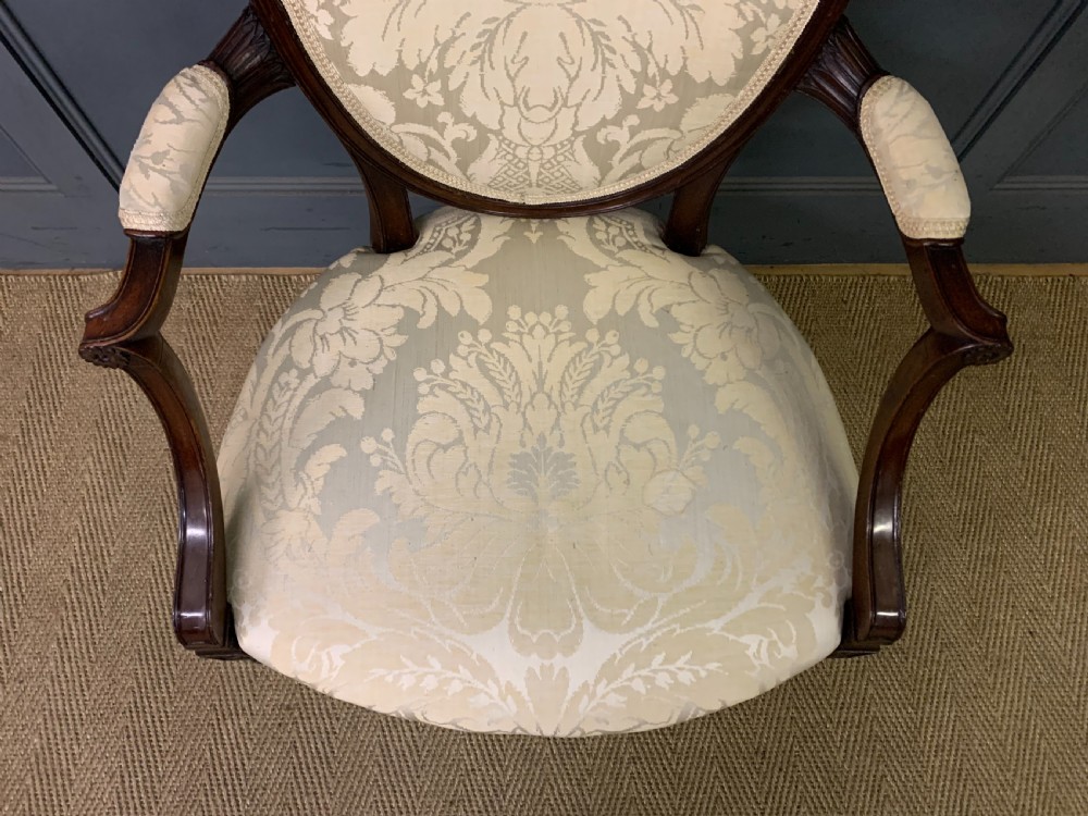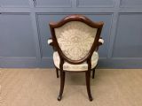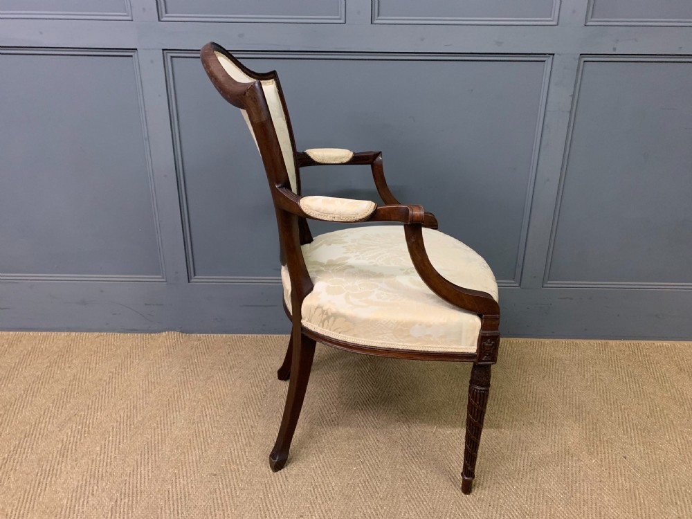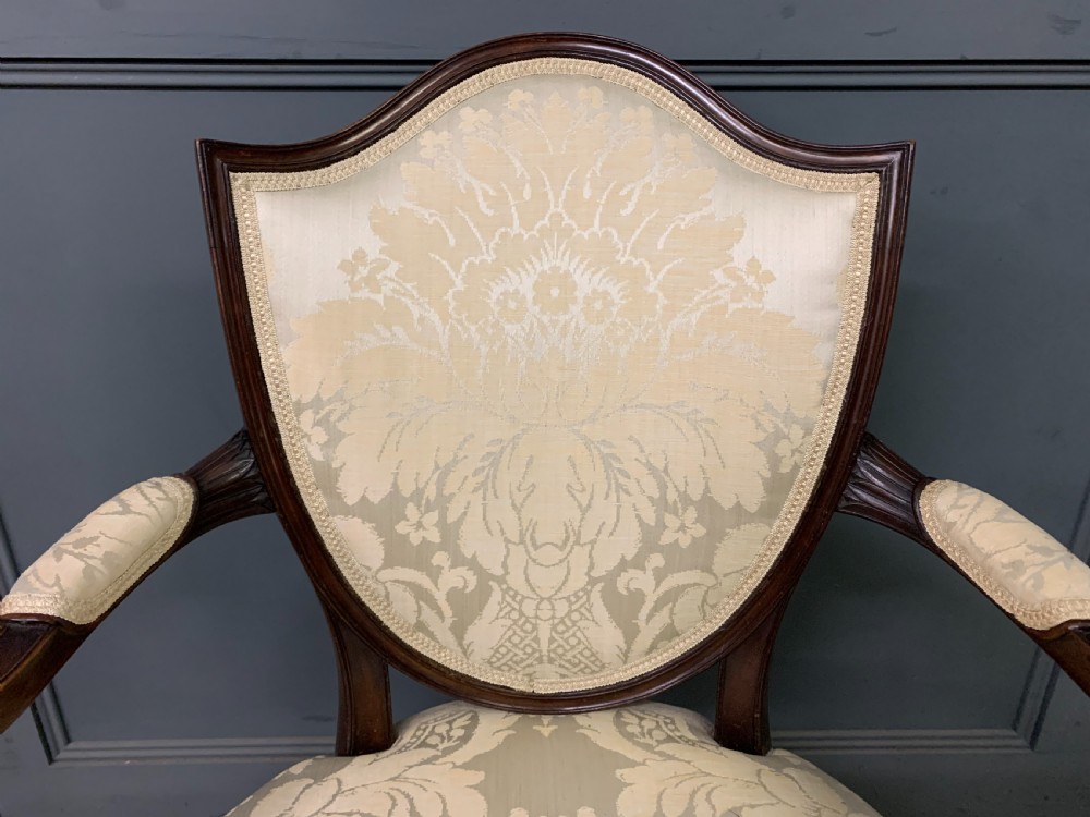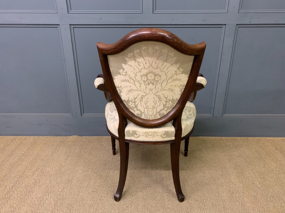 A charming Edwardian period Hepplewhite style mahogany armchair. Well constructed in solid mahogany and upholstered in silk fabric. With a shield shaped back and curved arms. The turned front legs are decorated with carved detailings and topped with urns. The back legs are of elegant out-swept from. Further carved decorations adorn the arms. This lovely chair would sit well within a number of different room scenarios within the modern home. Offered for sale in very good original condition, some minor marks to the upholstery.