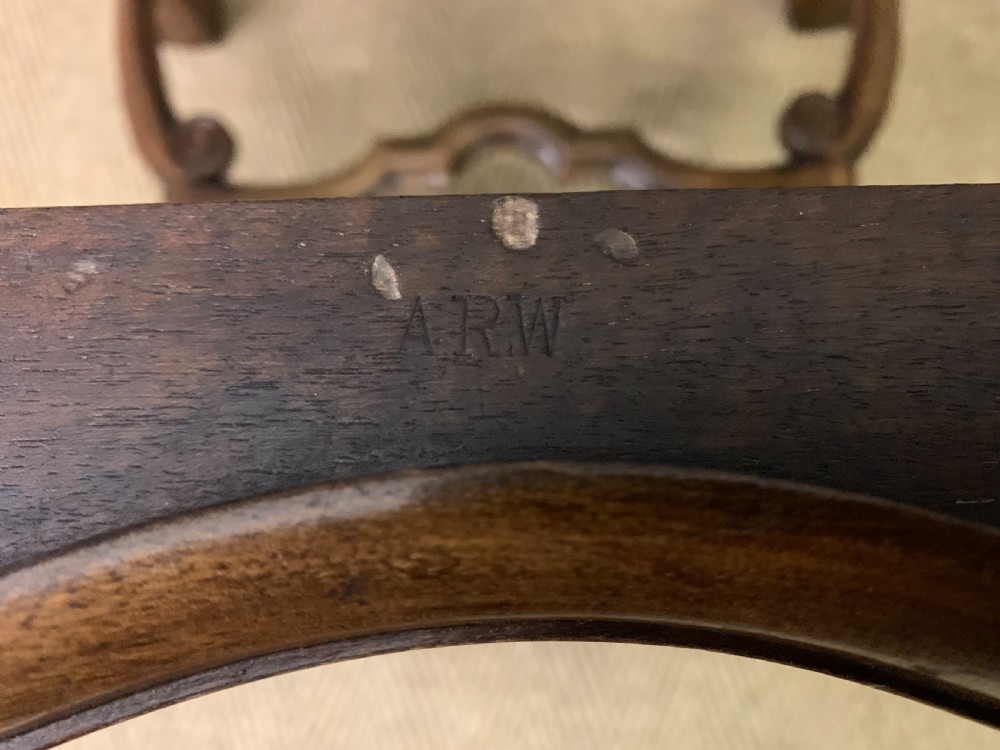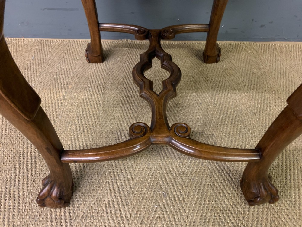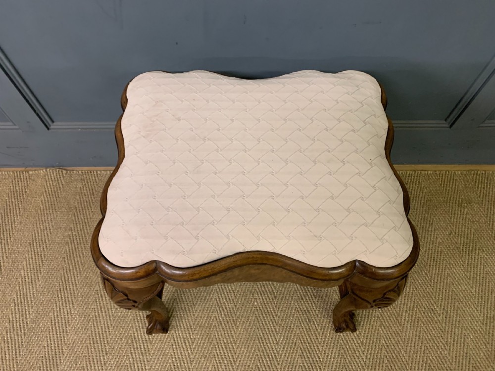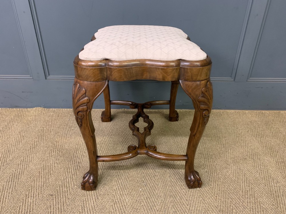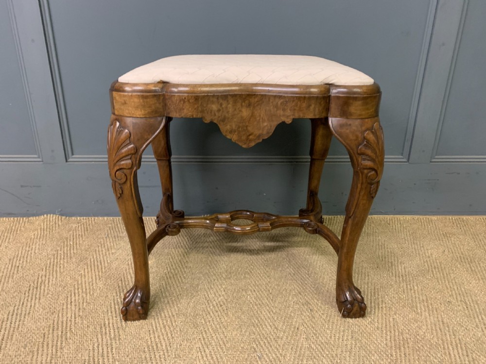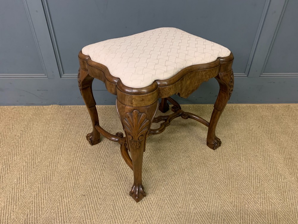 A charming burr walnut stool in the queen Anne style. Of excellent construction in solid walnut and attractive burr walnut veneers, with an upholstered seat. Of lovely shape and form with carved detailing and elaborate under-stretchers. Offered for sale in very good original condition (some minor marks to the fabric) with a warm colour and patina, ready to go straight into the home. Bearing the original makers initials to the frame "ARW". Dimensions: Width 52cms Depth 43cms Height 51cms Internal Ref: 18349