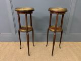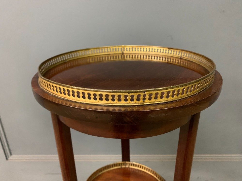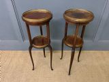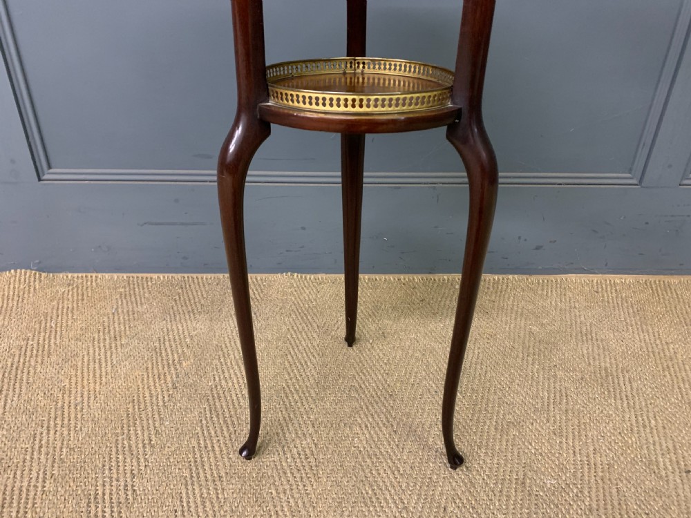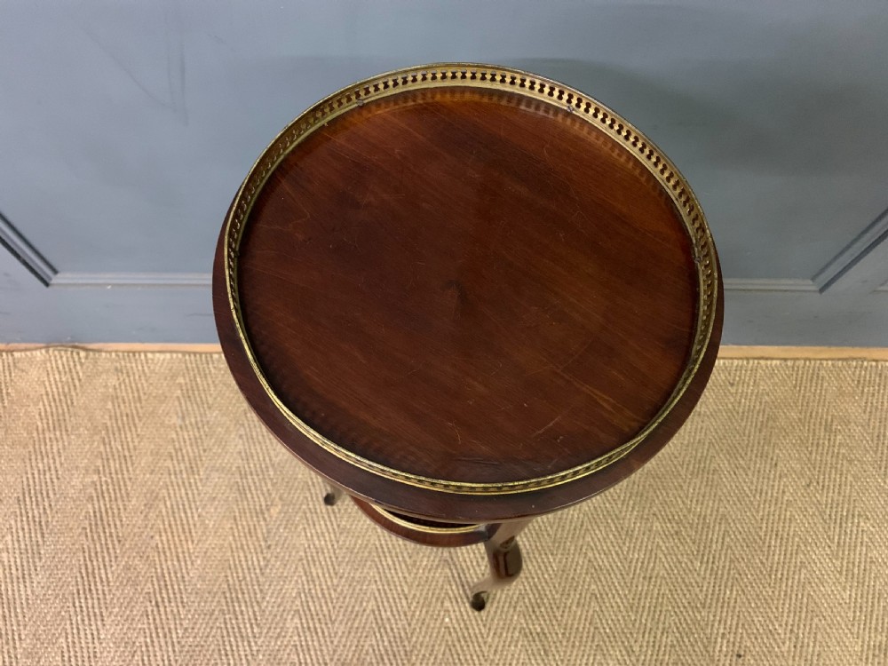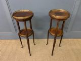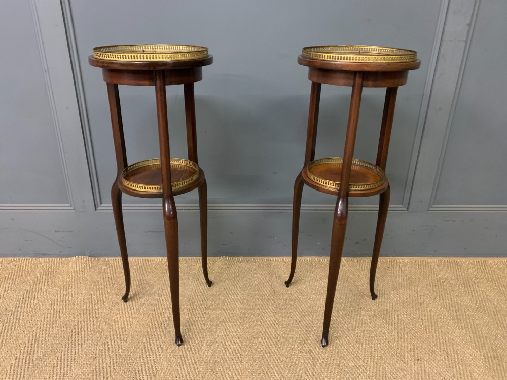 A lovely pair of early 20th century mahogany stands, or jardiniere stands. Well constructed in solid mahogany with lovely sweeping cabriole legs. With 2 tiers, each fitted with a pierced brass gallery. Offered for sale in very good original condition, ready to go straight into the home. Dimensions: Diameter 28cms Height 77cms Internal Ref: 18350