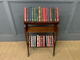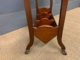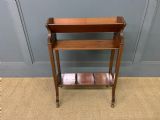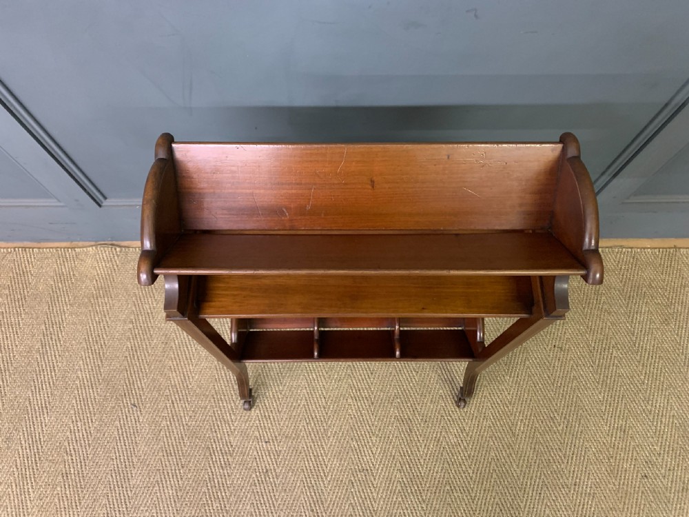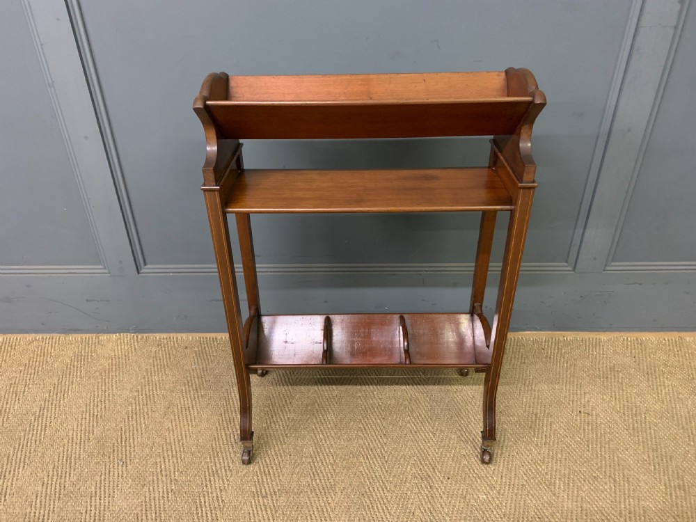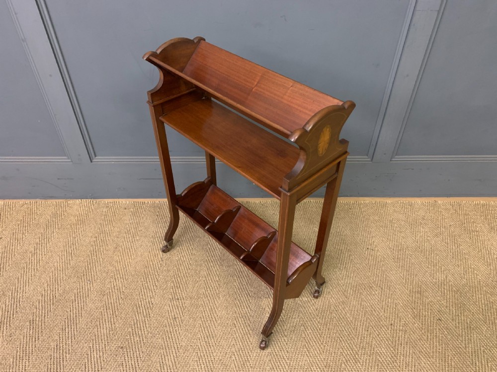 A charming Edwardian period inlaid mahogany book trough, or book rack. Well made in solid mahogany with inlaid strining to the legs and inlaid fan motif to the sides. All standing on original brass and ceramic castors. Cleaned and waxed in our workshops and offered for sale in very good original condition.