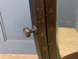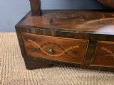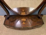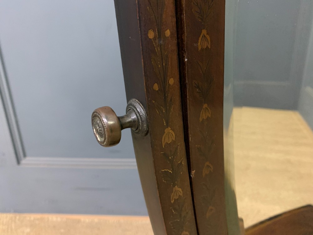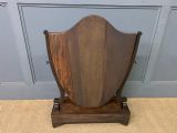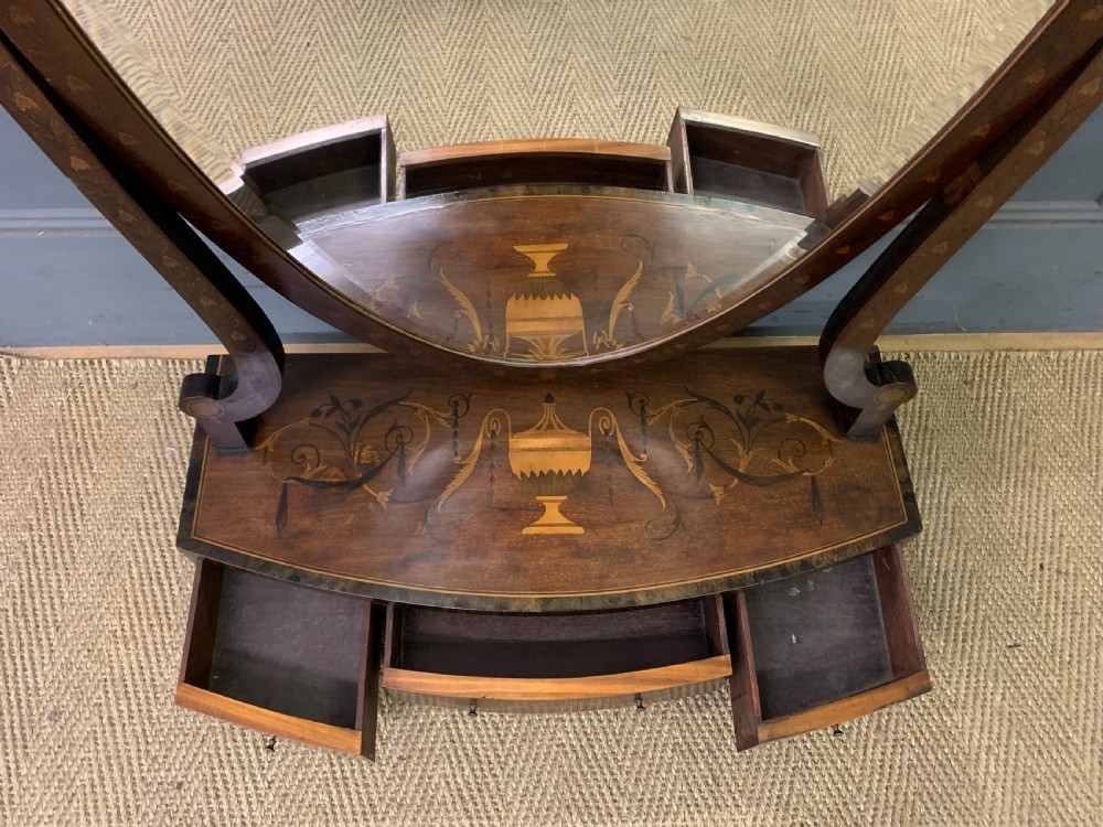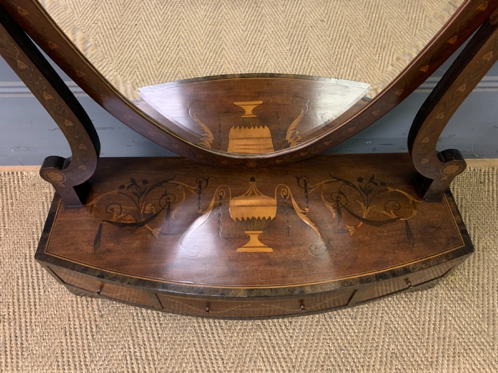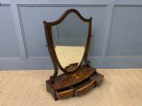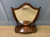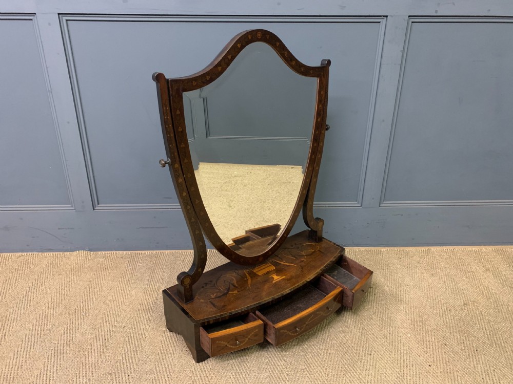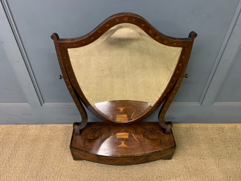 A superior George III period toilet, or dressing, mirror of generous proportions. Well constructed in mahogany with cross banding in walnut. Decorated throughout with profuse inlay in satinwood, boxwood and walnut. With a shield shaped mirror complete with its original beveled plate glass. The base is of bow fronted form with a series of 3 jewellery drawers. Offered for sale in very good condition. Dimensions: Width 64cms Depth 26cms Height 89cms Internal Ref: 18362H
