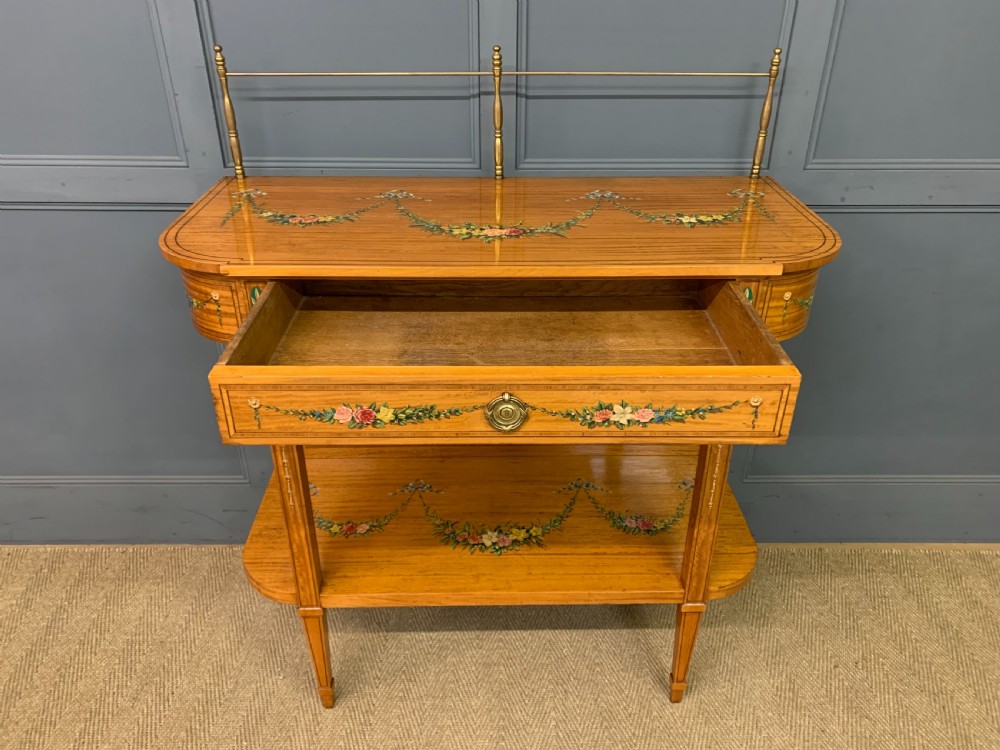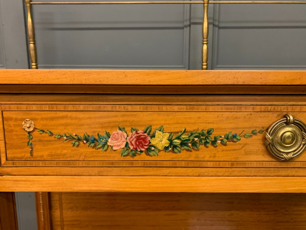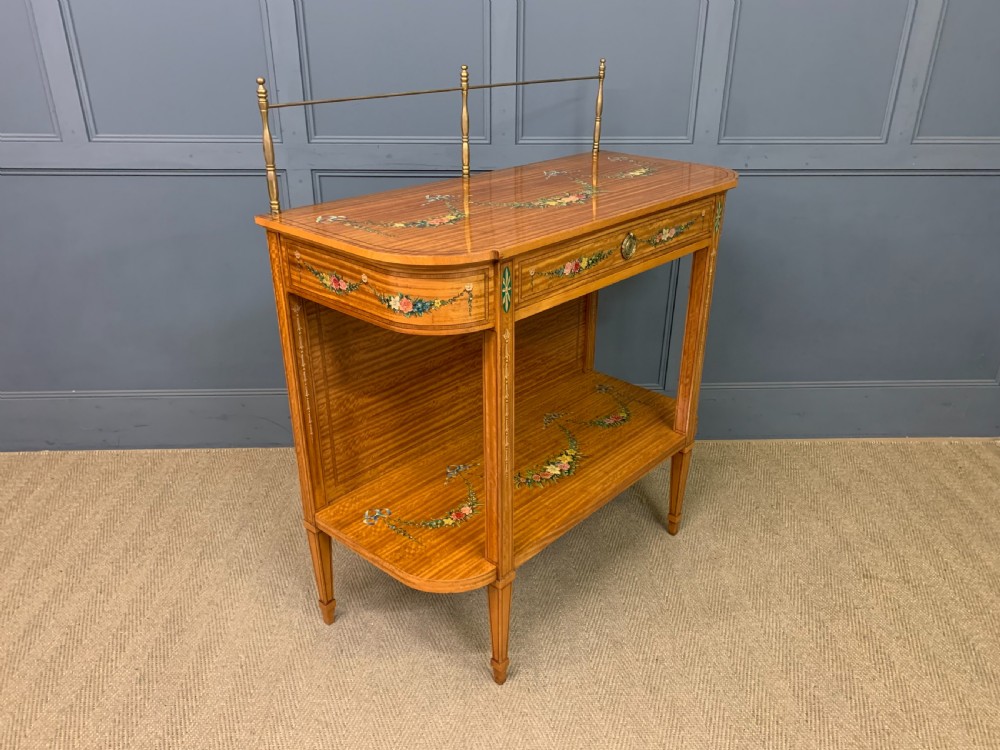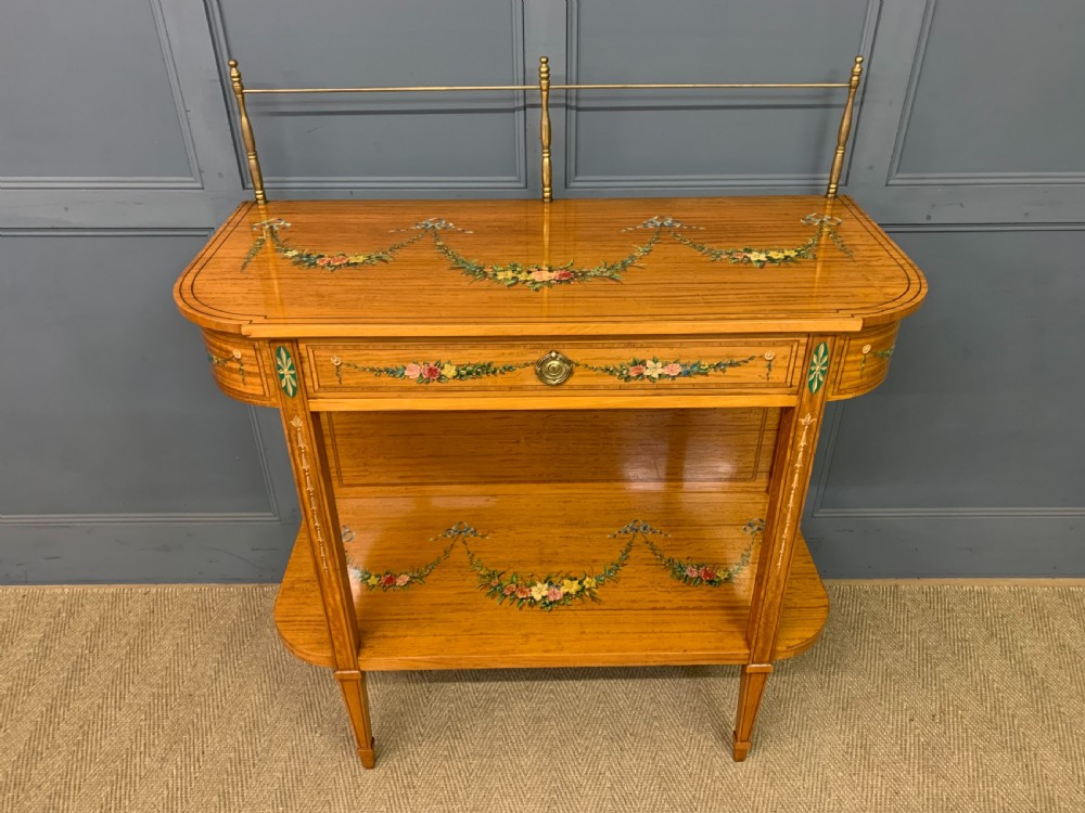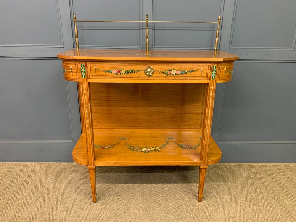 A very pretty early 20th century period inlaid satinwood side table. Very well constructed in attractive satinwood veneers onto a solid mahogany carcas and with solid oak drawer linings. Embellished with ebony stringing inlay and satinwood cross banding throughout. Further decorated with lovely hand painted floral swags and garlands. With a single drawer to the front and with convex ends. Surmounted by the original solid brass gallery. All standing on square tapering legs which terminate in spade feet and are united by an under-tier. This table is of good proportions and would sit well in a number of different room scenarios within the modern home. Cleaned and waxed in our workshops and now offered for sale in very good condition with a great colour and patina.