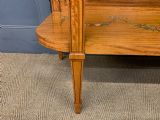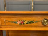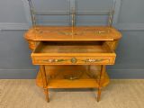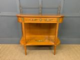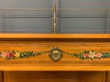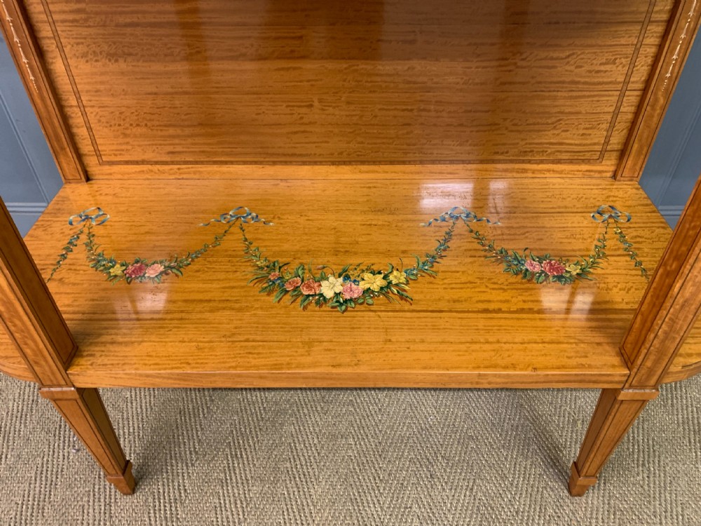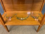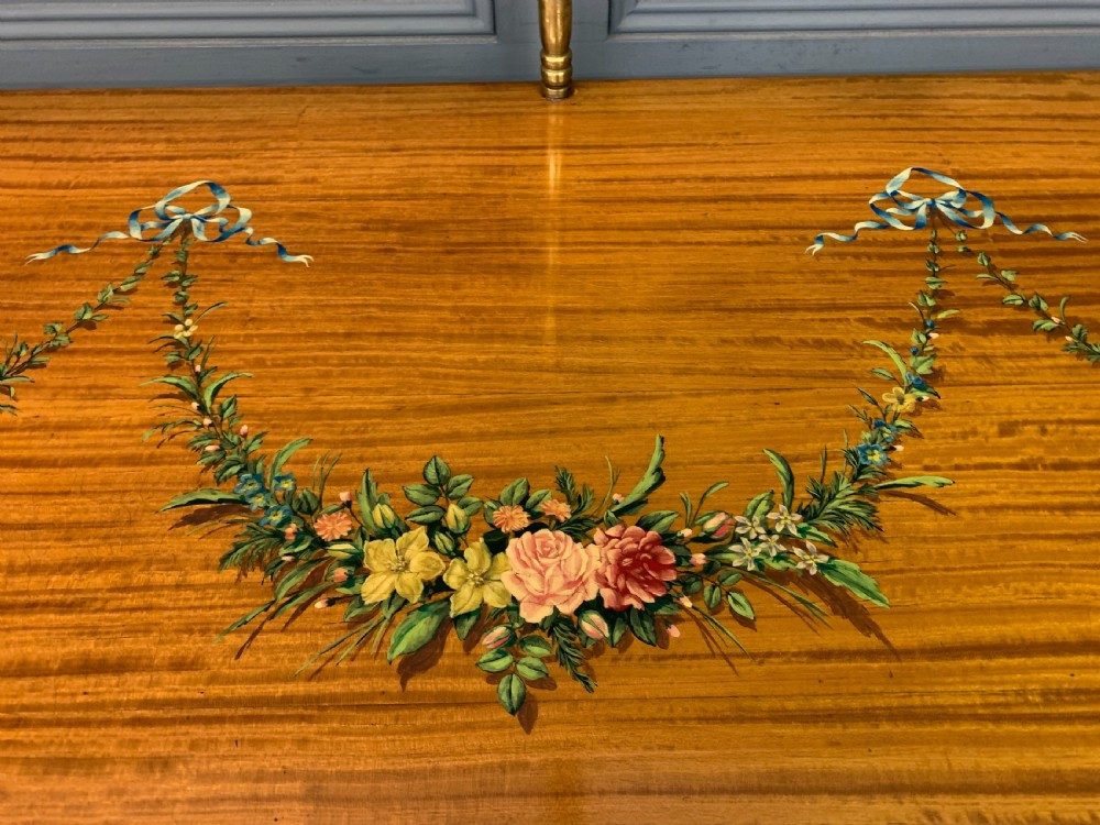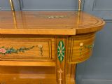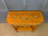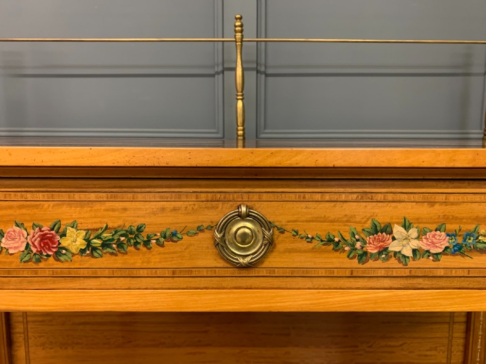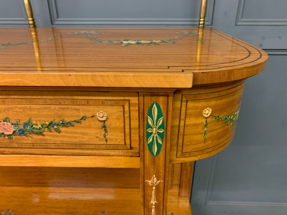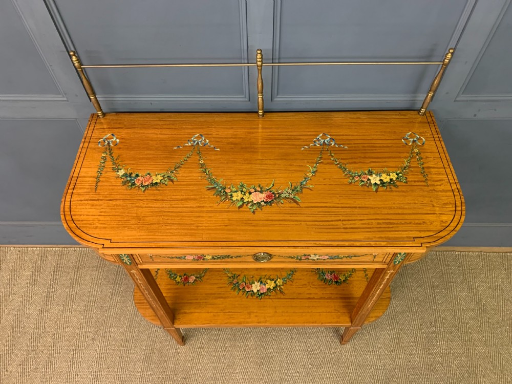 A very pretty early 20th century period inlaid satinwood side table. Very well constructed in attractive satinwood veneers onto a solid mahogany carcas and with solid oak drawer linings. Embellished with ebony stringing inlay and satinwood cross banding throughout. Further decorated with lovely hand painted floral swags and garlands. With a single drawer to the front and with convex ends. Surmounted by the original solid brass gallery. All standing on square tapering legs which terminate in spade feet and are united by an under-tier. This table is of good proportions and would sit well in a number of different room scenarios within the modern home. Cleaned and waxed in our workshops and now offered for sale in very good condition with a great colour and patina.