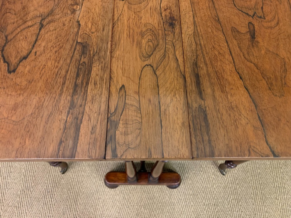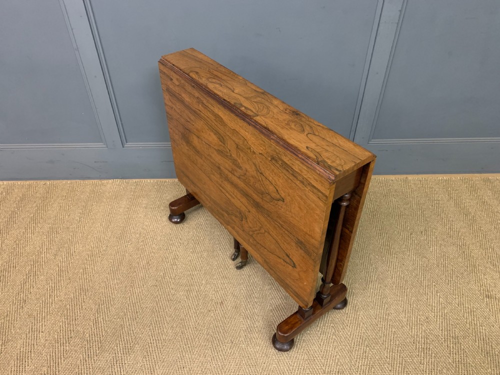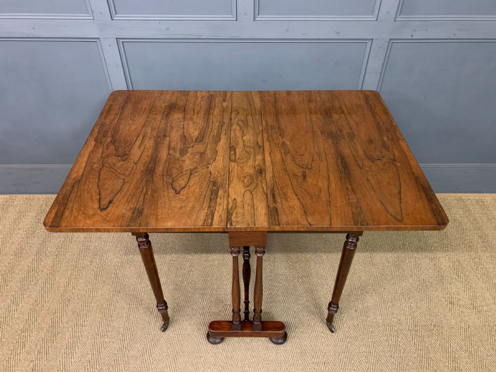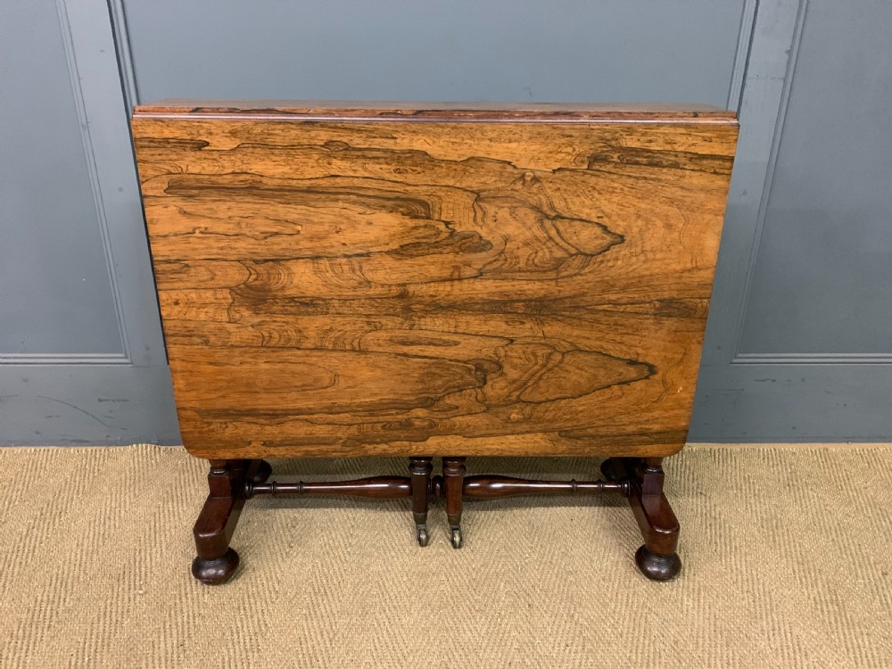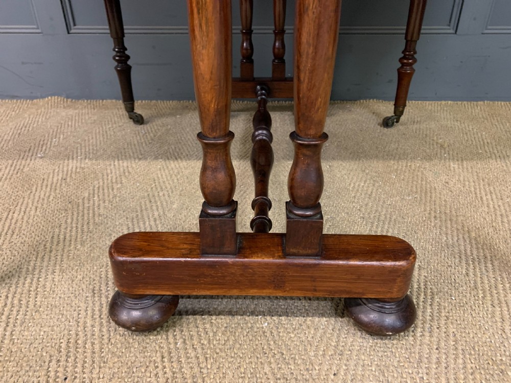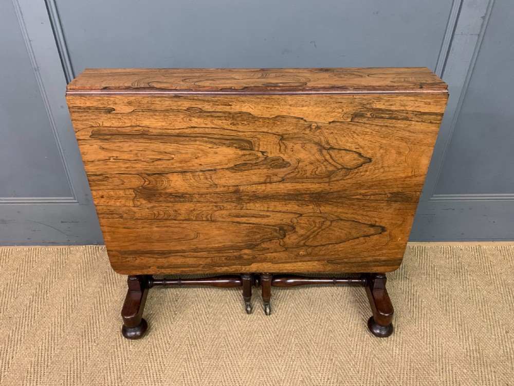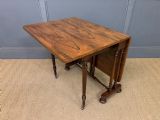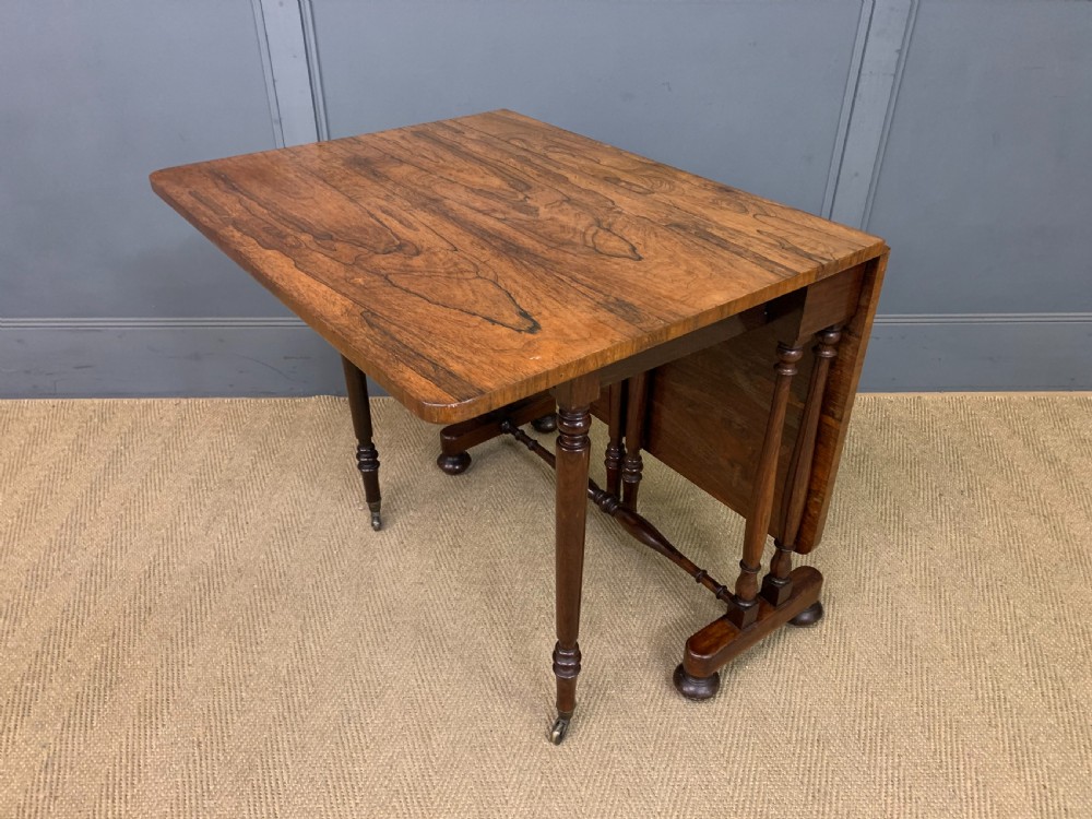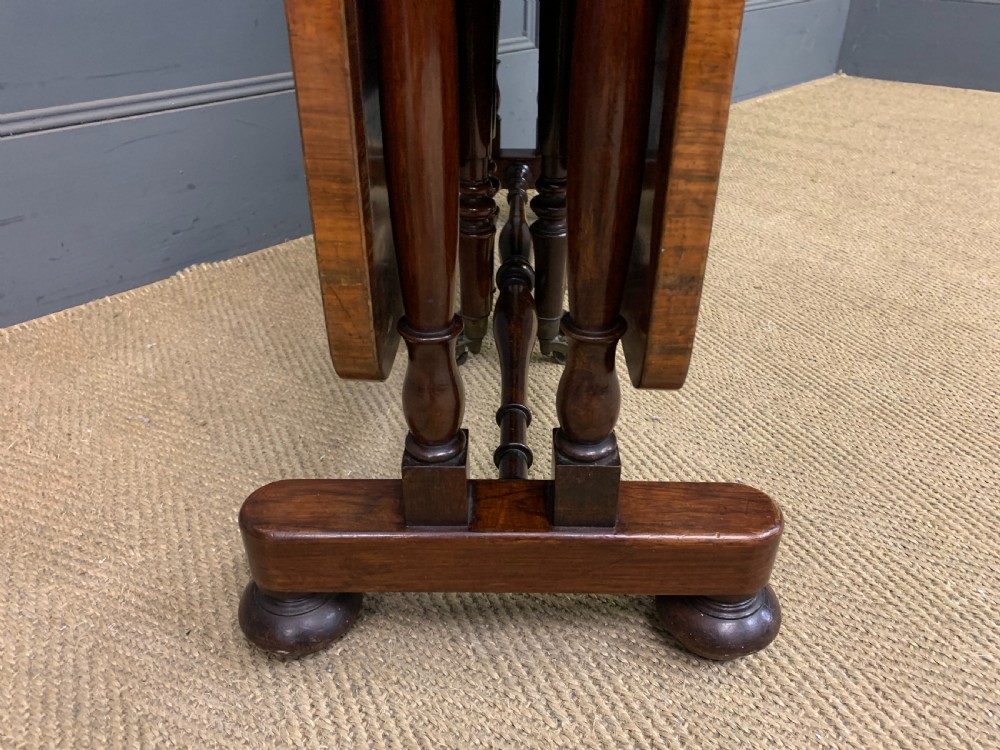 A lovely William IV / early Victorian period sutherland table. Very well constructed in solid rosewood with attractive rosewood veneers. With swing out legs which open to support the flaps when in the open position. Of generous proportions and would sit well in a number of different room scenarios within the modern home. Cleaned and waxed in our workshops and now offered for sale in very good original condition. Dimensions: Width 82cms Depth 36cms Height 74cms Length when open 119cms Internal Ref: 18373