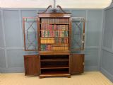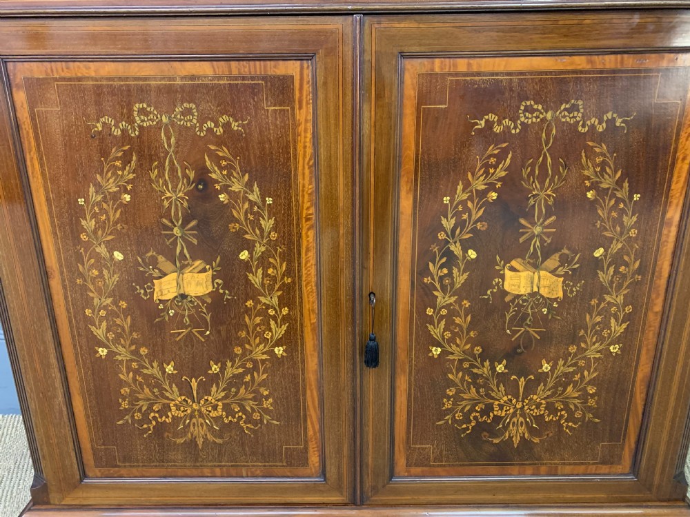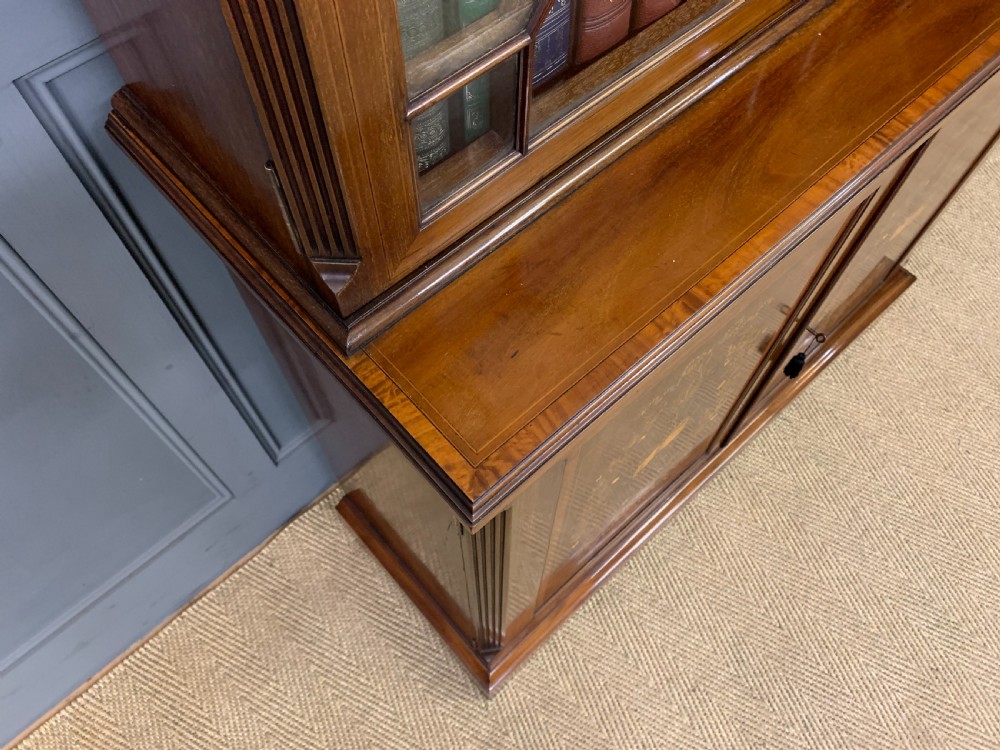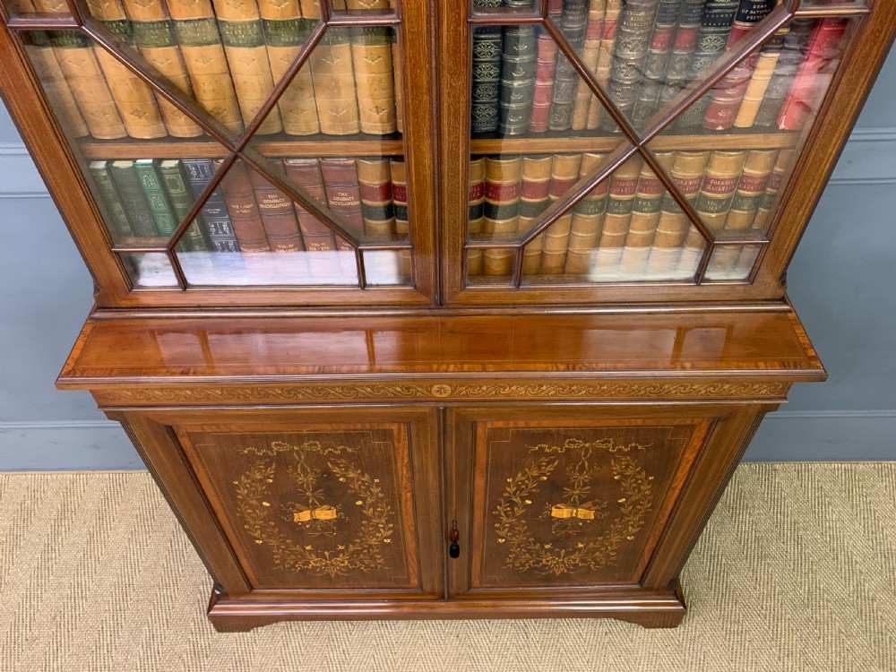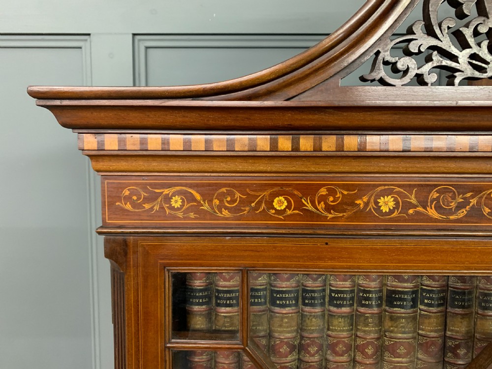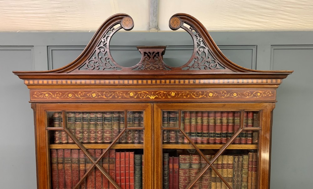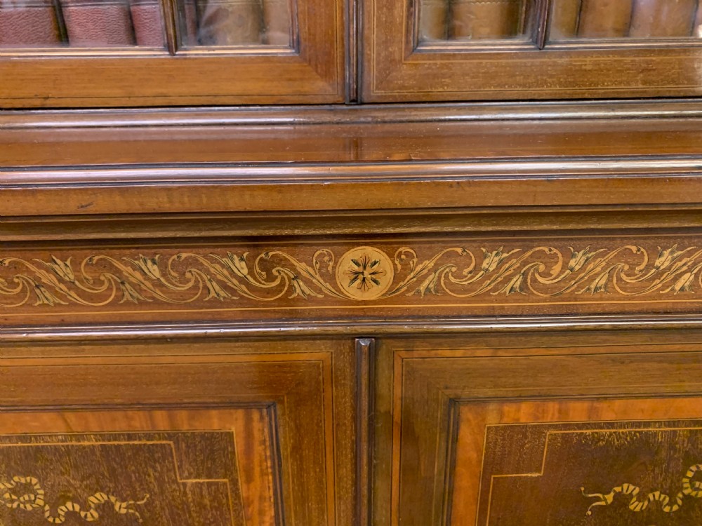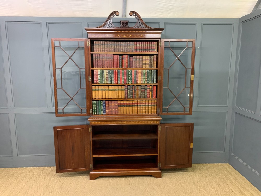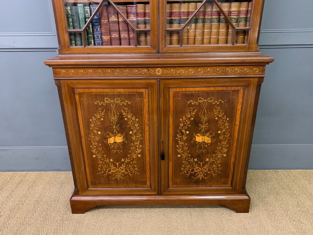 A superb quality inlaid mahogany bookcase by Edwards and Roberts of London. Late 19th century and of fine construction in solid mahogany and attractive mahogany veneers. Embellished with boxwood stringing and satinwood banding throughout. With floral inlaid detailing to the freeze and with profuse floral marquetry inlaid panels to the cupboard doors. The bookcase top with a pair of glazed doors which open to access an interior with adjustable shelving. The top section is surmounted by a broken arch swan neck pediment in open fretwork. The bottom section with a pair of cupboard doors which open to reveal an interior with adjustable shelving. All doors are lockable (keys supplied). Both bottom and top sections with canted corners. Sympathetically refinished in our workshops to a very high standard. Now offered for sale in excellent condition with a rich colour and patina. Splits into two sections for ease of installation.