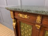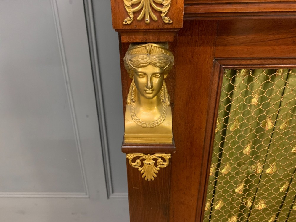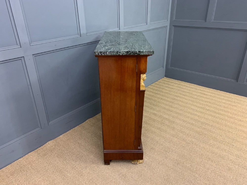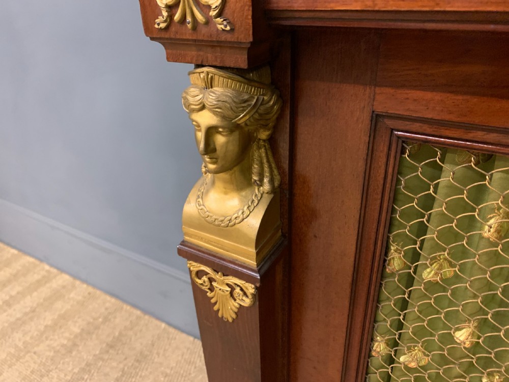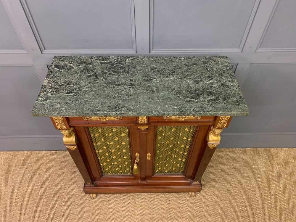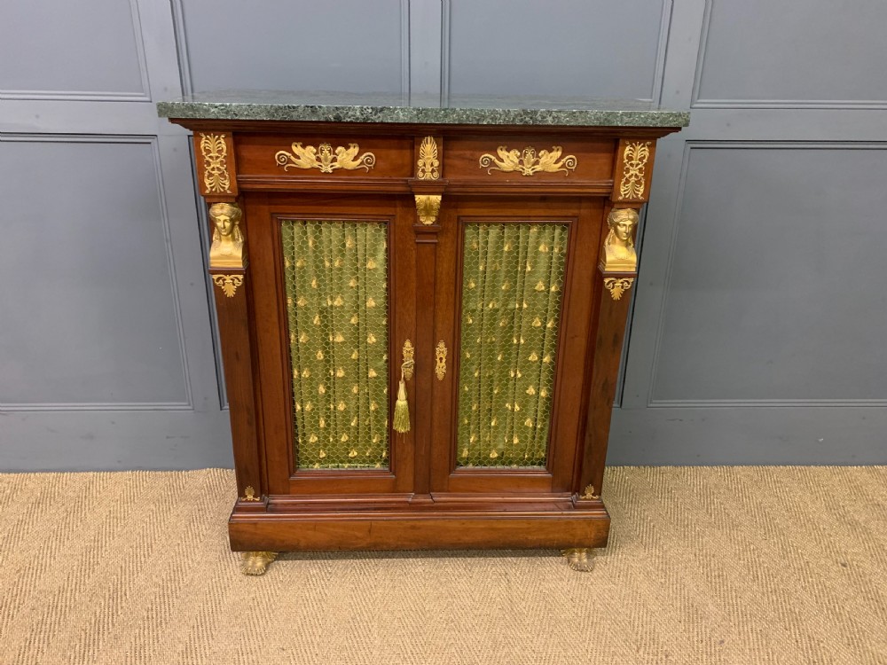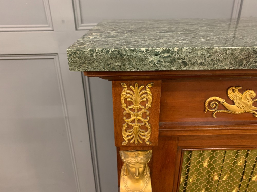 A splendid 19th century mahogany French Empire chiffonier, or side cabinet. Of excellent construction in mahogany with a varigated blue/green marble top. Embellished with fine quality crisply cast ormolu mounts. With a pair of doors (lockable, key supplied) fitted with brass grills with silk material behind. The doors open to reveal a shelved interior and are flanked by a pair of monopodia topped with female busts and terminating in elaborate feet. This stunning cabinet is offered for sale in very good original condition.