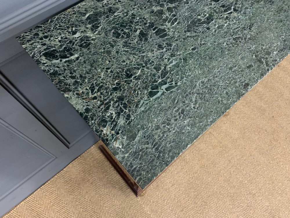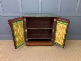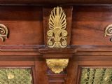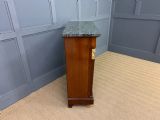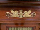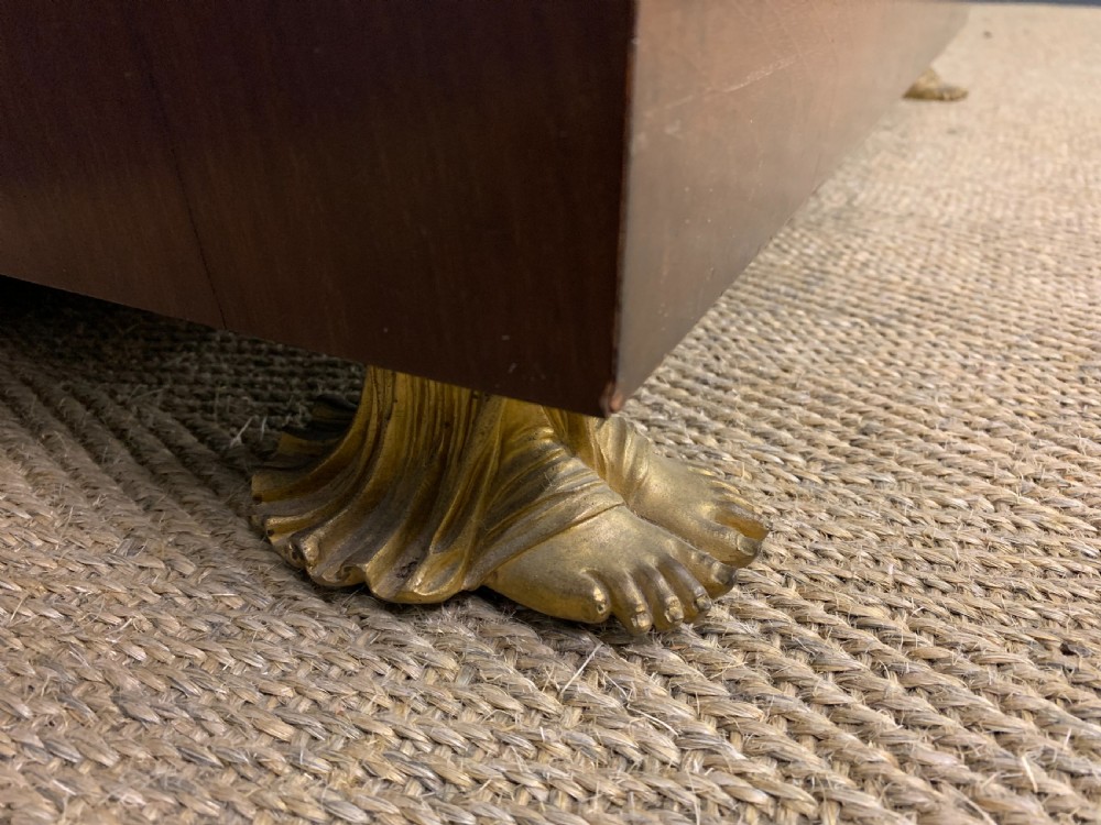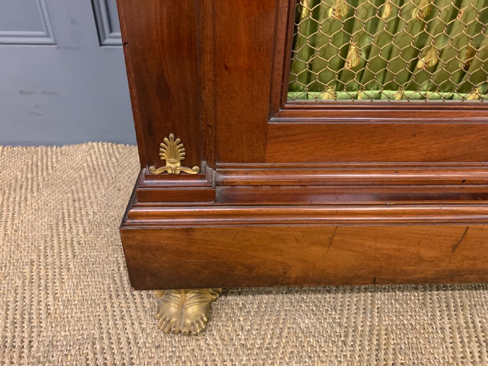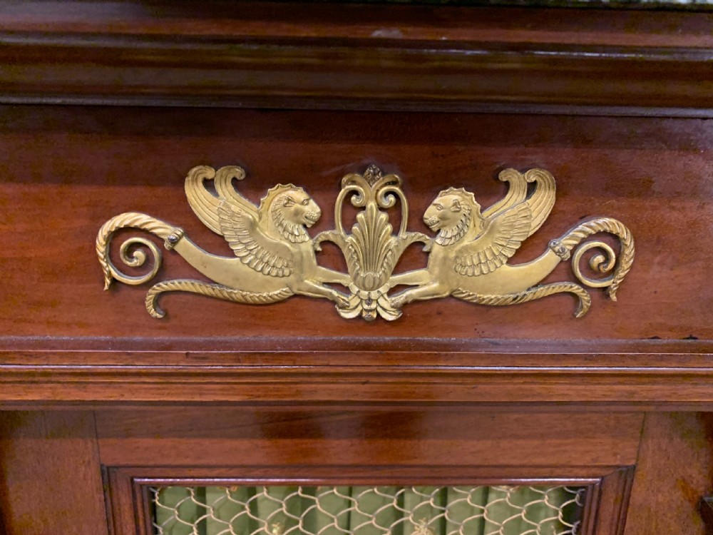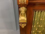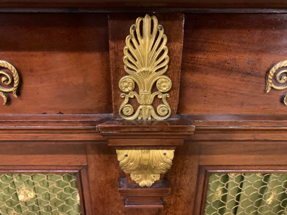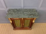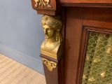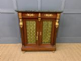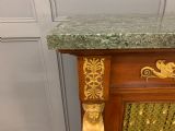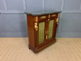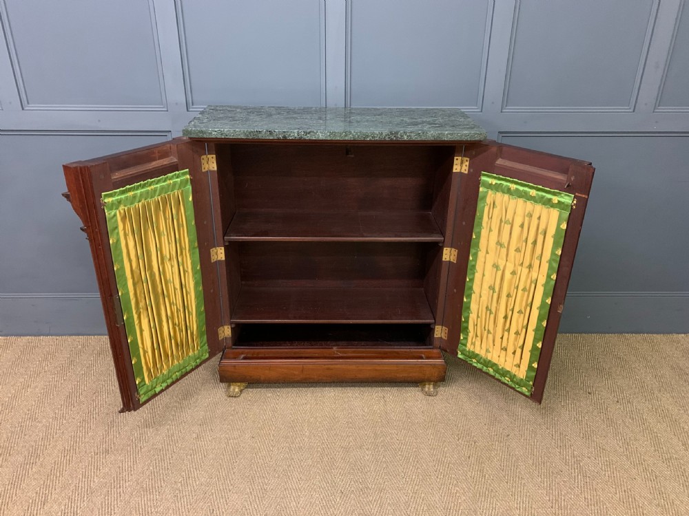 A splendid 19th century mahogany French Empire chiffonier, or side cabinet. Of excellent construction in mahogany with a varigated blue/green marble top. Embellished with fine quality crisply cast ormolu mounts. With a pair of doors (lockable, key supplied) fitted with brass grills with silk material behind. The doors open to reveal a shelved interior and are flanked by a pair of monopodia topped with female busts and terminating in elaborate feet. This stunning cabinet is offered for sale in very good original condition.