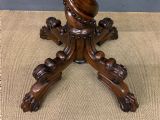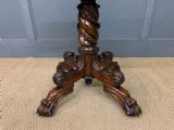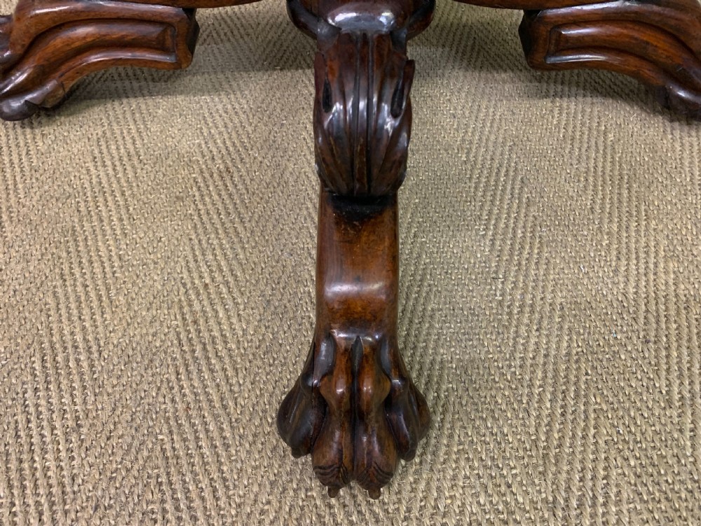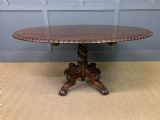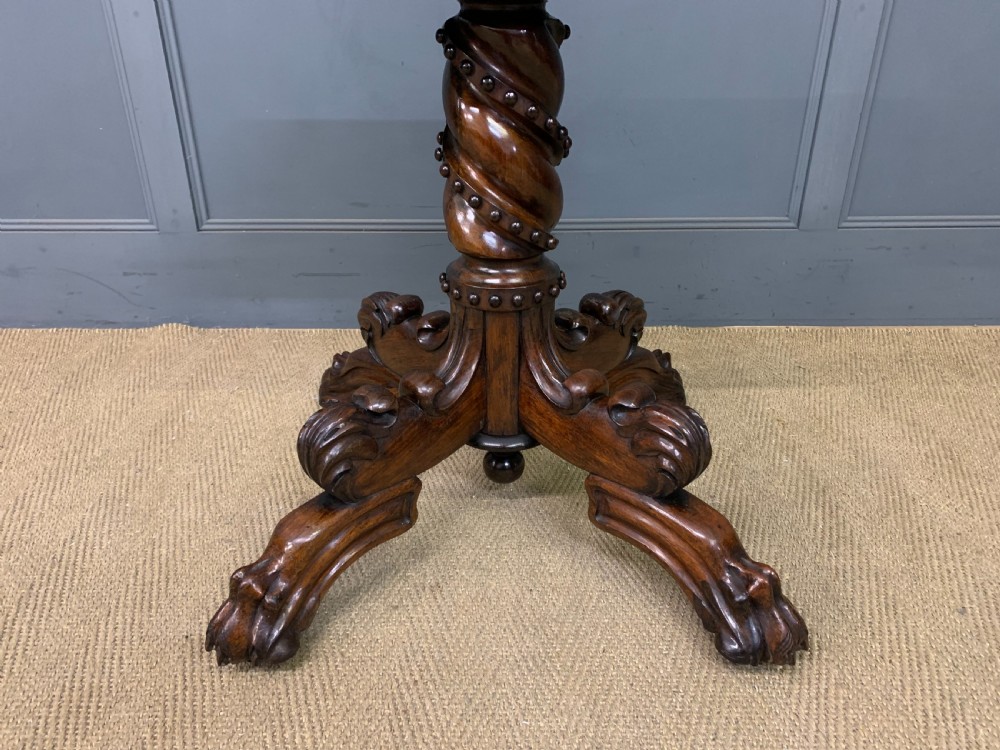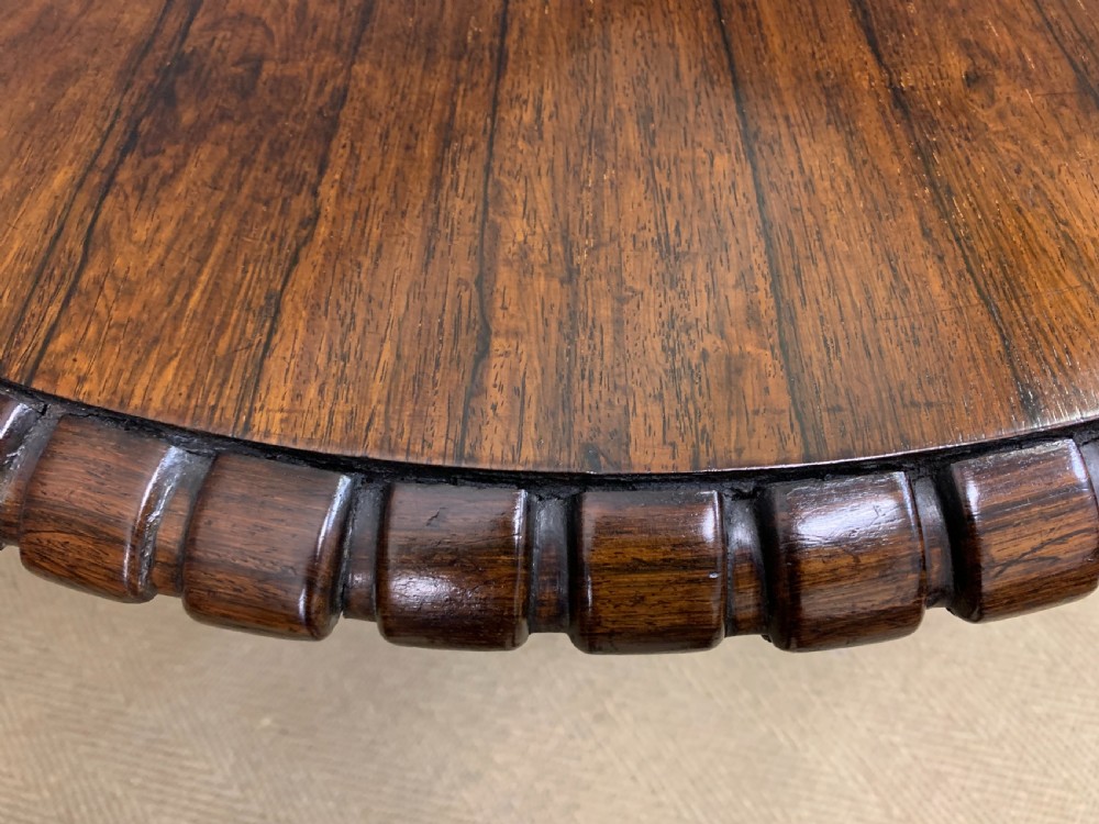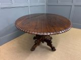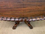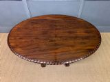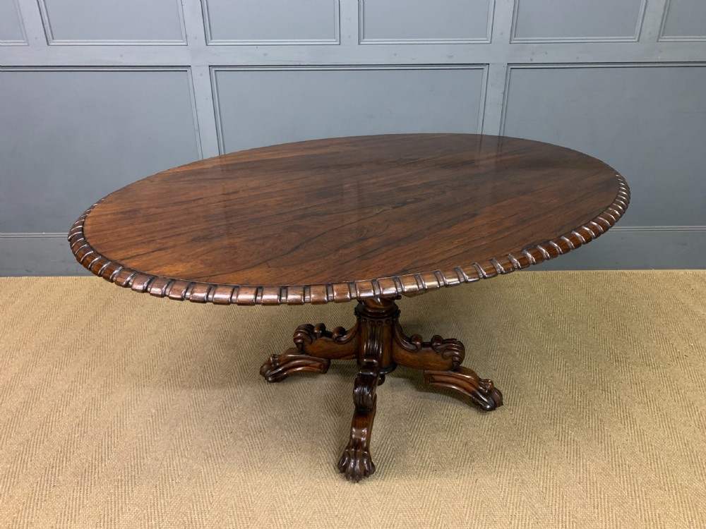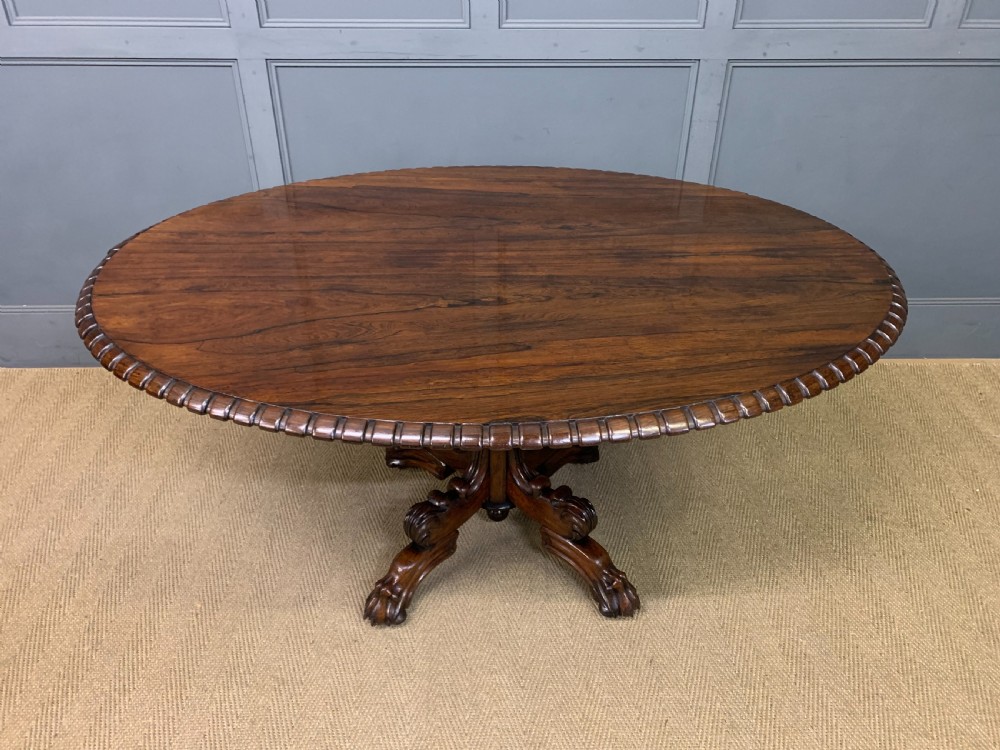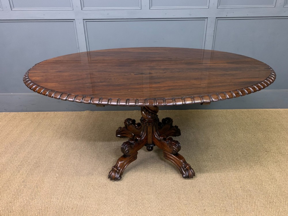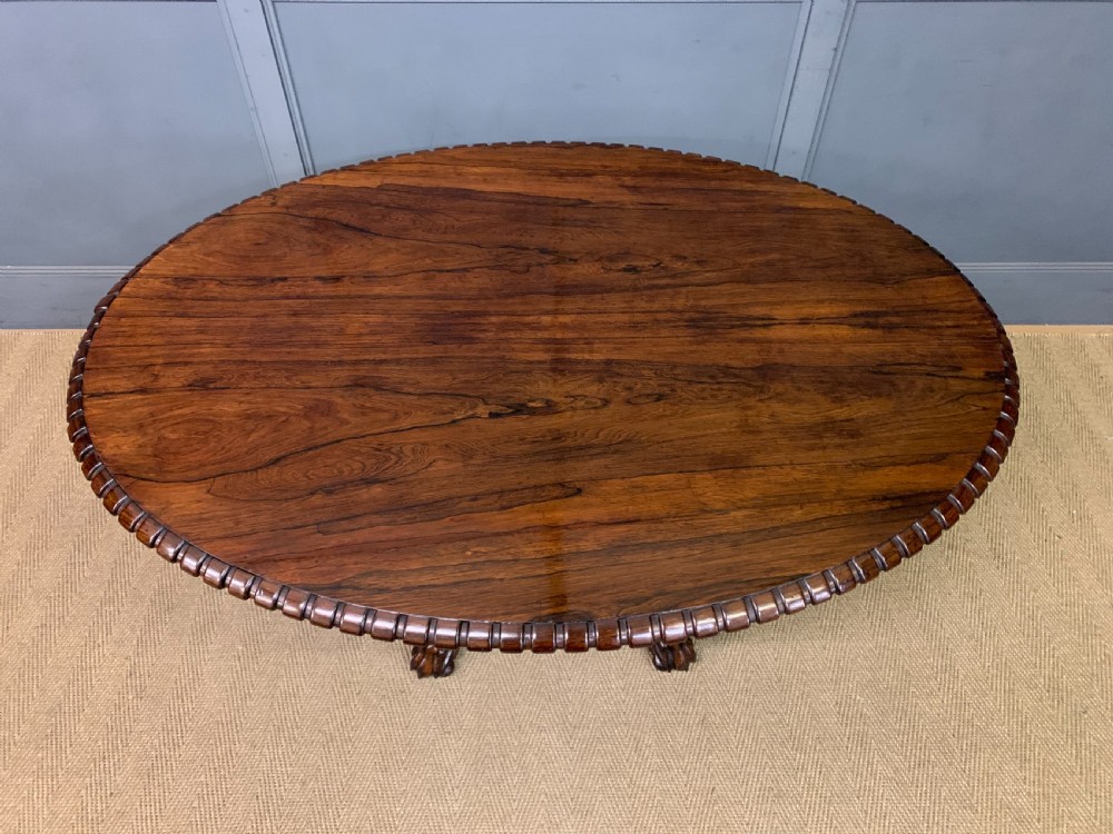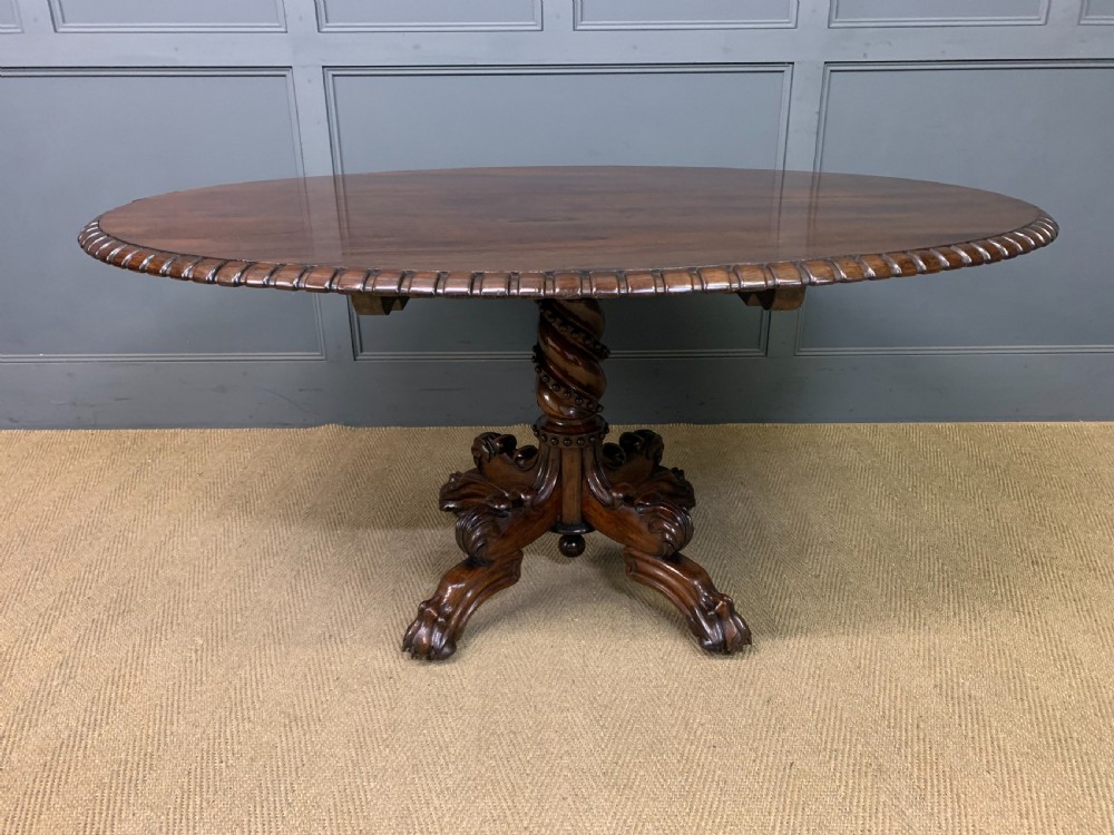 A superb late Regency period centre, or breakfast table. Very well constructed in solid rosewood with attractive rosewood veneers. The oval top has a gadrooned border. The elaborate base has a spiral twist column with four legs terminating in lions paw feet with recessed brass castors beneath. The top can be tilted up if desired. Sympathetically repolished in our workshops and now offered for sale in very good condition, with a great colour and patina. Splits into two sections for ease of installation. Dimensions: Width 152cms Depth 113cms Height 72.5cms Internal Ref: 18386