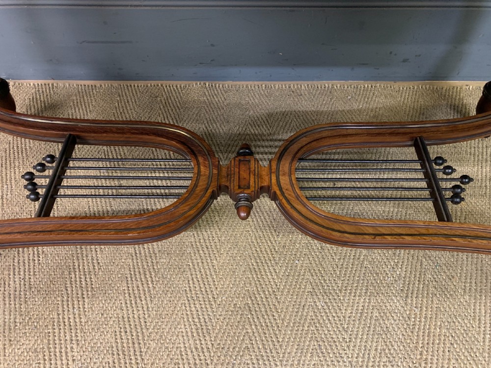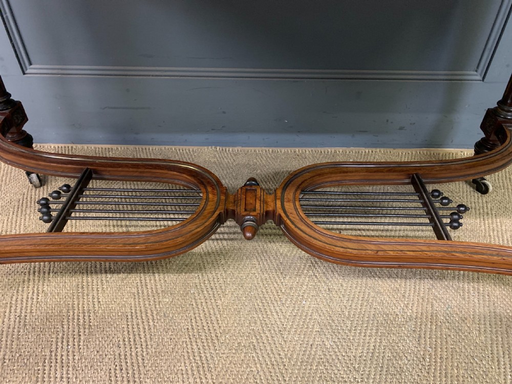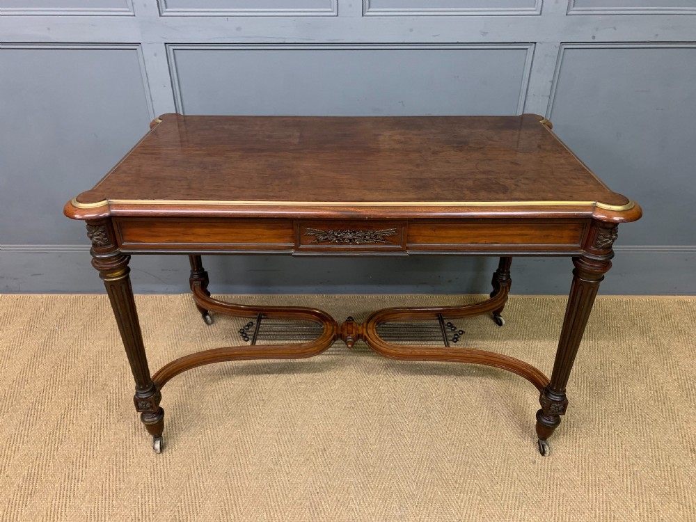 A fine quality mid 19th century, Louis Philippe period, French library table. Of excellent construction in solid mahogany and embellished with crisply cast gilt bronze mounts and fitted with brass banding and fluting throughout. With a single long drawer to the front, replete with a central gilt bronze mount (repeated to the rear of the table). Standing on elegant turned and fluted legs which terminate in original castors. United by a beautiful double lyre under-stretcher. Cleaned and waxed in our workshops and now offered for sale in very good orignal condition. Some minor historic marks to the top.