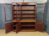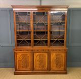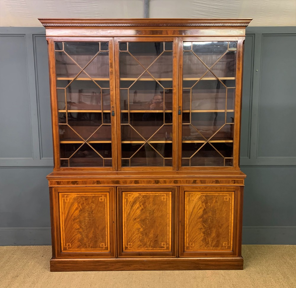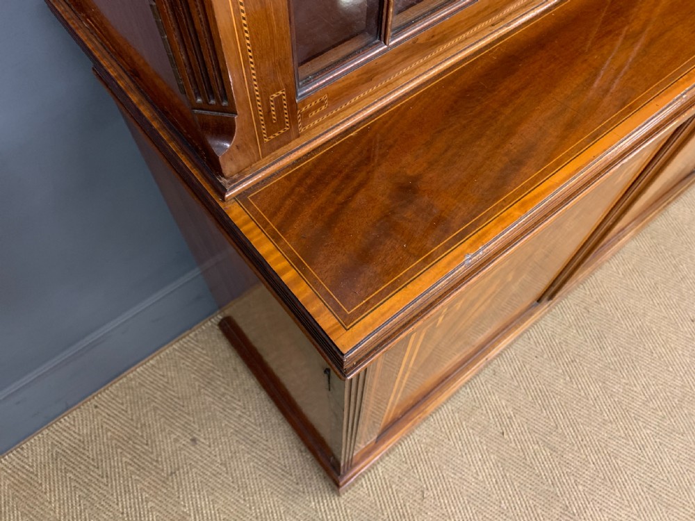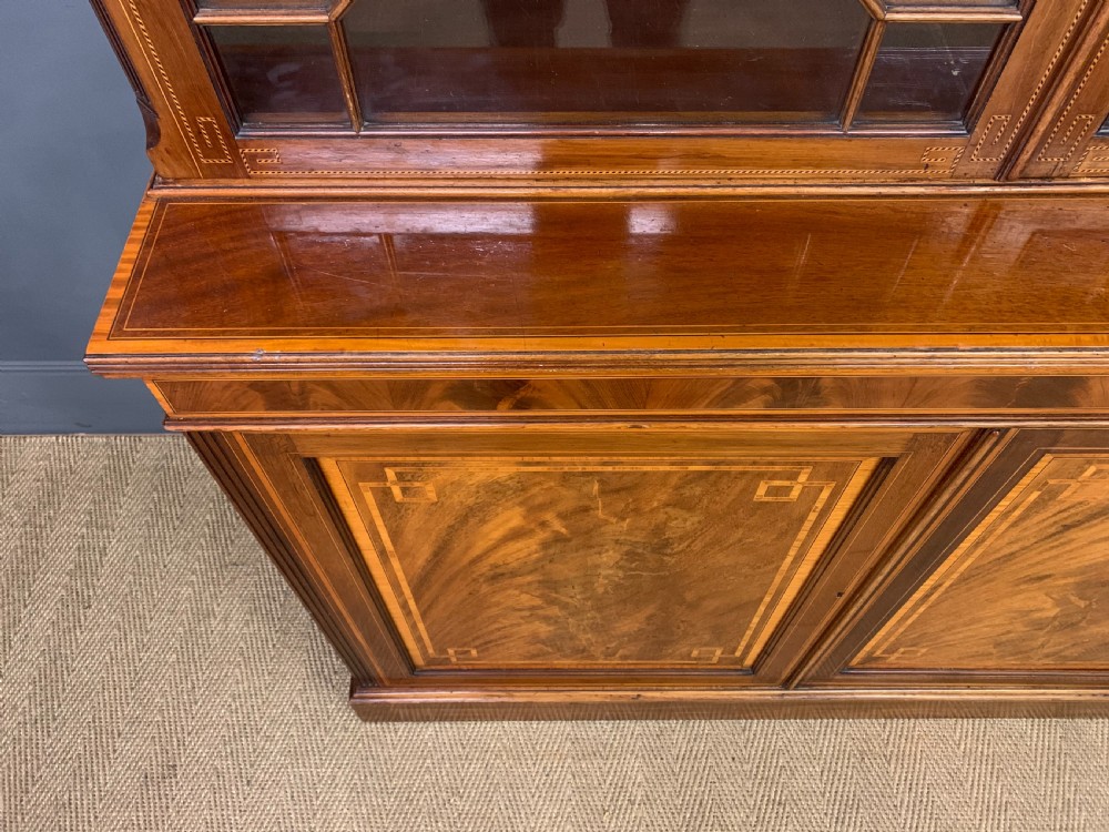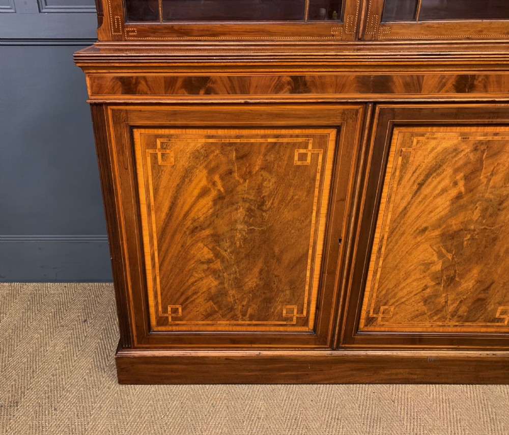A superb quality inlaid mahogany bookcase by Edwards and Roberts of London. Of fine construction in a dense grade of solid mahogany, with attractive flame mahogany veneers. Embellished with inlaid detailing in satinwood, boxwood and tulipwood throughout. With 3 glazed doors above 3 cupboard doors (all doors lockable, keys supplied). The glazed doors open to access interiors with adjustable shelving. The cupboard doors open to reveal further storage with shelving. All surmounted by an over-sailing cornice with greek key moldings. Offered for sale in excellent original condition. With a mellow colour and deep patina acquired over the years. Splits into 4 sections for ease of installation. Books not included. Dimensions: Width 194cms Depth 46cms Height 237cms Edwards & Roberts was founded in 1845, and had premises at 21 Wardour Street London. By 1892 they occupied more than a dozen buildings in Wardour Street, where they continued to trade until the end of the century. They became one of the leading London cabinet makers and retailers working in a variety of styles, both modern and revivalist. Their business also involved retailing, adapting and restoring the finest antique furniture and there are many examples of their earlier furniture with later embellishments bearing their stamp. Edwards & Roberts specialized in marquetry, inlay and ormolu. Internal Ref: 18389