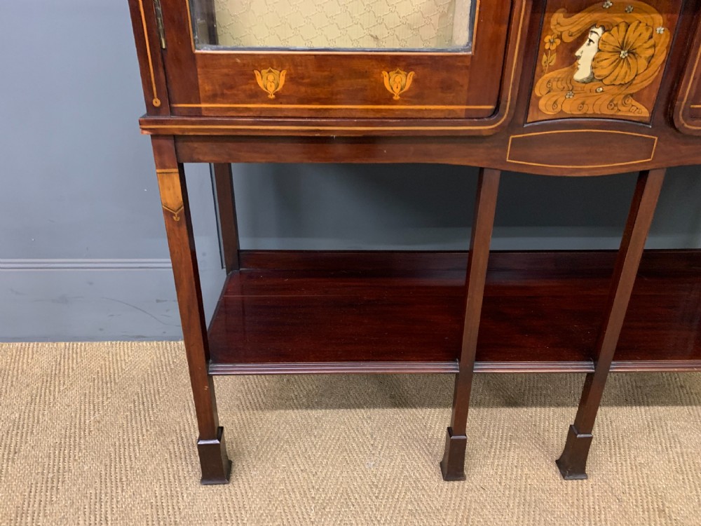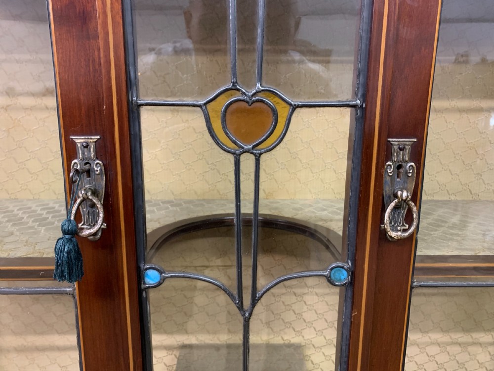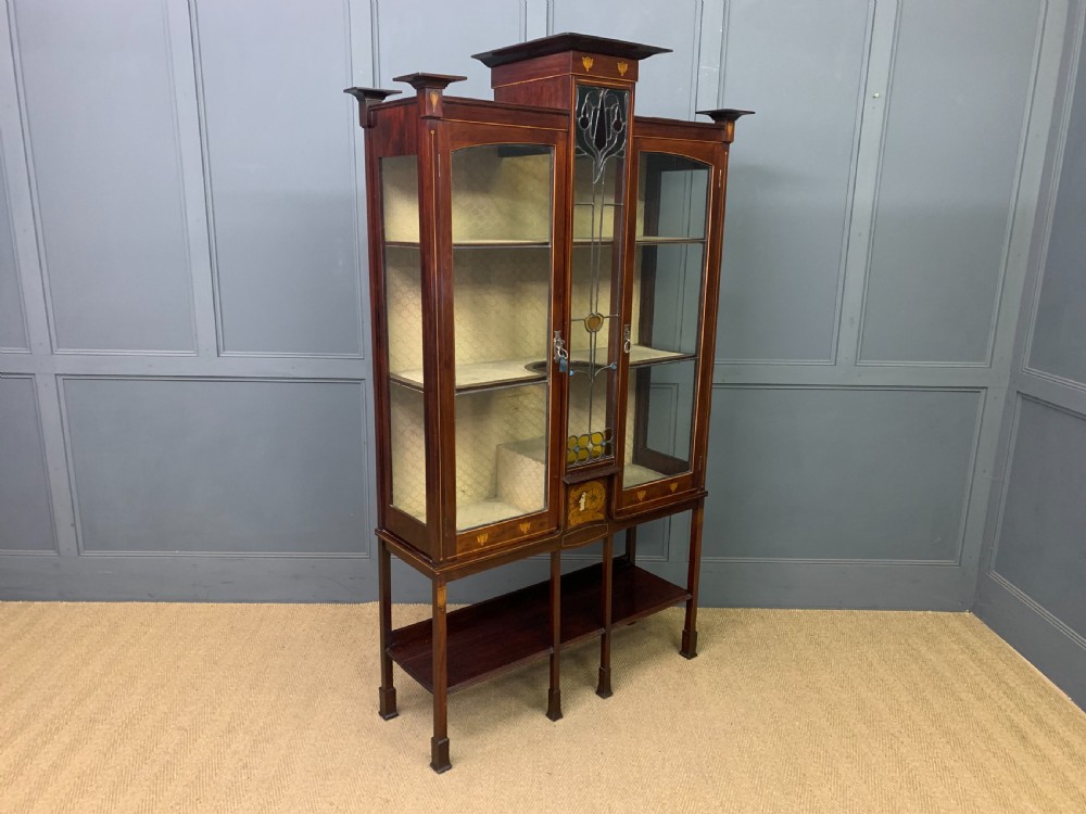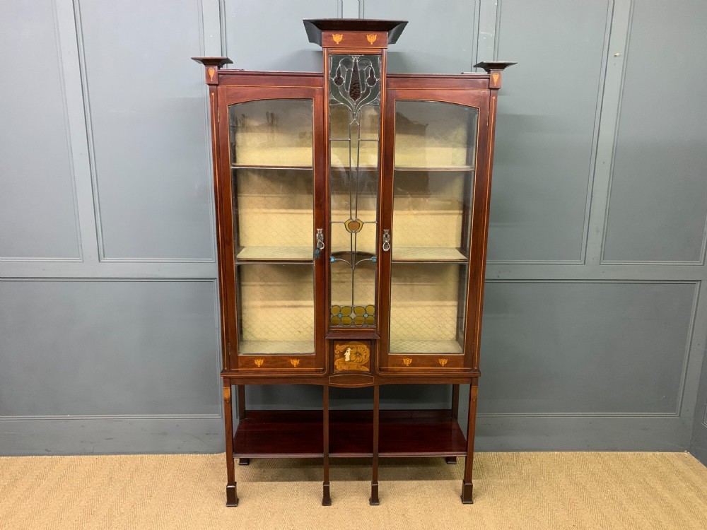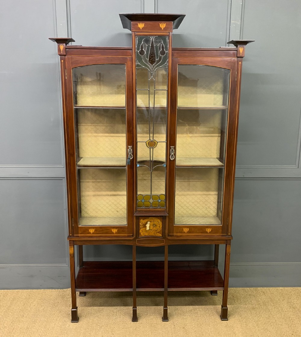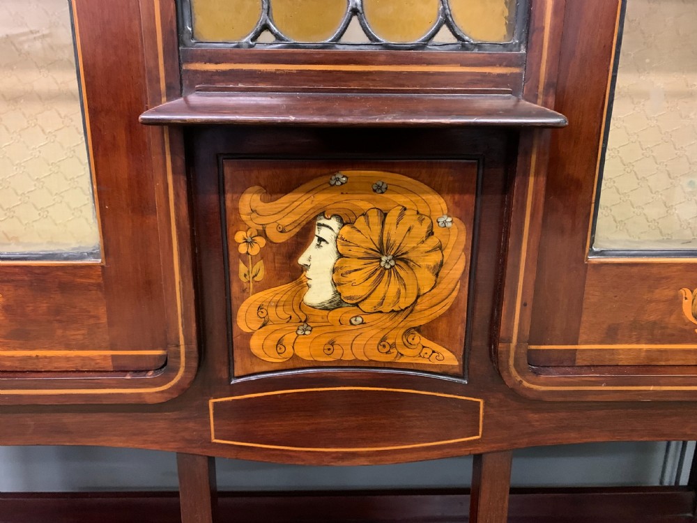 A splendid Arts and Crafts period display cabinet in the manner of Wylie and Lochhead. Of very good construction in solid mahogany and of good proportions. Decorated with stylised inlaid detailing throughout including an exquisite central panel of a maidens head. The central glazed panel is fitted with lovely leaded light glass which is in perfect condition. There are a pair of glazed doors (lockable, key supplied) which open to access a shelved and lined interior. All standing on long elegant legs which are united by an under tier. Cleaned and waxed in our workshops and now offered for sale in very good condition. Contents not included. Dimensions: Width 117cms Depth 40cms Height 198cms Internal Ref: 18390
