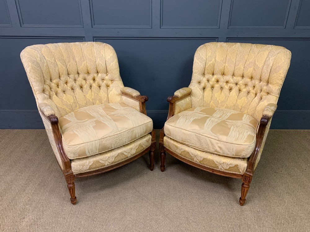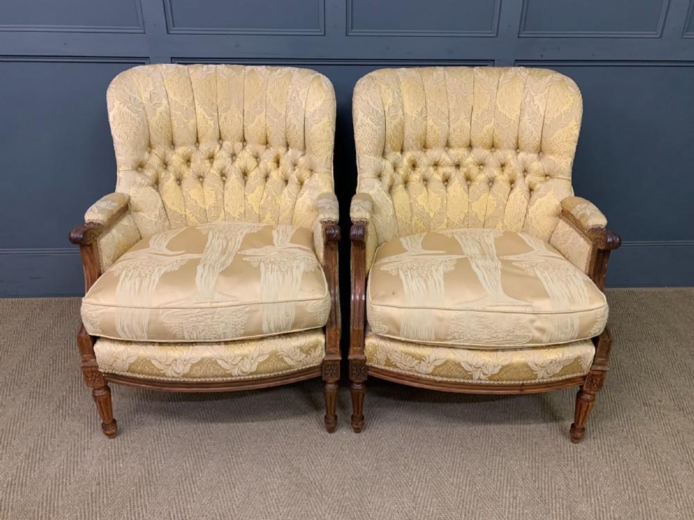 A lovely early 20th century French 3 piece salon suite. Well constructed in solid walnut with carved detailings. Consisting of a pair of armchairs and a settee. Well upholstered in yellow/gold fabric which is in good condition (some minor spotting and minor fraying to the cushions). The frames are strong and sturdy and the cushions comfortable. Offered for sale in good un-restored condition, some minor age related imperfections. Dimensions Settee Width 148cms Depth 75cms Overall height 92cms Seat height 48cms Armchairs Width 68cms Depth 70cms Overall height 91cms Seat height 48cms Internal Ref: 18392