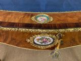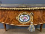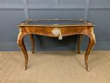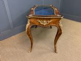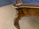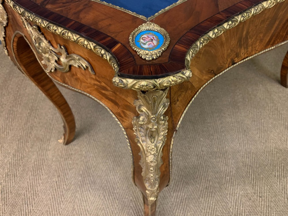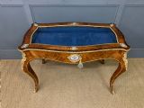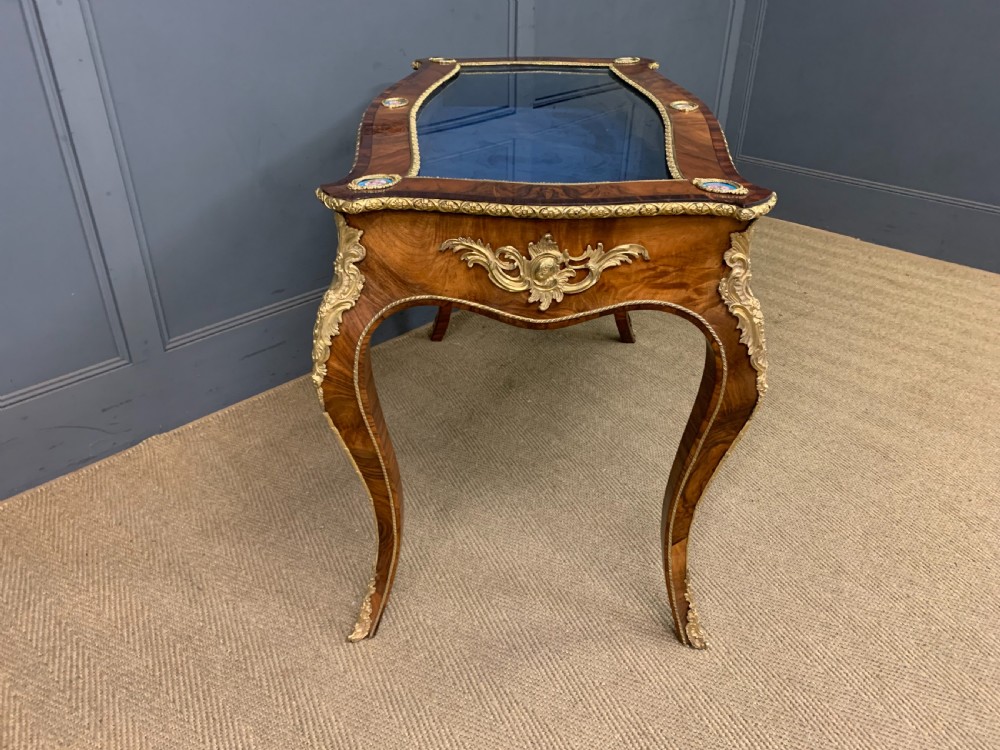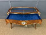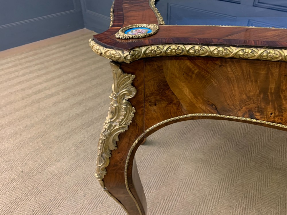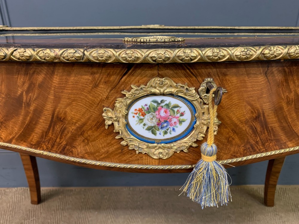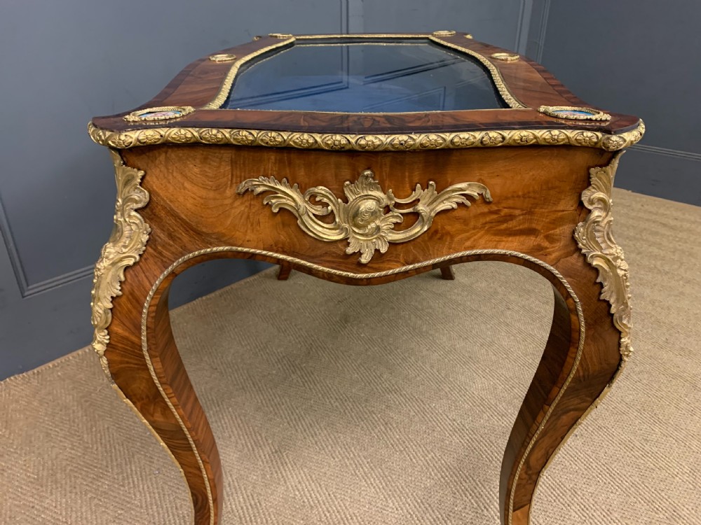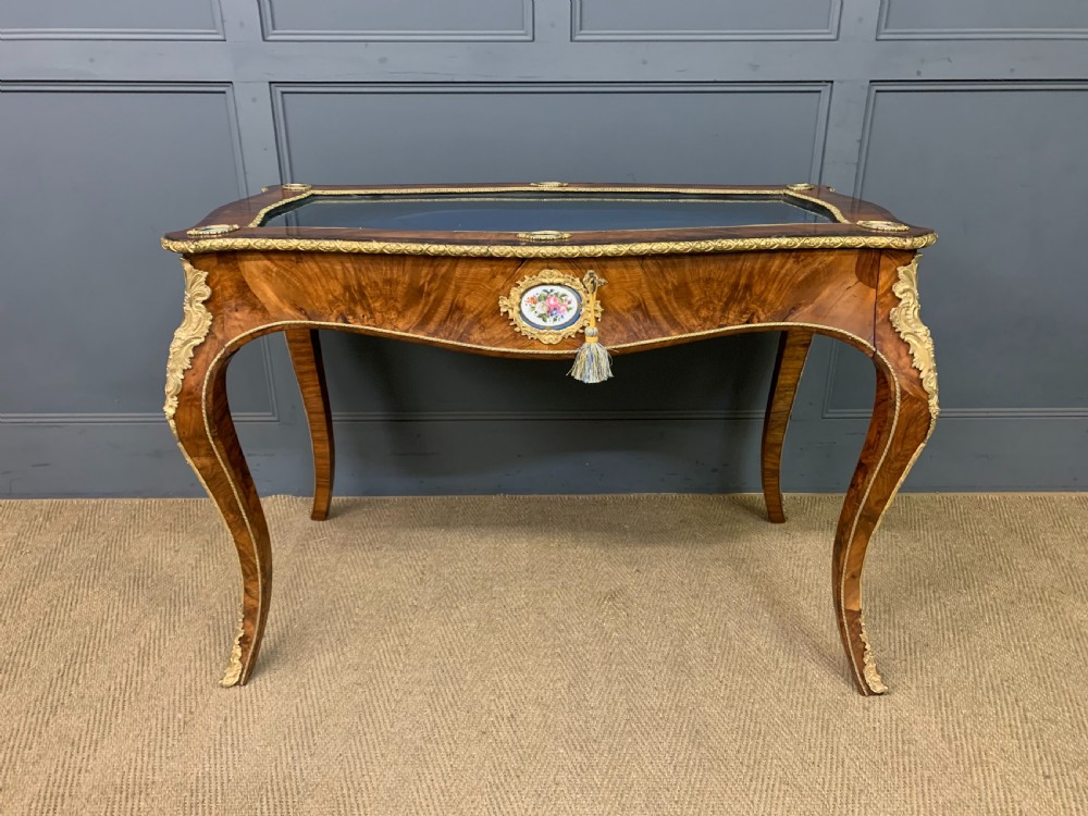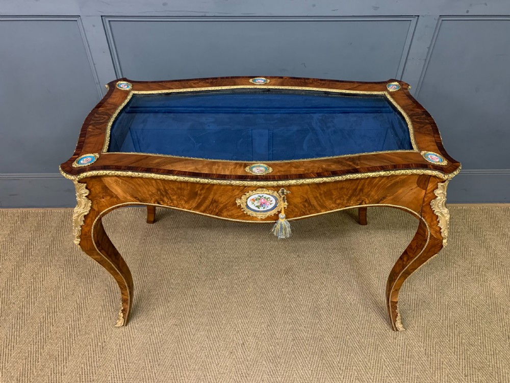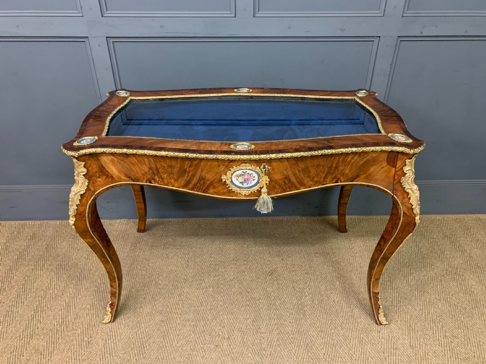 A superb 19th century figured walnut bijouterie table of the highest quality. Of serpentine form and of generous proportions. With attractive figured walnut veneers and adorned with crisply cast ormolu mounts throughout. The glazed top is cross banded in tulipwood and embellished with a series of 6 small sevres porcelain plaques. Larger porcelain plaques are to be found to the front and back of the table. There is a single drawer (lockable, key supplied) which opens to access the display space lined in blue velvet. Standing on elegant cabriole legs. Offered for sale in excellent condition, with a good colour and patina. A very fine example.