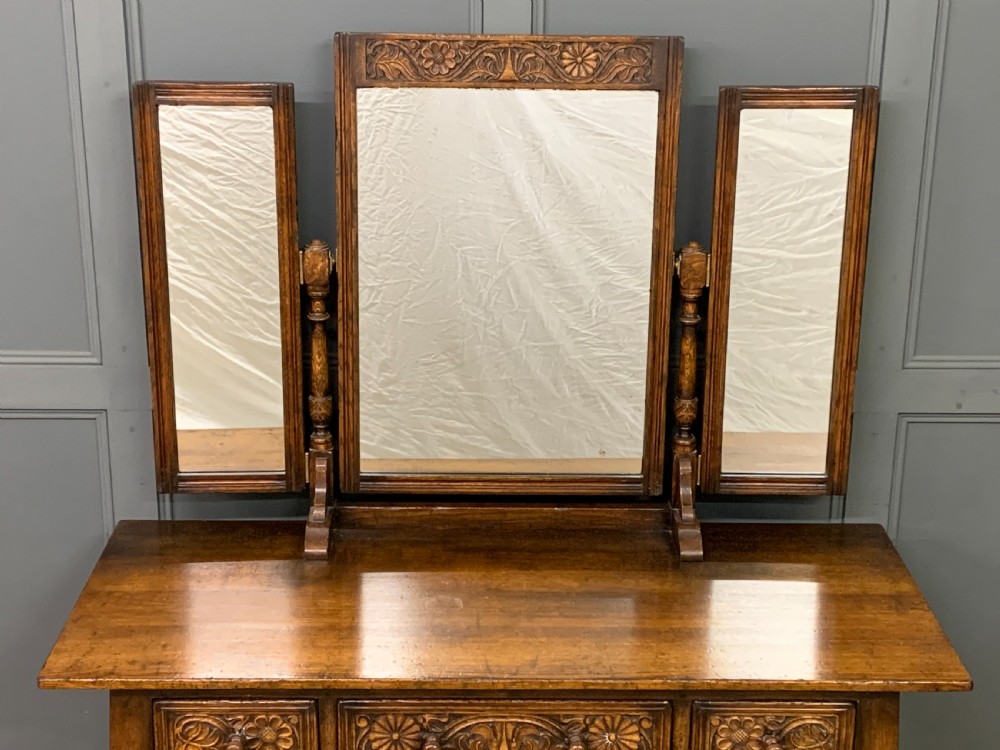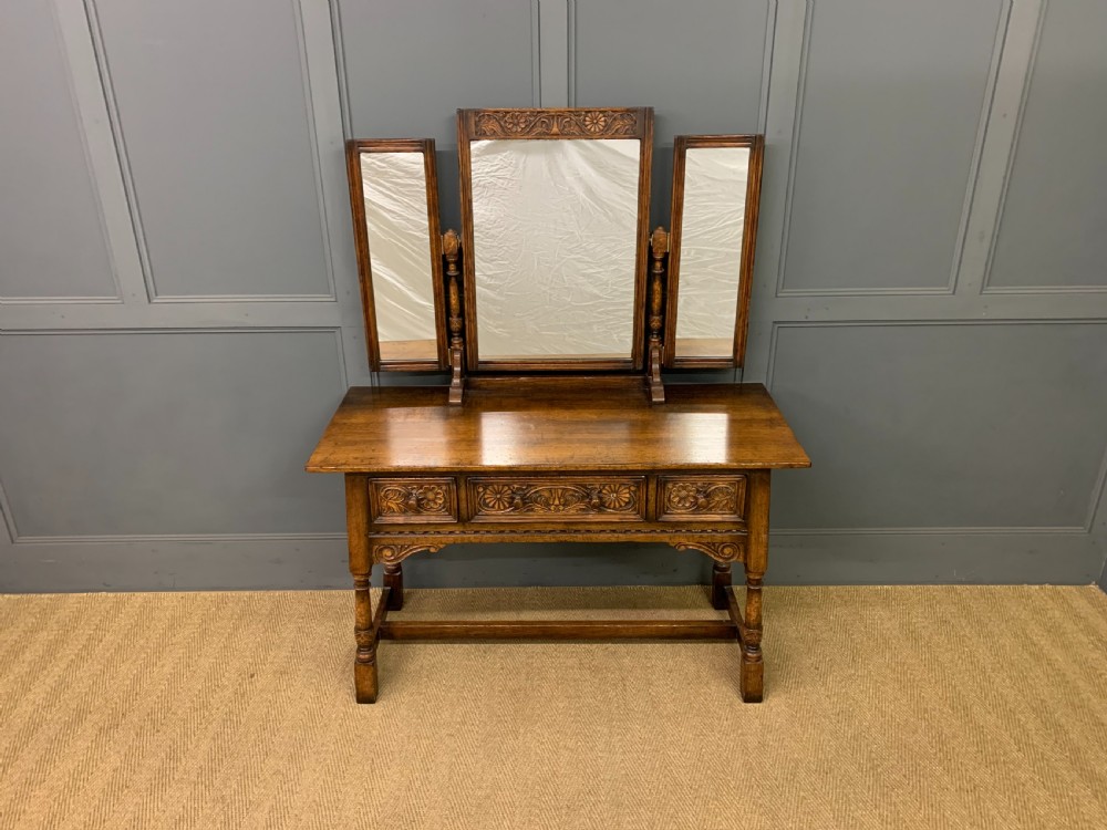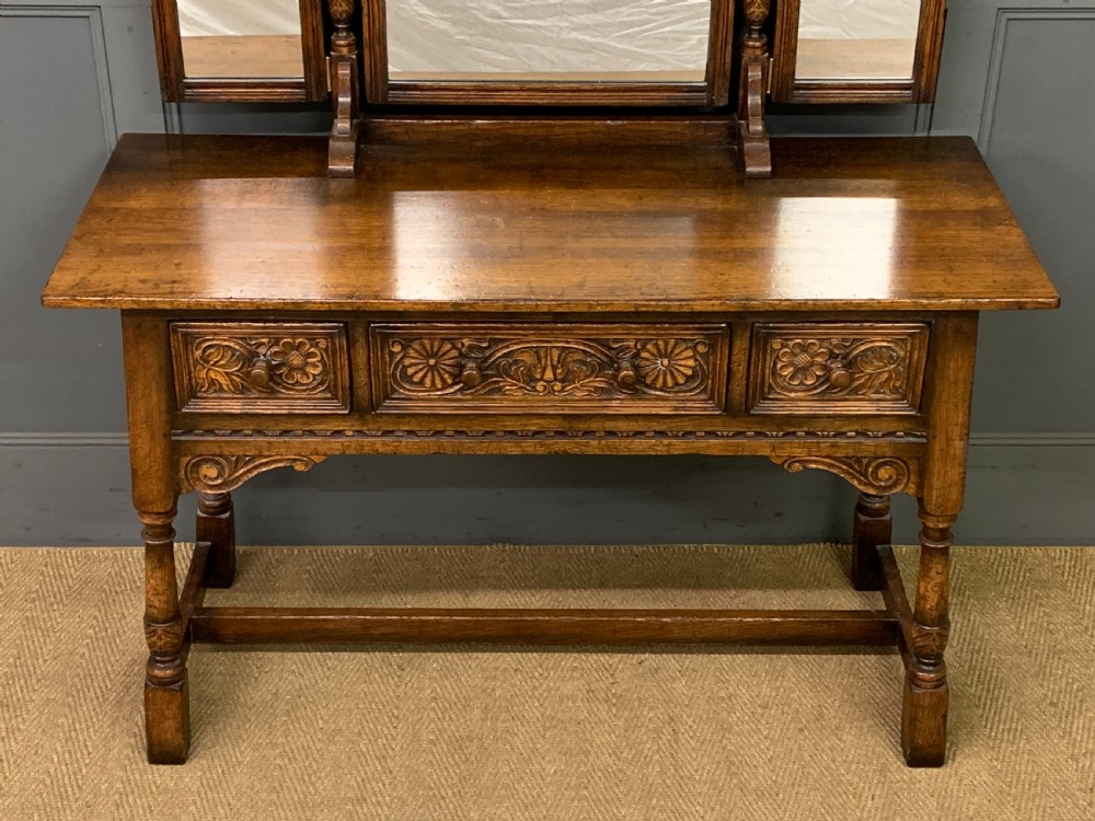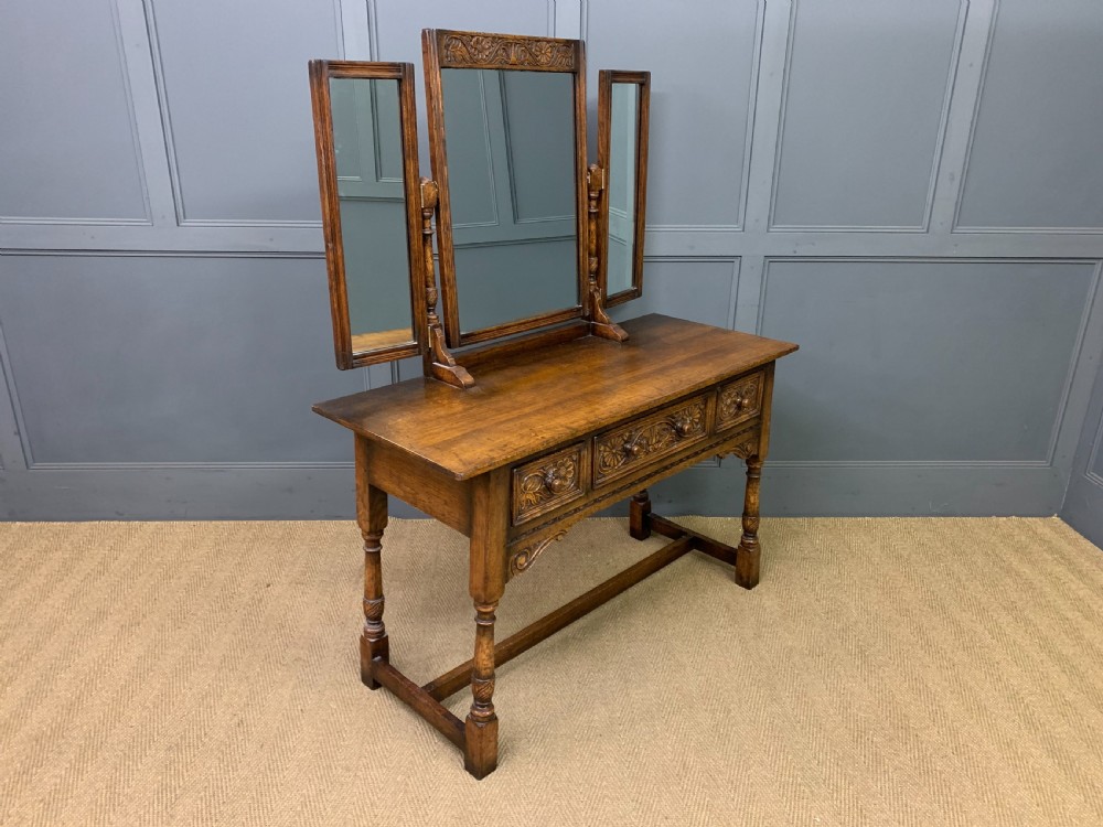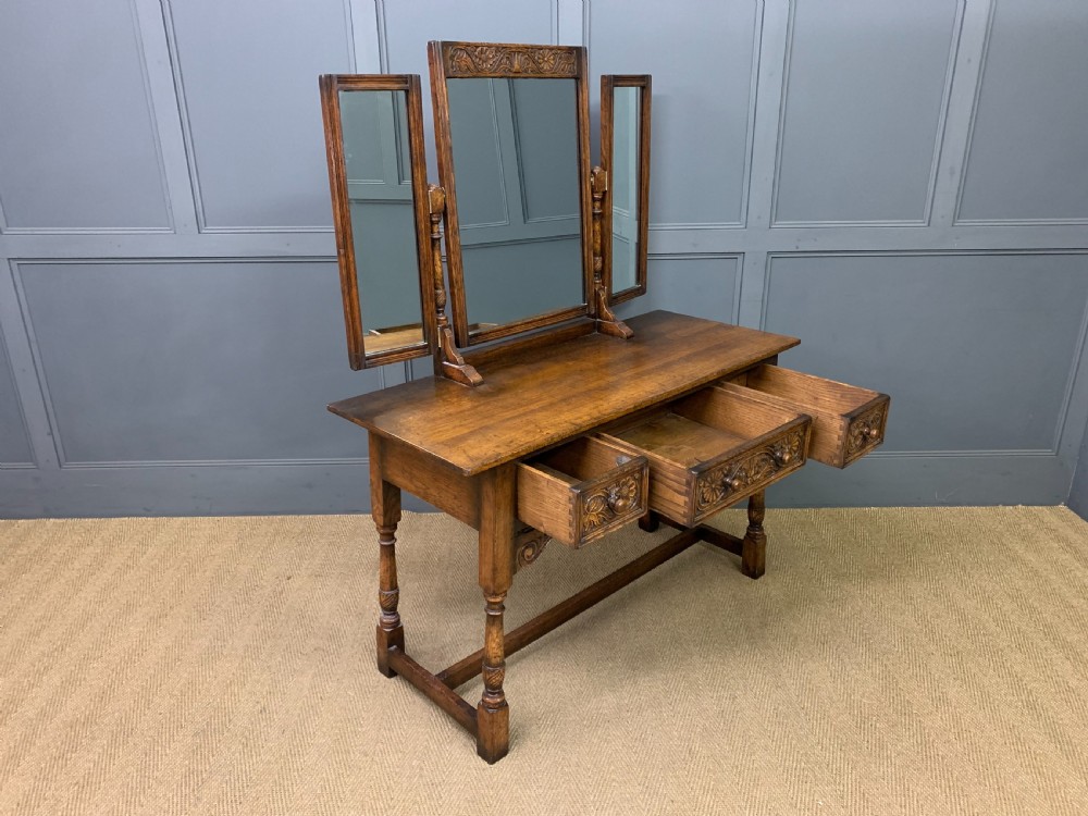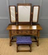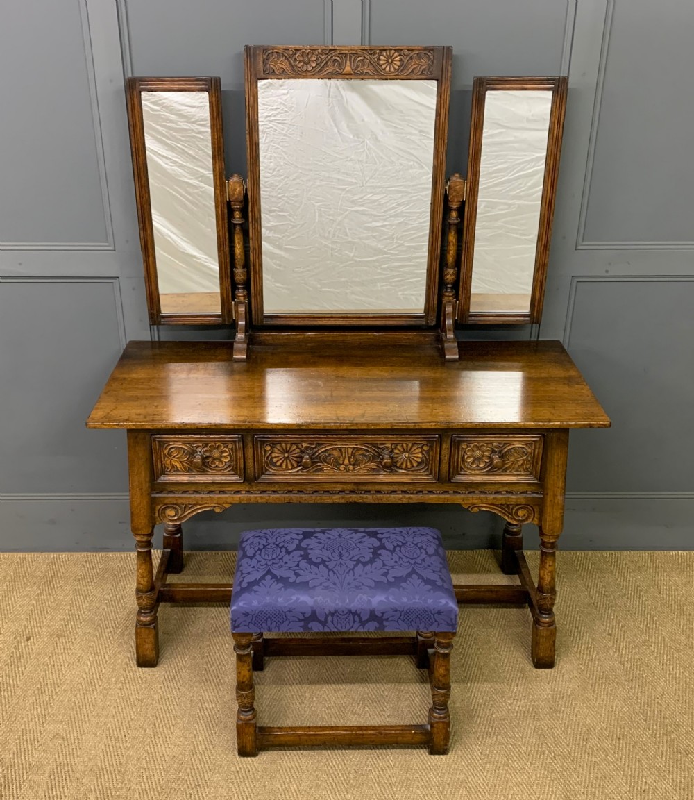 A charming Ipswich oak dressing table and matching stool by Titchmarsh and Goodwin of Ipswich. Very well constructed in solid English oak, now with a wonderful colour and patina. With triple mirrors, fully adjustable and an arrangement of 3 drawers. Decorated with crisply carved detailings to the drawer fronts and the top rail. The stool with blue upholstery which is in perfect condition. Cleaned and waxed in our workshops and now offered for sale in excellent overall condition. Dimensions: Width 122cms Depth 51cms Overall height 153cms Table height 76cms Internal Ref: 18397