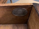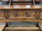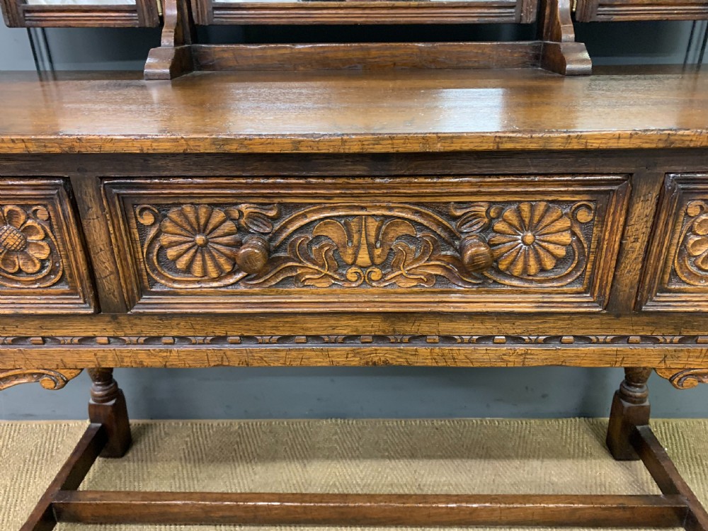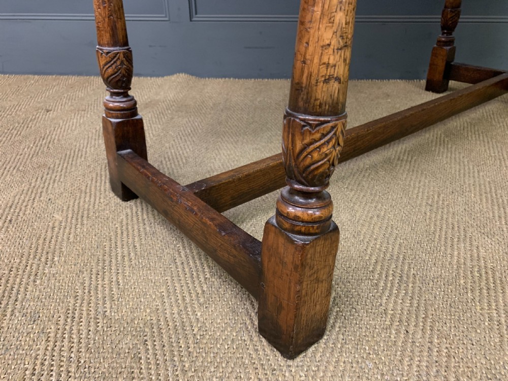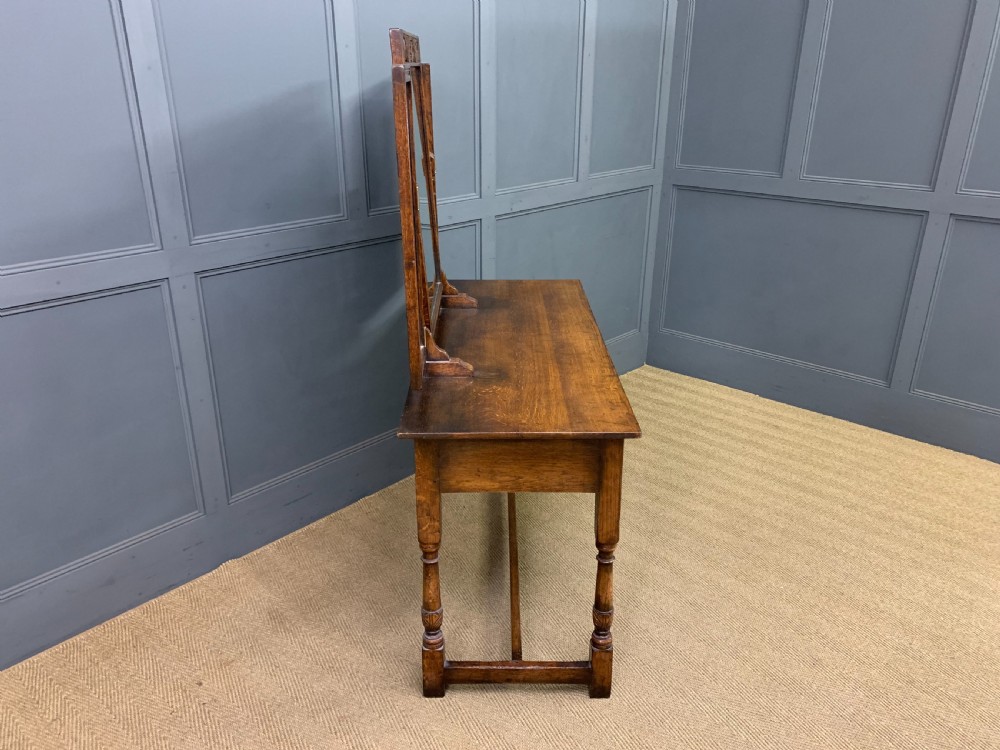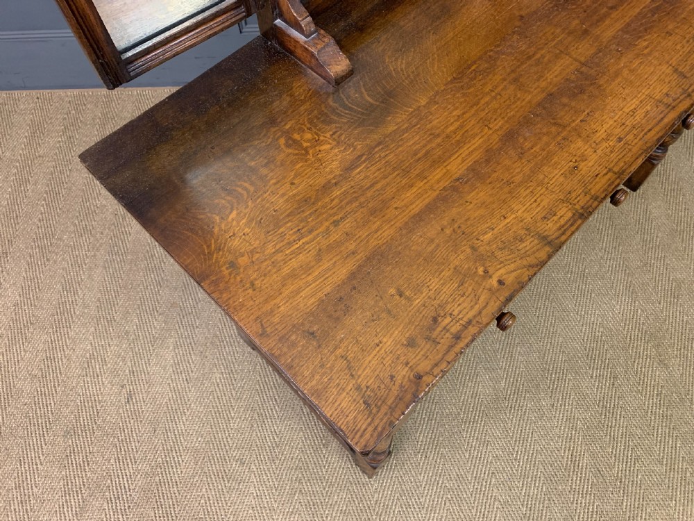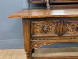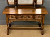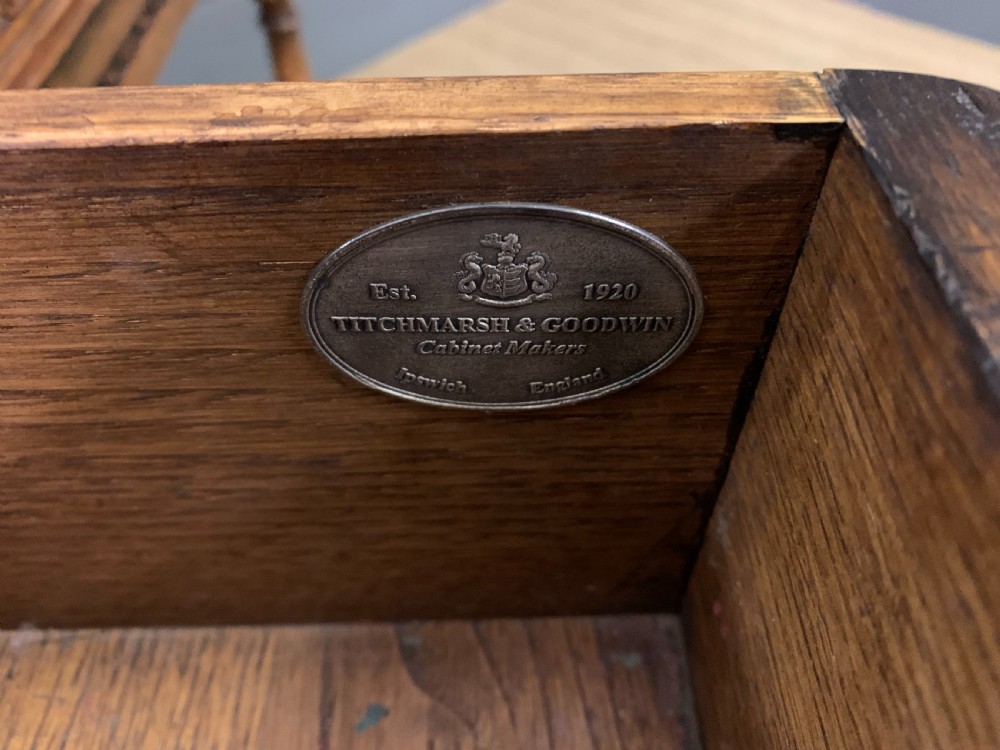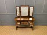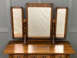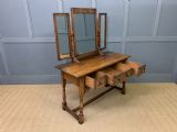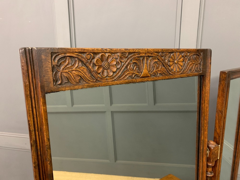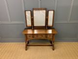 A charming Ipswich oak dressing table and matching stool by Titchmarsh and Goodwin of Ipswich. Very well constructed in solid English oak, now with a wonderful colour and patina. With triple mirrors, fully adjustable and an arrangement of 3 drawers. Decorated with crisply carved detailings to the drawer fronts and the top rail. The stool with blue upholstery which is in perfect condition. Cleaned and waxed in our workshops and now offered for sale in excellent overall condition. Dimensions: Width 122cms Depth 51cms Overall height 153cms Table height 76cms Internal Ref: 18397