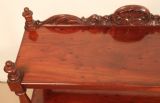 A very good early Victorian buffet (or dumb waiter) in solid mahogany. With 3 tiers, supported by turned columns and all standing on original brass caps and castors. The top tier is decorated with a crisply carved ornamental upright gallery. The "plum pudding" mahogany timber used for the tiers is very attractive. This handsome and practical piece of furniture is offered for sale in very good original condition.