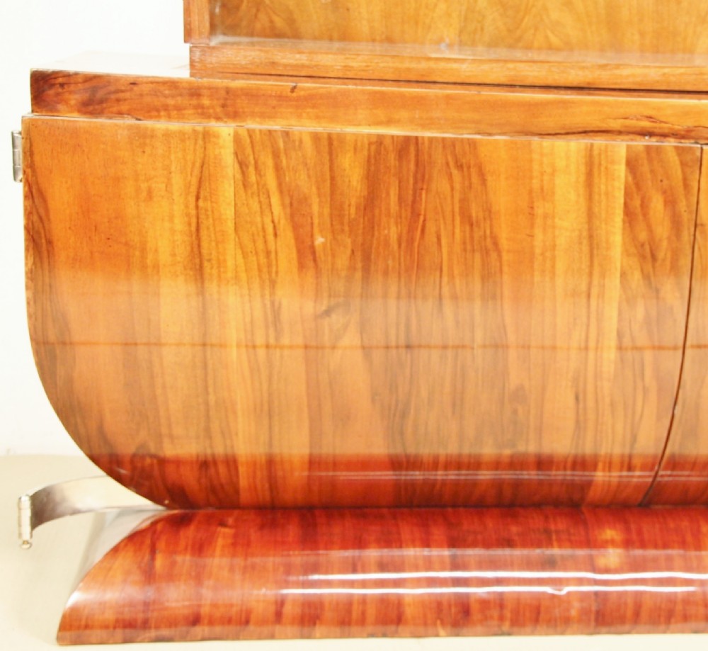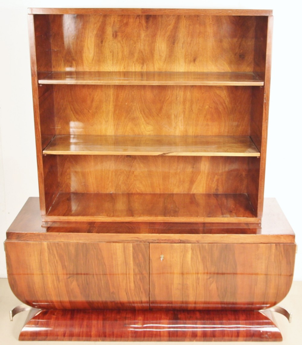 A rare Art Deco walnut bookcase, incredible design with boat shaped base and open shelves to the top. Made to the highest quality using lovely walnut and chrome hinges and hardware.
