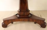 A fine quality round mahogany dining table from the William IV period. Of fine construction using an excellent grade of solid mahogany timber. The graining to the timber in the table top is superb. The round top has a nice deep freeze which is decorated with bobbin moudlings. The tri-from base is very elegant and each leg terminates in a wonderful scrolled foot , each with its original castor present. The table top tilts up if desired to further exhibit its beauty. This table could serve equally well as a dining table (seating up to 6) or as a center table. We have had this table sympathetically repolished to a very high standard. It is now offered for sale in excellent condition with a lovely depth of colour and patina.