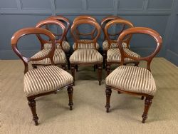 A very good set of 4 mid Victorian period cabriole legged dining chairs. Well made in dense solid rosewood, now withe a great colour and patina. With balloon backs and scrolling cabriole legs, the frames are sturdy and in very good order. Decorated throughout with carved scrolling detailing. In need of re-upholstering (please ask for a quotation).