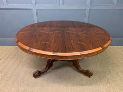 A lovely mid-Victorian period burr walnut loo, or supper, table. Of excellent construction in solid walnut and stunning burr walnut veneers. The shaped top is fitted with attractive burr walnut veneers and is surrounded by a thumb-nail molding to the edge. The quadraform base is in solid walnut with carved decorations; the legs terminate in their original brass castors. the table top can be tilted up for display purposes when not in use. This table will sit 6 people. It splits into two sections for ease of installation. Sympathetically refinished in our workshops and now offered for sale in excellent condition, with a great colour and patina, ready to go straight into the home,