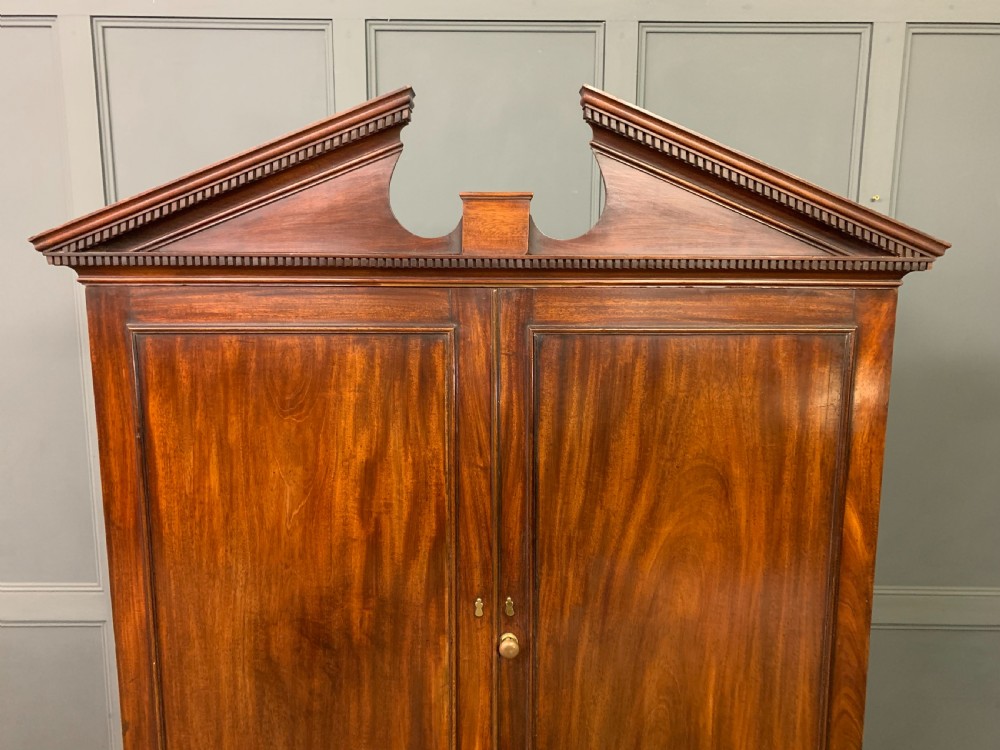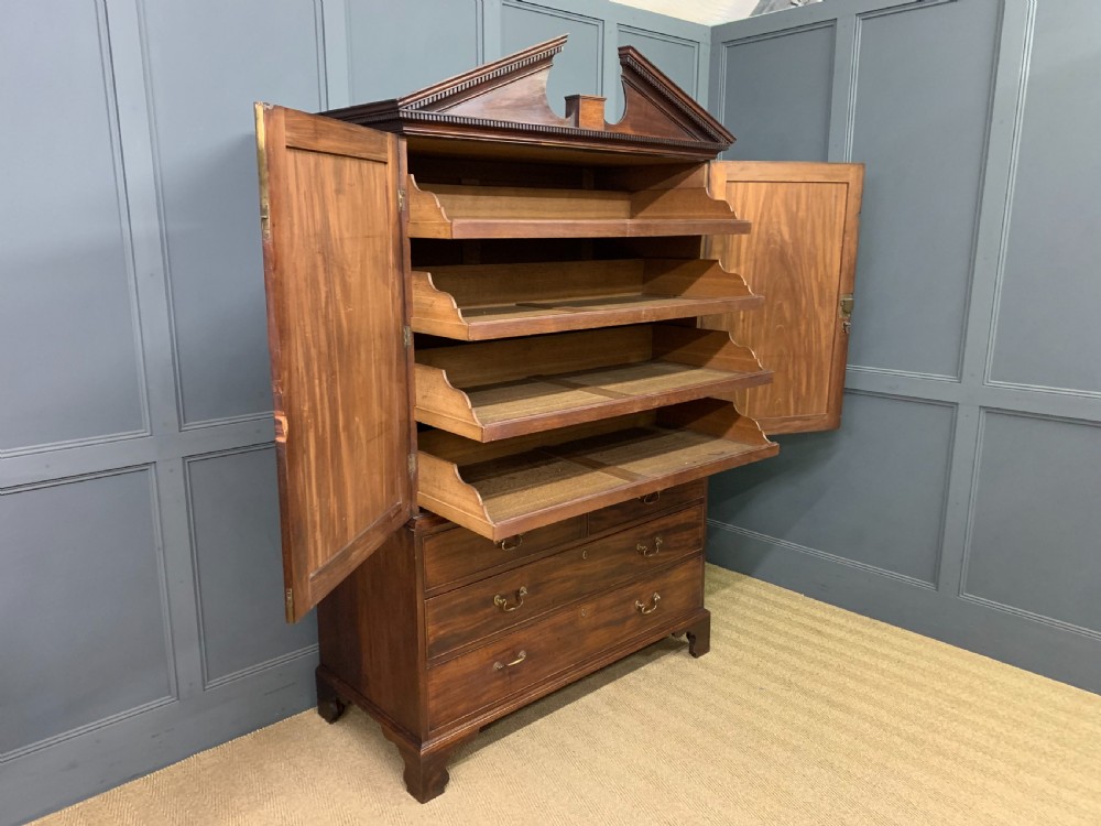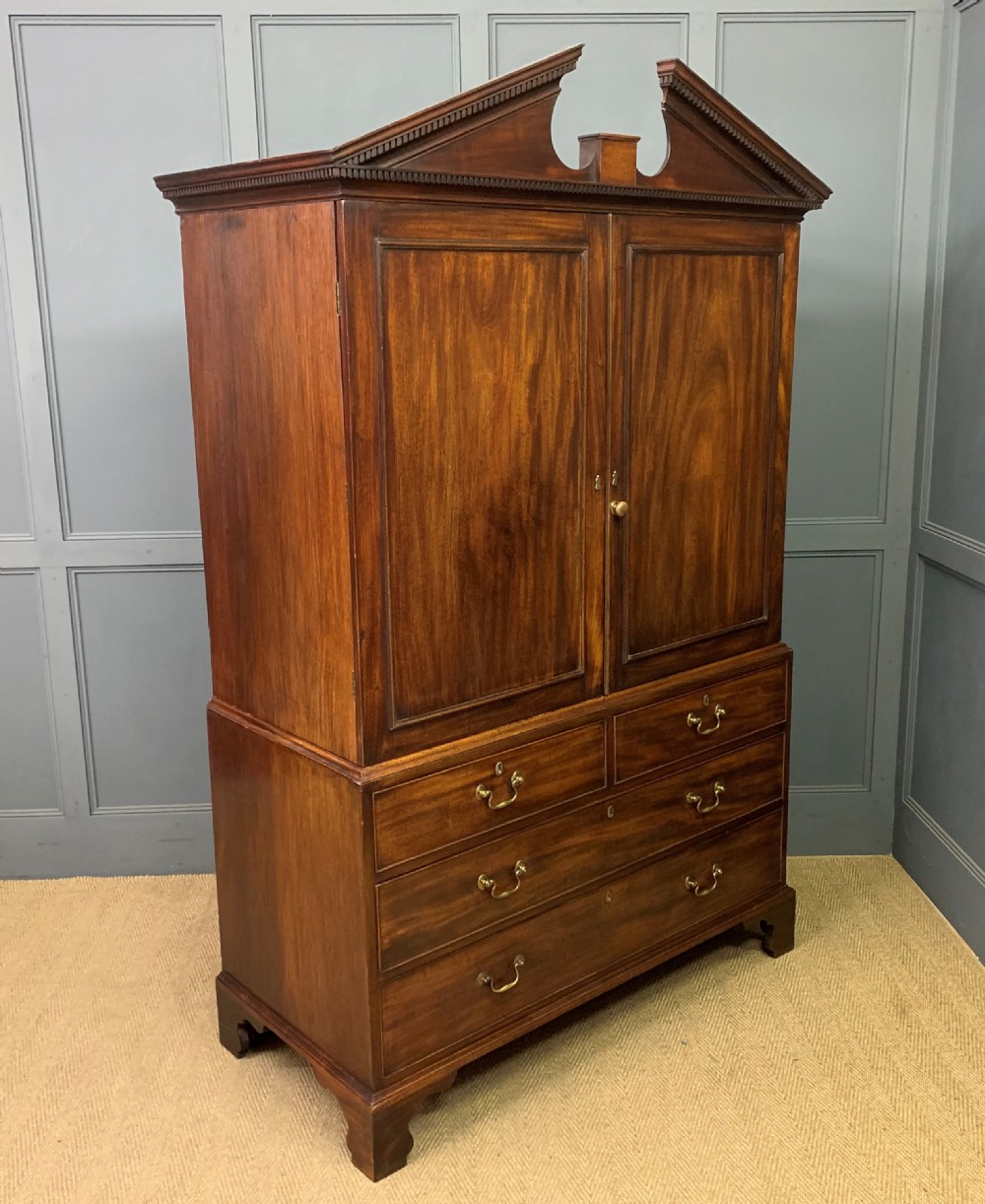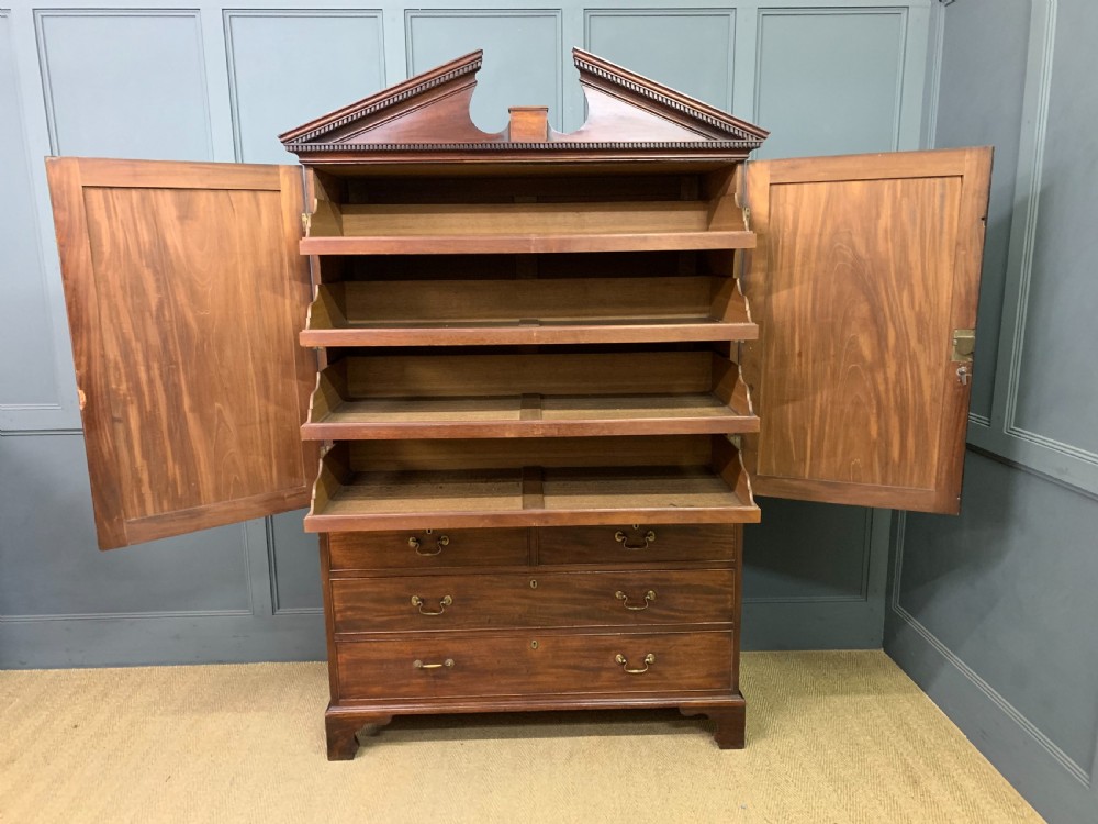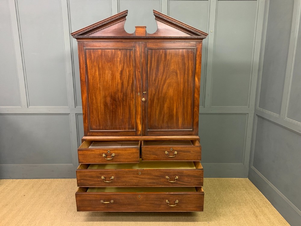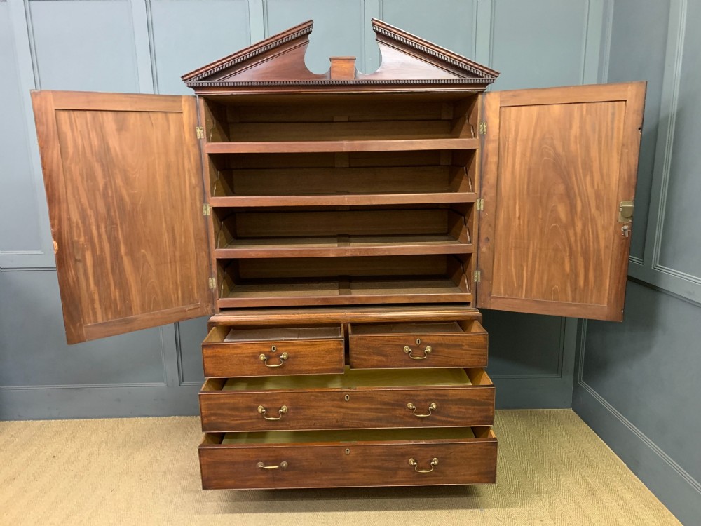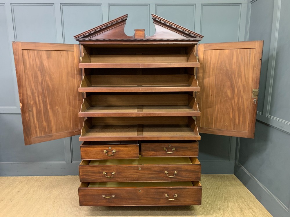 A wonderful George III period mahogany linen press. Of excellent construction in solid mahogany with wonderful figuring. The top section with a pair of cupboard doors which open to reveal an interior fitted with original pull-out trays. The base section with an arrangement of 2 short over 2 long drawers, all fitted with their original solid brass handles. The whole piece surmounted by a bold architectural broken-arch pediment. Offered for sale in excellent condition with a warm colour and rich patina. Splits into sections for ease of installation.