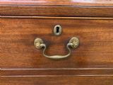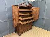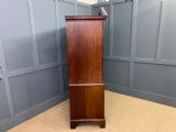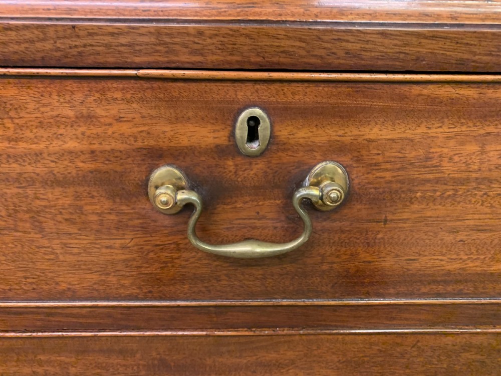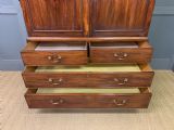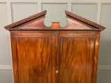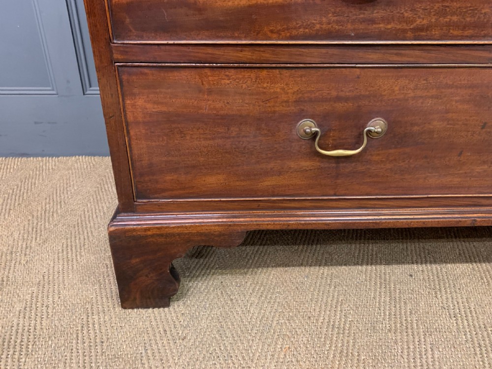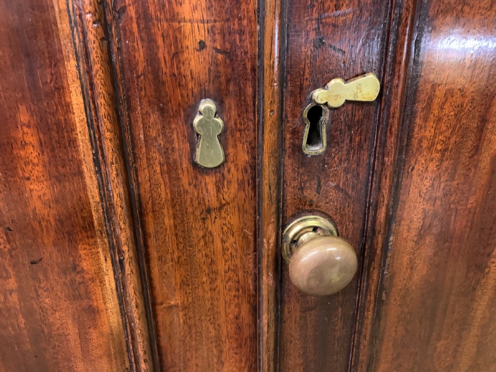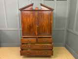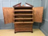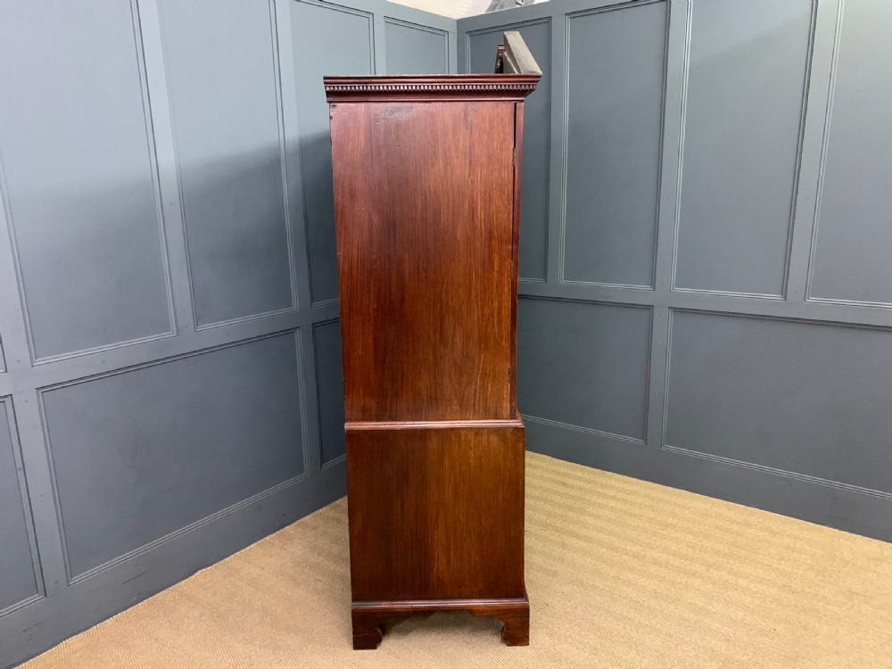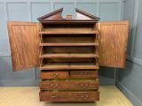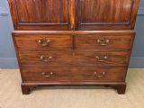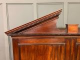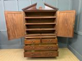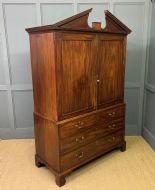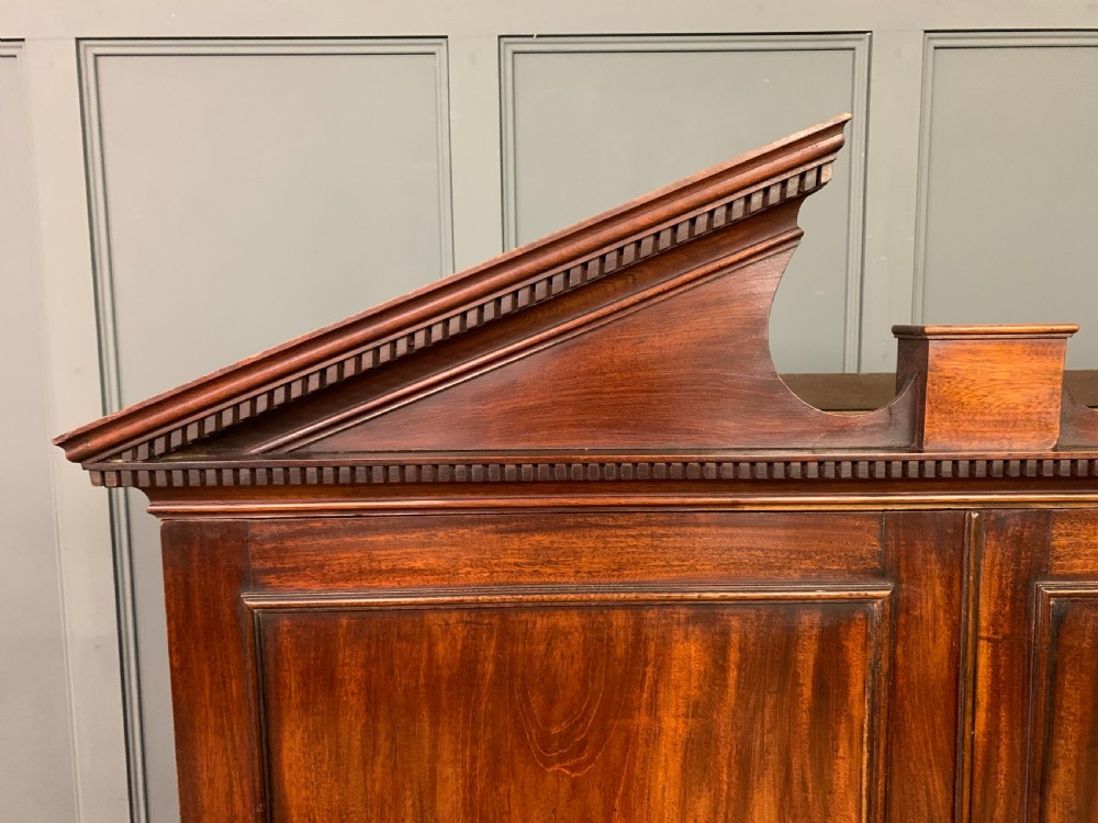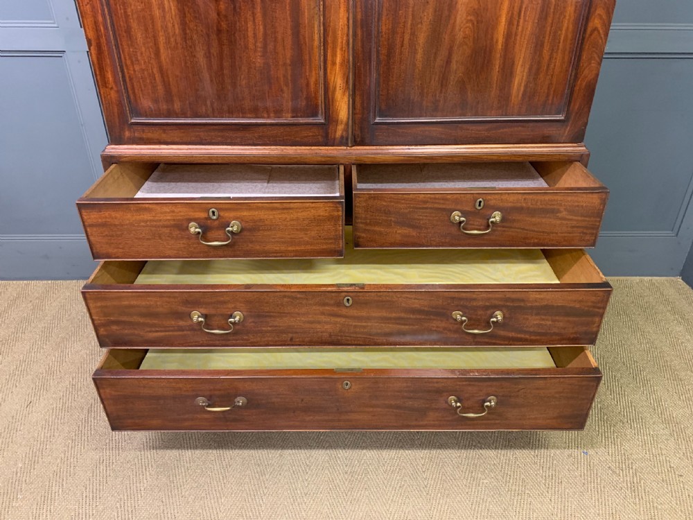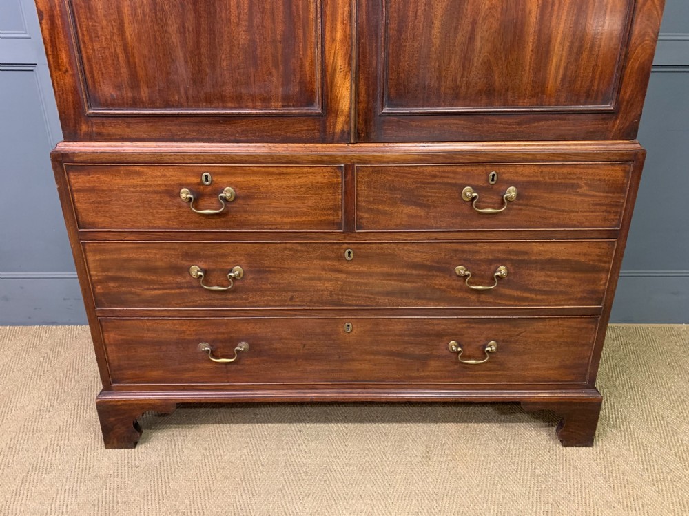 A wonderful George III period mahogany linen press. Of excellent construction in solid mahogany with wonderful figuring. The top section with a pair of cupboard doors which open to reveal an interior fitted with original pull-out trays. The base section with an arrangement of 2 short over 2 long drawers, all fitted with their original solid brass handles. The whole piece surmounted by a bold architectural broken-arch pediment. Offered for sale in excellent condition with a warm colour and rich patina. Splits into sections for ease of installation.